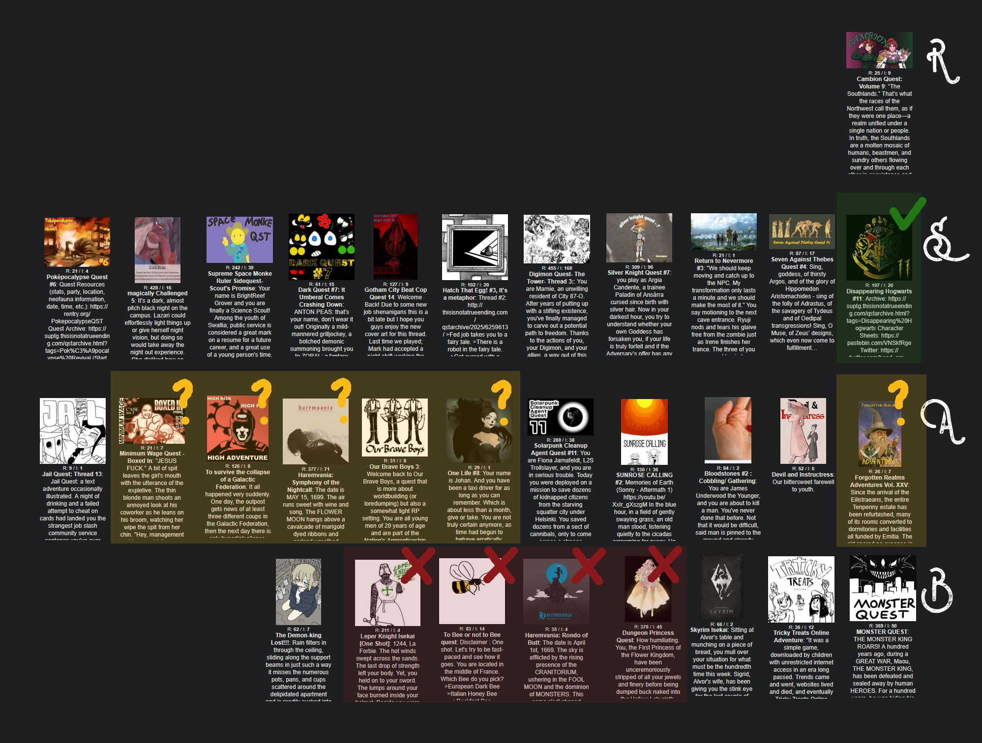 Speaking of my stint as Best man, I'm back, and so too is Cambion Quest!>>6309295>>6309295>>6309295Attached are a list of other quests I'd recommend. An S-rank means I'd unequivocally recommend it.An A means I strongly recommend it but it perhaps has some caveats (tonal or structural issues, community is rancorous, update schedule is slow, or it's a bit niche or lulzy even for /qst/) though I still thoroughly enjoy it.B means it's either so new it may well flake, already seems to have maybe flaked, or the QM straight up officially ended it, but I still played and liked it.>Whatcha playan, /qst/ies?