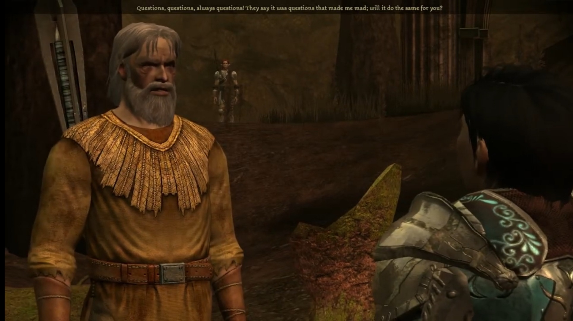 >>6332161>>6332176Random weird idea I had, as you know I am very intrigued by the unconventional character attribute rpgs, including minimal 1 or 2 stat rpgs (inspired by the Ron Edwards Sorcerer or Trollbabe style games).I wonder if you could run a ttrpg game with just ONE character sheet attribute, MORAL PURPOSE or Purpose itself as an attribute? The magnitude of this PURPOSE stat might literally be the number of quests / tasks / undertakings your character has sworn to fulfil. Think of all those nested quests within quests subquests you get in Fallout New Vegas or Dragon Age etc (to enter the werewolf lair, you must pass the forest mist... to pass the forest mist, retrieve the Elder Oak acorn from the Mad Hermit... etc)And interestingly, if your PURPOSE ever reaches zero, ie all accepted quests / tasks fulfilled, your character world agency "dies" and reverts back to an NPC. So maybe this creates an interesting dilemma, what if your character is incentivised to perpetuate or perversely overcomplicate a simple situation, to never resolve it, or even worsen it further, in order to "stay alive" and imbue their own destiny with PURPOSE and HEROIC MEANING...??Pic related is the Mad Hermit from the Brecilian Forest in Dragon Age Origins. I don't remember what I did in my original xbox 360 playthrough back in the day, but this time round replaying the game, I immediately recognised the genius of this rpg encounter. The Mad Hermit is an NPC who demands you ask him questions just as he responds only with questions about your own character in return - it is a clever inversion of the standard videogame dialogue tree behaviour, where you just endlessly interrogate NPCs for information, bargain buy sell items or romance - here is an NPC who does the same to you, and treats you like an NPC! You can of course just kill him and loot his corpse