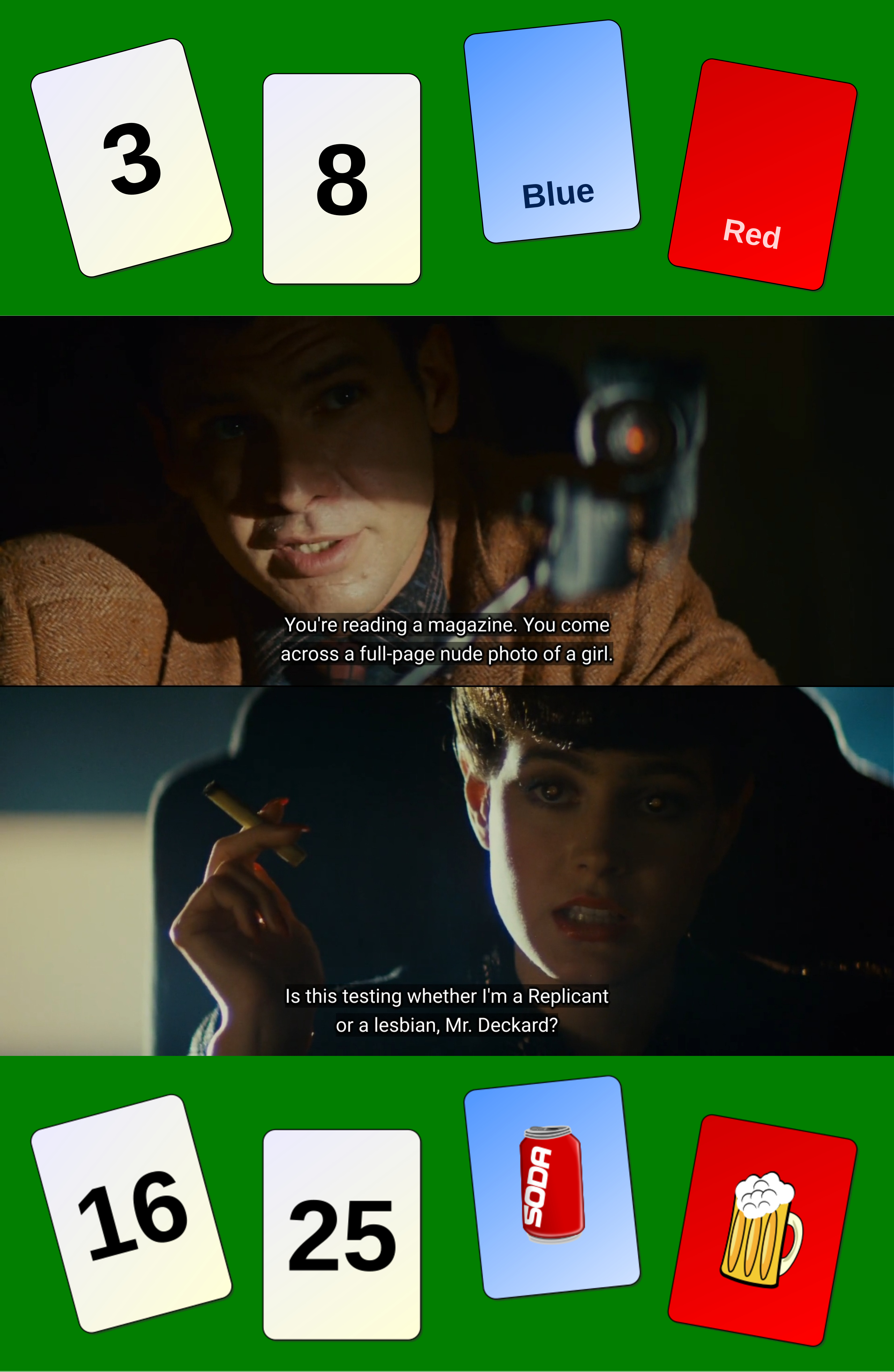 >>6313811>>6317060>on FIENDISH PUZZLESConsider this puzzle (top image)-four cards, each with a number on one side, a colour on the opposite side-the visible card faces are: 3, 8, blue, red-what cards do you have to turn over to test the proposition that a card with an even number on one face, has the colour blue on the other face?(If you need an incentive, just imagine this is a VOIGHT-KAMPFF TEST and if you get it wrong, you will be EXECUTED AS A ROBOTIC machine replicant cyborg MPOSTOR CONSCIOUSNESS!! Oh no!!! Or maybe Harrison Ford will insinuate that you are a lesbian or whatever)Fewer than 10% of experimental study participants get this one, I got it wrong too lol I am so retardedHowever, now look at the bottom version of this exact same puzzle:-four cards, each with a number on one side, a colour/item on the opposite side-the visible card faces are: 16, 25, blue (soda soft drink) red (beer)-which cards must be turned over to test the proposition, "If you are drinking alcohol, then you must be over 18?"And suddenly the logic puzzle becomes very easy lol. This is known as the Wason Test, it is a fiendish puzzle that demonstrates that logical reasoning does not seem to really matter?? if the problem is reframed into socially enforced or culturally familiar contexts. And generally, most studies also conclude that once the answer is explained, participants do not have any difficulty understanding or accepting what appears at first to be the unfamiliar logical entanglements of the reasoning and rationalePerhaps the conclusion for dungeonmasters and their fiendish puzzles is dependent entirely upon the contextual framing and the descriptions and situations themselvesI was going to incorporate this fiendish puzzle into one of my games with a tarot framework etc, then I decided not to do it lol, I had to resist this temptation so hard lol but I myself am usually too retarded to solve these hehe