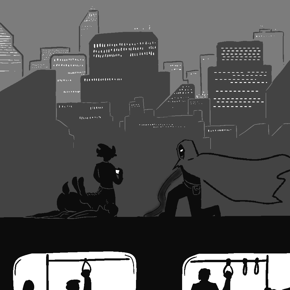Before you leave the thoroughly infested store, you pause to grab the MORE GACHA poster off the wall. While your goal is to destroy all videogames (especially gacha), it still wouldn't hurt to have this to.. remind you of the enemy, yes! And massive anime titties, that helps too. But while trying to fit the poster into your battered SHELL, you realize that the box simply won't do anymore. Thus, you venture on a little shopping trip. And while you find several shells with various gimmicks, the simplicity of THE BOX really appeals to you, so you quickly settle for a large safe you found in the back of the jewelry store. After transferring your possessions (rebar and a gacha poster) you properly contaminate your new shell for a while, making it a part of you. The heft of the new SHELL takes some getting used to, but you manage and prepare to leave the mall, as the commotion in the middle draws your attention. A sharp-looking guy with round glasses, combat gear, and ghostly tentacles sprouting from his back pushes out a handcuffed and gagged monster girl(?) out of the manga store towards the black van parked just outside. Neither of them seem harmed. For a moment you consider a daring rescue, but fate says "fuck you" immediately, as an ice platform floats in through the ruined skylight, carrying three more heroes, seemingly elementalists. That bitch Breeze must have snitched on you! The girl who is 2/3 on fire waves enthusiastically to the hero below.– Heeey! Hey Glocktopus! Hiiiii! Have you seen a spore monster around?Gloctopus raises his head and gives a friendly-ish wave in return. – "Nah, I got a wannabe hypnotist here" he opens the van doors and shoves the monster inside. "Hey, do you guys know what's with the new "capture if they surrender" directive?"Fire girl opens her mouth to continue chatting, but the man with his head encased in a block of ice interrupts her by pointing his hand at the GameStart store.– It was here for a while. One of the shops seems overgrown.His voice is deep and calm, apparently unhindered by all the ice around his head.– Oh it is! Well, I could just burn it all right now! I'm real good at it!– Will it take long?– A bit, but you can leave me here, I'll handle the infestation!– No. Start purging, we'll keep watch. This has everyone stretched thin, but acting alone is too dangerous.Fire head starts replying, but you don't stay to watch the heroes figure it out. Quietly, you tiptoe your way out of the mall and into the cool night air. You don't even make it two blocks before you are interrupted.