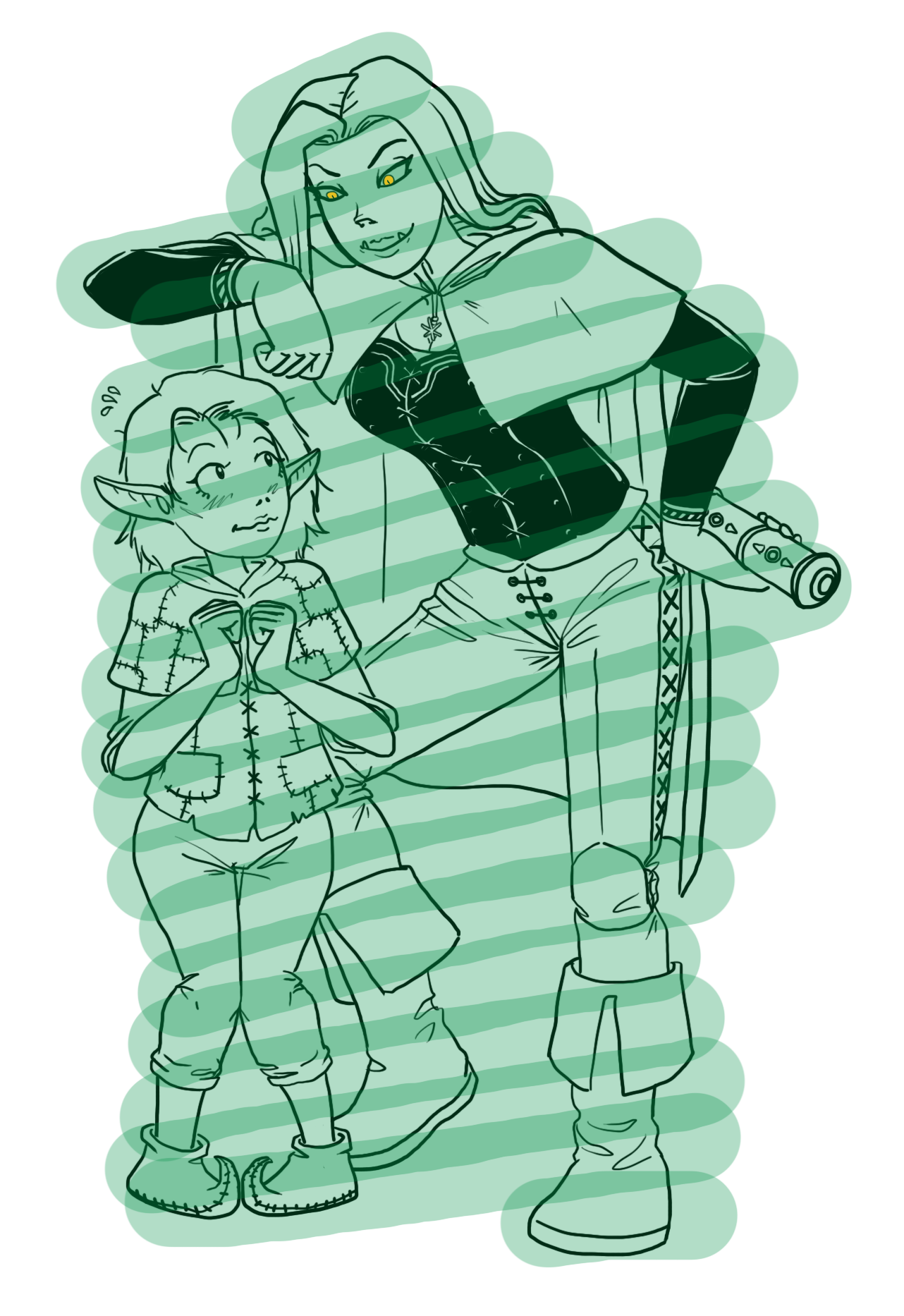 …You are Carazzi Yosef, the purified and perfected shadow of a transformed ex-gobliness. About six or seven years ago now, a mage pal of yours separated you into two parts: Zith-Zi, the real and original ‘you’, became a pretty pink ‘nilbog’, while you embodied the ugliest aspects which she had abandoned. You were ‘born’ a deformed freak, greener and wartier than even other goblins, with a burning heart of Hellfire that drove you to lust, wrath, envy, and instability.You were—are—a cambion, the secret spawn of a half-reptilian, half-human occultist’s demon-fueled gender-bending tryst with Mama Yen-Zi decades ago. Only with the help of your friends and family did you go on the long and winding journey which led you down from New Goblintown and to the far-flung Orient—the Eastlands—where you and your sister built a strange little found-family of freaks and weirdos, seized control of an ancient dungeon and its aeons-old forge, and found a way to use it to remake you into a transcendent being.For the first time in your short life as an independent being, you have known peace.But now, that peace is broken—shattered as the black-glass interface of your dungeon’s magical bio-spiritual ‘forge’ following your failed attempt to use it to bring back the dead. You meant well—really!—but sometimes good intentions and the whisperings of the Dark Gods aren’t enough, you suppose.You did your best to make it right, using astral projection and the Akashic Record to locate your old demon-buddy Maladoo and his gaggle of teenage companions. While ZZ was off solving some sort of medical mystery in a Far Eastern court, you and some of the reawakened proto-Dwarven goblins who built this place worked with your fellow occult apprentice and reforged monster Dura of Steelwood—now a pretty pink ‘porc’—to repair what the botched resurrection had wrecked. When the members of Maladoo’s gang arrived, Frederich Johannes and Vel Dinh proved most adept assistants, with cost-saving connections and useful skills to bring to bear.