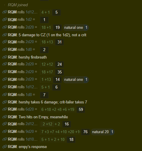 >>6342587“Where’d we meet him, Mama?”You’d asked because you had never known a time without his feathered body curling up to you each night, sharing his dragonfire-warmth on cold dirt-plains nights beneath the great empty sky. By day, you’d watch him soar those skies—you were doing so then, when you’d asked Mama Zi the question.“He was… He belonged to yer father,” Mama Zi—Yen-Zi was her actual name—had said.You’d been astonished to hear this, not least because, in spite of your pestering, this was the first time your mother had ever spoken of your father. HA! Your ‘father’.“He—HIS name was Zithra,” Mama Zi told you. “He was… Half-human.”“Half human?” you’d asked. “Half that and half WHAT?”“You know, I was never really sure,” Mama Zi had admitted, looking wistful.“But what’d he LOOK like, Mama?”“He… He looked like someone special. Right from the first time I ran into him.” She’s snorted, unable to hide a smile and a blush, much as she’d have rather. “He always did, too. No matter what else he looked like. And he looked like TROUBLE—which was true, too, believe you fuckin’ ME. Ooooh, Zithra—if that even WAS your real name!”Hershy had swooped down with a curious croak, wondering what all the hubbub was about—Mama Zi’s voice had gotten pretty loud toward the end. The chimera-drake alighted upon you, though, to your squealing delight. He realized too late his mistake, but as you grabbed him by his squishy midsection and began to play with his wings, the fire-breathing superpredator-in-miniature has simply whined and let you do you thing. Mama Yen-Zi looked down on that, at grudging tolerance and childlike glee. With the benefit of hindsight, you realize now that you and your pet were all she had left of Zithra—Irinnile’s host, anonymous Reptilian Infiltrator, and the woman whom your mother had loved, and missed, and named you—named Zith-Zi—for.Your ‘father’ had left, and Yen-Zi could never say where or why, or if he’d ever returned. Hawksong had driven her out while you were still in her belly, after all. But if Zithra had left her, Hershy stayed with her, and so did you… And so, too, has Hershy always been by your side, since the day your mother died, and you two remnant-reminders, without anyone to remind any more, were on your own.Hershy uses firebreath! Rolls an 18 and does 2 damage each to three of the gnolls at the front of the pack.