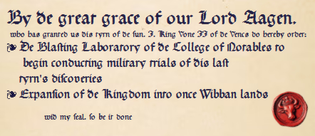 His health has been waning for some time, and though he kept himself active marching with his armies and riding in the saddle unto the last, the governance of the realm had long been delegated unto others; so this is neither a shock nor an unexpected event. But with the dawning of the new age, the death of His Majesty King Guyard the second in the Orcmanie; breaker of the Neverlord and saviour of Sturnes, is finally recorded upon the velum of the Rexen records and proclaimed with great sorrow unto the world by the song of the Troubadours.
