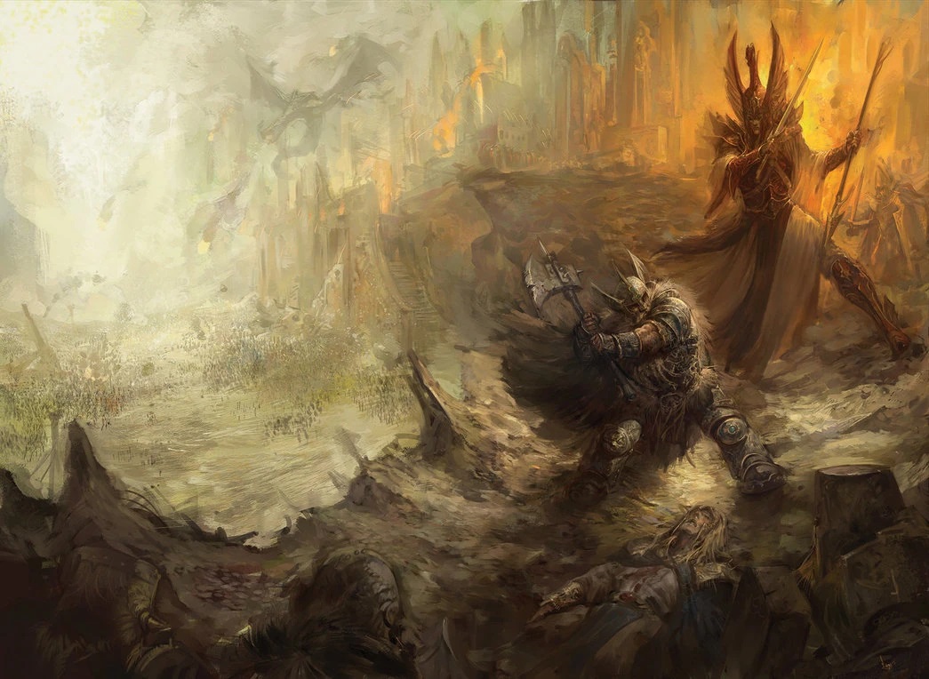 A Mace. Once a simple thing, a practical weapon, well-crafted by a prominent Orcman smith. Taken up by a young King, wielded in war; hoisted atop a heap of broken and hewn corpses, and bought down upon the Skull of the Never Lord to shatter it; transforming the young Orcman king into a legend, a hero, a conqueror and a saviour. Again it rose, again it fell; the Nachetar forms shattering and their armies crumbling as the Orcman king led his armies to victory.