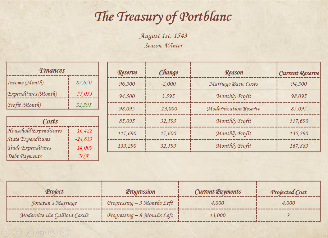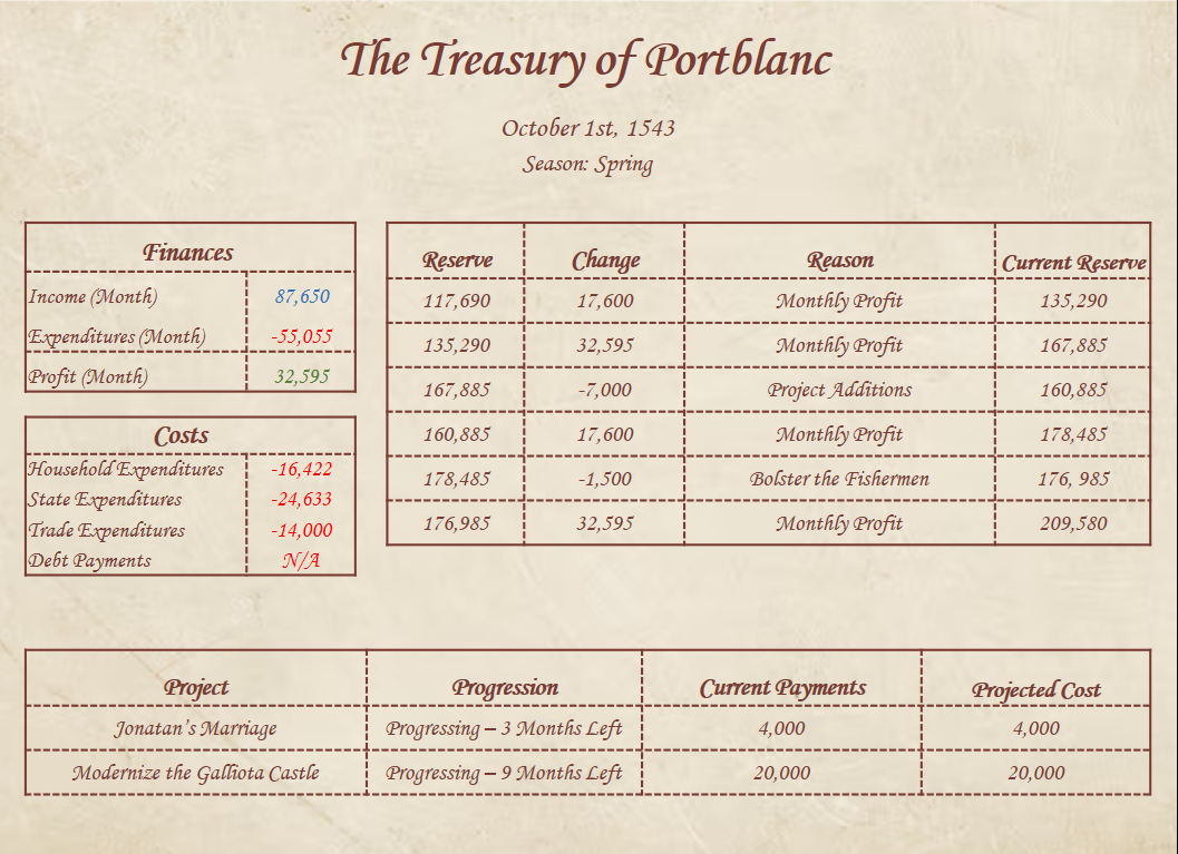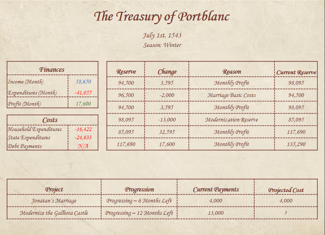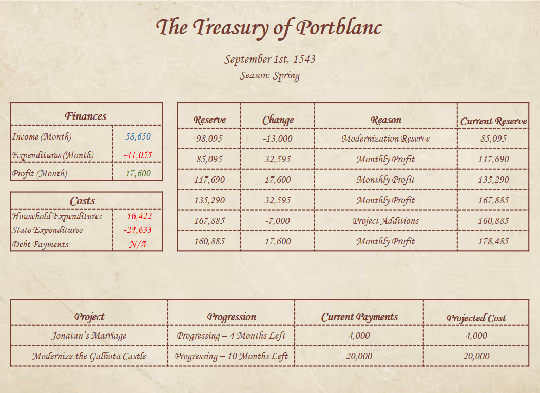 After your short day of repose, you fall once again upon the routine you had developed for this year; awaken, hold court, manage reforms, socialize with the aristocracy, and return to your chambers to sleep. You continue to hold these routines, somewhat consistently, for the next two months. You begin no new projects, nor go out gallavanting on some new hobby; you maintain your routines, and continue to oversee your work as you will. You do not receive any letters of note; not from Prince Carles, not from your fellow noblemen, not even from that Salvatore, whom you had hired to make you an instrument fit for war.