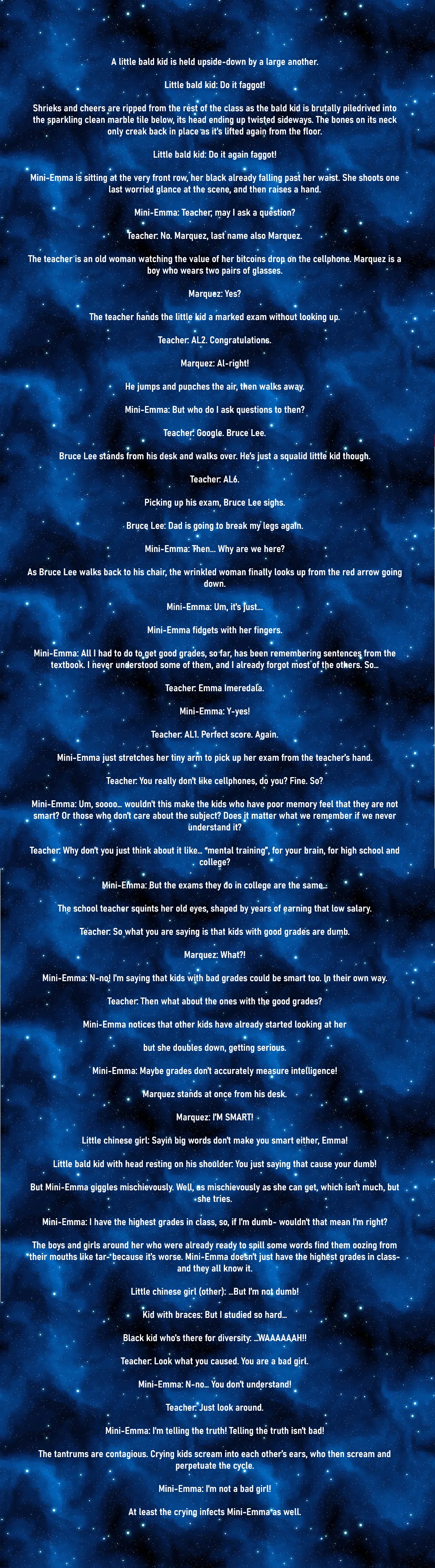 Once upon a time, there was a girl who hated the cold. But like, for real. It wasn't like the cold reminded her of a lost relative or that it was proof that evil in the world could run rampant, that it was simply the nature of the universe to be indifferent. No. She hated the cold a whole fuckbunch and that was it. There was no deeper reason or meaning.And although the human brain works only by association, this is still an exception.The maiden's feet laid bare on the wet grass, as her cheeks were gently caressed by the dry, sharp wind of autumn that wasn't even that cold."Man," she'd say, wise beyond her tender years, "I fucking HATE the cold, dawg.""But the cold is necessary for the long term preservation of food through endothermic reactions," said some girl with black hair and emerald eyes, "or, more simply, for machinery to continue working and producing at a steady pace, without burning out. In fact, many devices have the sole and explicit purpose of lowering the temperature of engines and such, cooler fans on a processor for one. It's even involved in photosynthesis, which is how plants use light energy to convert carbon dioxide and water into glucose and oxygen, which is what we breathe."Quizzically is how the girl who hates the cold tilted her head. She tried to chew on the information, to turn it into something her mind could process.Then she said: "The fuck did you just say?""T-that the cold-""Come here," said the blonde hair, his hair flowing like gold, calmly, walking over. "No, no, come here, get the FUCK over here""TEACHEEER," the girl runs away crying"COME HERE BITCH, LET'S SEE IF THE COLD SAVES YOU," she gently whispered, angry perhaps because the other had freckles. "I'LL LEAVE YOUR BODY COLD JUST HOW YOU LIKE IT. CO-"The girl who hates the cold tripped and fell and grabbed her scratched knee, caressed by the golden threads of tender light slipping through the meaty leaves above."OH MY GOD, IT HURTS SO MUCH. FFFFFUCK", she bellows, clutching her knee.Somebody was laughing. A young ebony girl, her brown hair made in two long braids. But it couldn't have been her who made her slip. She was too far."...The fuck you laughing it? HUH? Bet you like the cold too. Yeaaaaah, you like the cold too, don't ya? Stupid motherfucker, you and your cold. I hope your soup is cold. I hope your shower is cold too."The girl shaked her head. "Nuh!”, she said, “I dun like it.""You don't?""Nu-huh.""Oh.""I dun.""Ok."The girl who hates the cold pondered this deep life lesson deeply."Are you a nigger?"And the ebony girl nodded, smiling with wide white teeth.“Cool, wanna toss rocks at the horses?”“Sure!”And they hopped away holding hands.