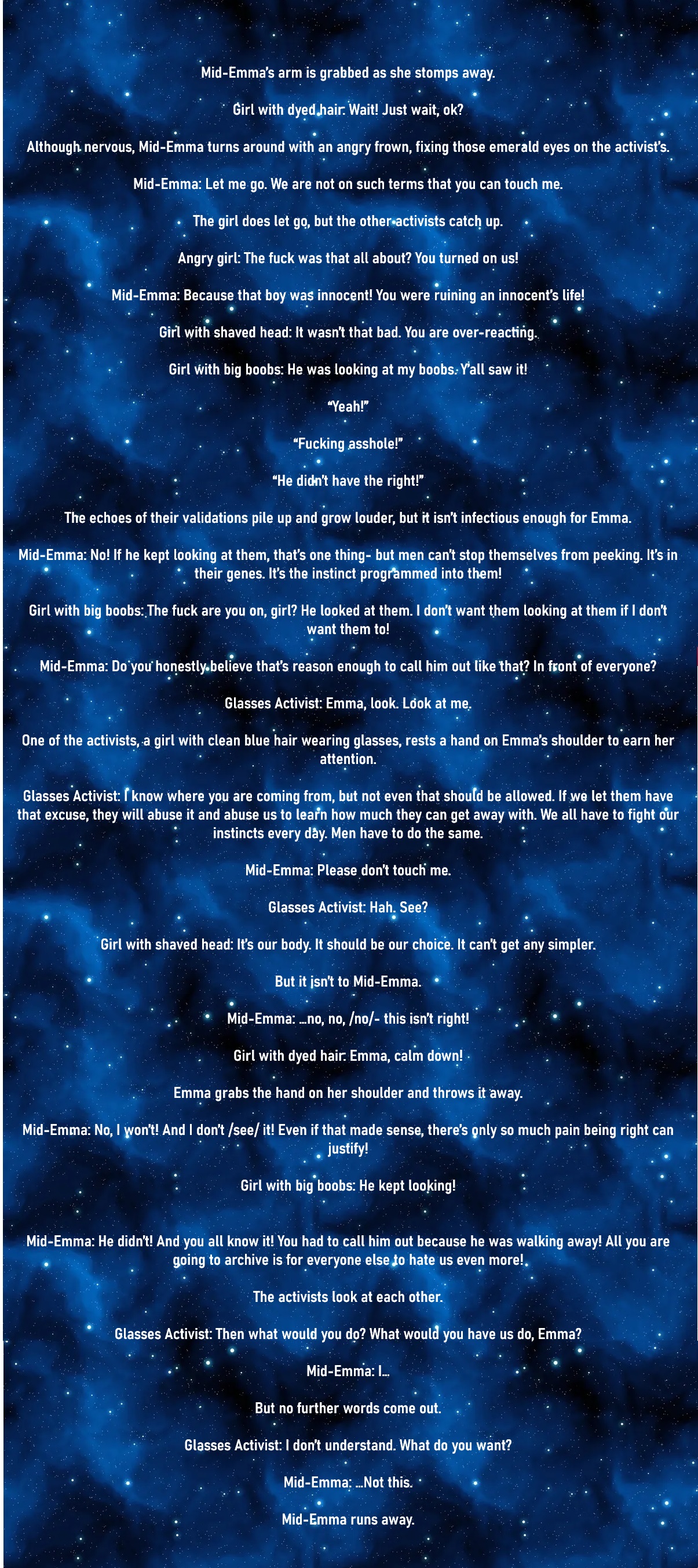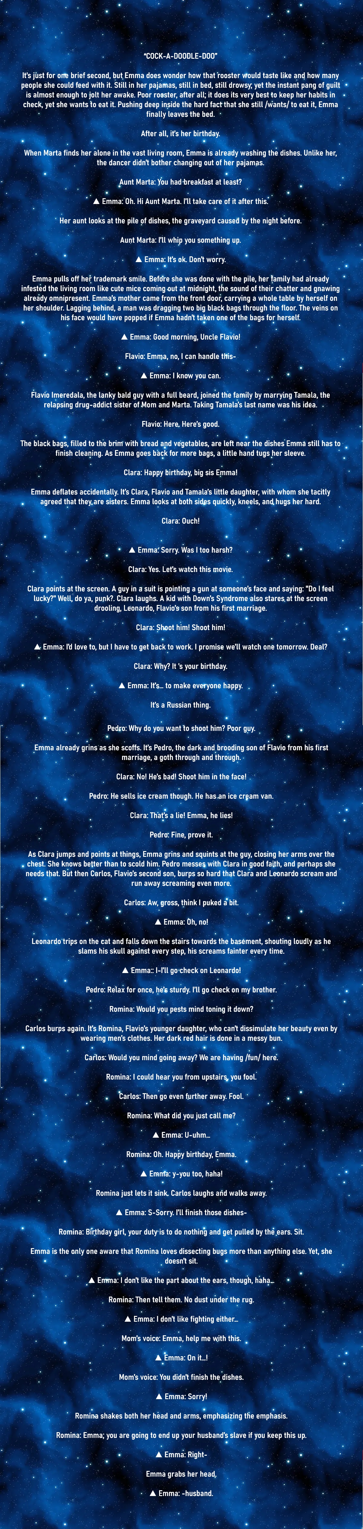 Why! why I can't think of anything else other than commiting mindfuckery! I'm so sad of my pitiful abilities, how am I supposed to keep things precise when actions could be vague>change 3 and 4Mom: That is what's causing problem. We solve this like Imeredalas. We talk it through. No dust under the rug.The wall clock behind her is ticking, loudly, loudly, loudly. Each tick wells up a memory of her friend’s dying faces… and with them, their last wishes for her.▲ Emma: … I like being alone. And when I'm alone, I like reading.The titan's face twists. The magical pills Emma took earlier aren't enough: tears are already leaking from the corner of the emerald eyes, the very same eyes burnt in with her last memory of the loner she loved.▲ Emma: And sometimes, I don't want others to come. I don't want to be invited, either. Sometimes, I want to be ignored and drink tea.Emma sniffs. Emma shivers. The memory of Marcela inspecting her cookies, Camila lecturing her behaviour, and Karuna seeing through everything about herself, right in the room she still lives in, still lingers vividly.▲ Emma: And I don't really like talking that much. It's scary. It drains me.For the sake of living and protecting this family, the other reality she lives in will not escape her mouth. Whatever she considered family in that other reality are stricken with grief and plagued with death. Emma could only live upon the words of her dead friends to remember them. She could not speak about that world to the living here.Mom: That is not true. It's the drugs talking.▲ Emma: And I hate arguing. I hate it. I hate it so much, mother... you wouldn't believe it. What is the point of clearing things up all the time... if I always have to be afraid of sparking another argument?The power Emma has as a member of that reality scares her. The thought that the family here could only maintain its cohesion only because of her magic terrifies her. And right now, she is afraid that whatever she had to go through in that world would be cast upon her family here, right now.Mom: I've been soft on you for too long. That's why you are feeble. It is on mẹ.Emma have to escape. For the sake of protecting this family, for the sake of the dead leading her to find her own answer.▲ Emma: And I'm never... going to have a husband.
