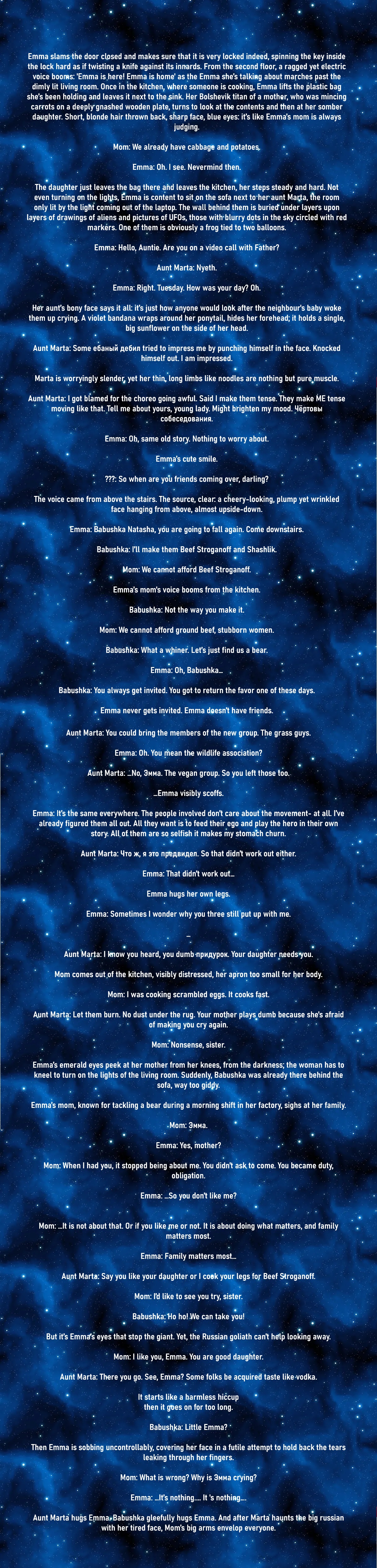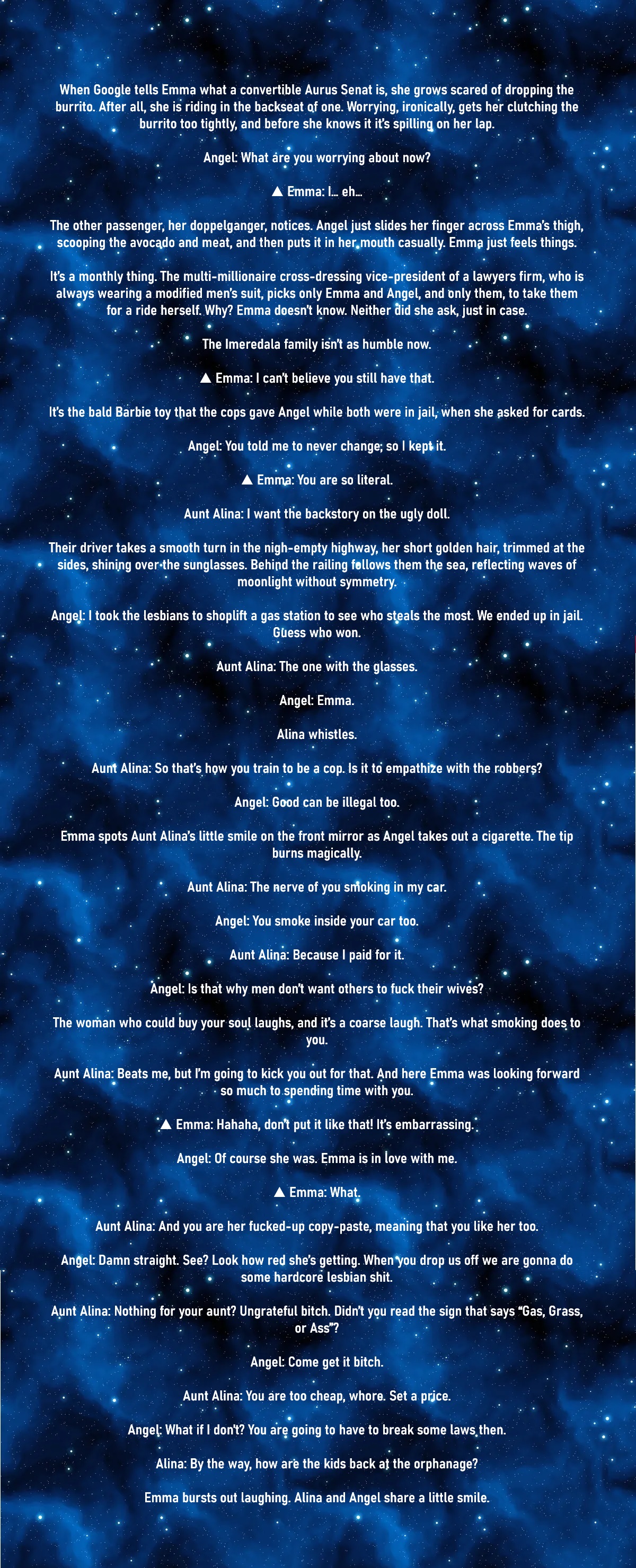 Ellie keeps whispering to her octopus in her own language, likely complaining about how stupid her travelling companions are. Which Inno finds oddly funny, considering that the religion of Teegarden B, as far as she knows from Ellie, preaches the depths of the ocean to be Hell itself. Mindlessly, Inno swallows some smoke from her lit cigarette then coughs, as the three kids behind her slowly fall behind.֍ Sammie: Inno, I’m cold.֍ Fubuka: I’m a bit tired.֍ Ellie: ɎɷɸƱΛЏ…֍ Inno: I didn’t know I was the littlest sister eh! And am even carrying the most weight, four bags total.֍ Sammie: The suitcase only counts as o- you are such a disgusting person.Inno laughs like a lion who had his balls stomped. Then she looks ahead and stops.֍ Inno: You know… I know what will help with that.The tall blonde, almost twice the size of any of them, simply points ahead. And they look. It’s the city, Transit City, pretty like a blazing constellation but still so far ahead. That doesn’t stop Ellie especially from being mesmerized, which Inno notices with glee. Wordlessly, the alien takes the plastic bag from Inno’s left hand, leaves the octopus on the floor, ties the handles to seal it, then places it on her head- as two small white arms emerge from under her pitch black hair to hold it above. The arms, which come from the sides of her head, are so luminescently white that the details of their shape can’t be discerned. Then Ellie just picks up the octopus again and keeps walking towards the little stars, while everyone else stares in awe.֍ Fubuka: ..they shine!֍ Inno: So that’s what those are for.֍ Sammie: Ellie is incredible.The darkness of the forest on the right of the dirt road keeps getting thicker, yet there’s still just enough light to see the fields expanding. A stray house can be seen lost in the vastness, then a stable, a farm, a stray, broken motorcycle forgotten in the middle of nowhere. The background changes slowly, but it does change before the caravan notices.֍ Fubuka: …Teacher, why didn't you want me to use my powers?֍ Inno: Back when the cops got us?Fubuka nods, while Sammie tries to touch one of the white arms.֍ Fubuka: Isn’t my power useful? Am I not good enough yet?֍ Inno: Eeh, nah it's just, they are filthy old men, and, y’know, you are a little girl... I was just having a little mercy on em.Fubuka just nods again, letting the sharp evening breeze play with her long golden hair. Sammie still isn’t daring.֍ Fubuka: I love you, Teacher Inno.֍ Inno: I love you too, Fubuka.֍ Fubuka: ...you won't leave me, right?֍ Inno: Nah. I won’t.֍ Fubuka: Because, if you did... I’d never forgive you, you know?Inno plays with that hair like the wind did.֍ Inno: Don't do that. If you threaten me, then how will you know I’m not only saying I love you causa I’m afraid? Play it smart.֍ Fubuka: Are you afraid?֍ Inno: Not at all. I’d beat your pink ass.