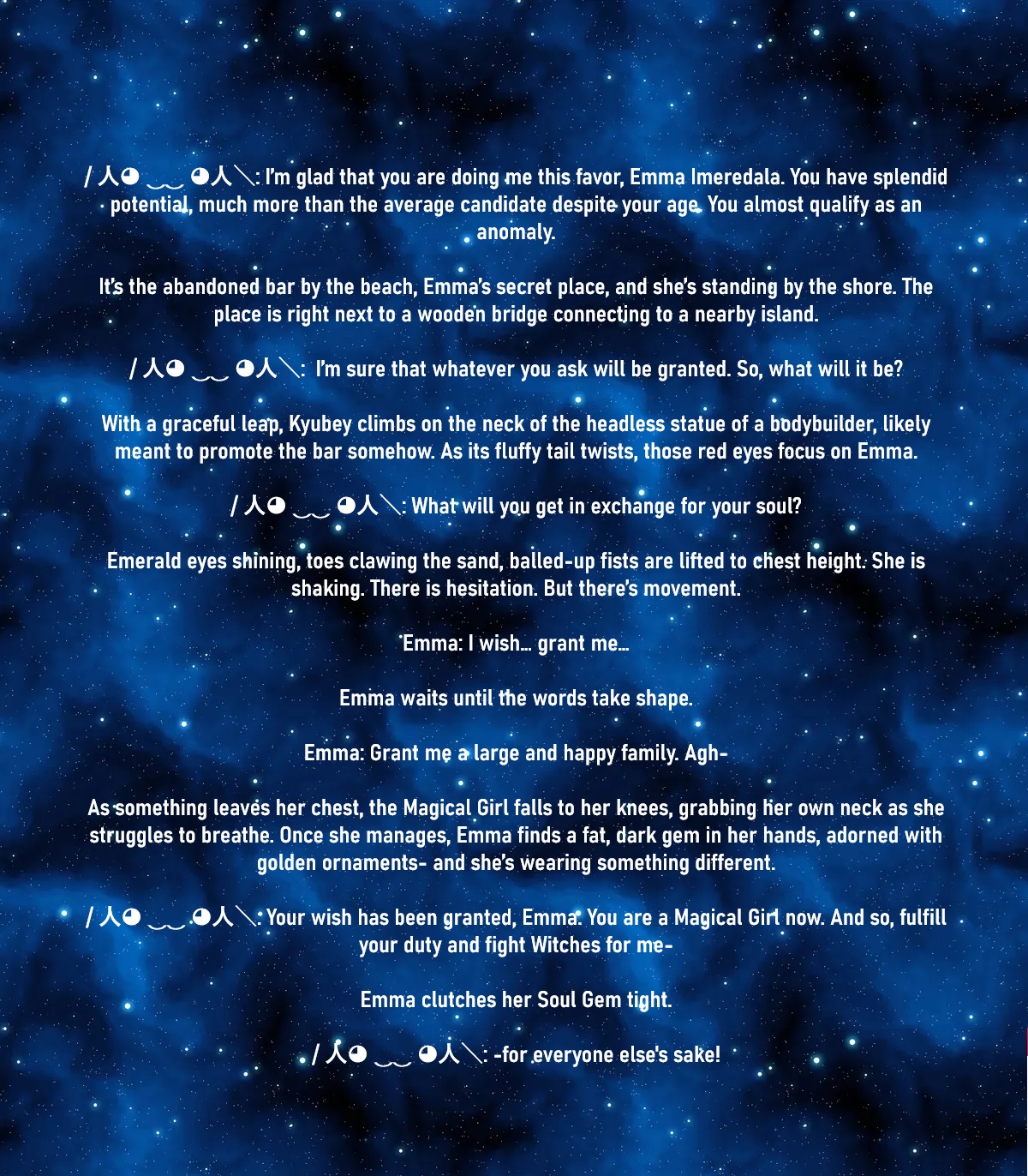 ▲ Emma: Do you think that if I crush this gem I'll die?Icky darkness spirals inside the dark green gem held tightly between her fingers. As if making mocking faces. Maybe that is because she used magic on her family. Maybe her family will feel less sad with her gone.◙ Crow Knight: ... First, why would you want to do that?▲ Emma: The longer I live, the more I'm going to hurt everyone l love.◙ Crow Knight: Ok. Why not join us instead?Emma does her classical smile as she weeps honest tears of sheer pain. Tears that she could hardly shed in front of her family, as she could not make them worry even more for her sake.▲ Emma: Because I miss them. I miss them too much. Yet I keep my distance, so I'm a good person, right?◙ Crow Knight: Oh. Fuck.Emma Imeredala isn't even spared from awkward silences on her deathbed... then she is reminded with what her friends left with her. To not be alone, to have friends supporting each other.▲ Emma: So... what is your organization about?◙ Crow Knight: Eh, it's called the Order of the End. The name sucks. The thing is like, Magical Girls are already dead. And we want to spend our lives to banish Kyubey from the planet so that no more girls ask for more stupid wishes.▲ Emma: That sounds violent. I think I had enough violence already.Emma gazes upon the Navigator of the Seas. There, someone is about to make a friend. There, someone is about to try dancing for the first time. ▲ Emma: Wanna have sex with me?◙ Crow Knight: Say fucking ///what///?Emma walks straight to the Knight, who recoils so hard that trips on its own cool cape. She is trying her best in her current state of mind to follow what the dead told her to. ▲ Emma: If I break this gem... I'm sure it will be the end of me. Nothing will matter. So why not? Why not at least leave someone with a happy memory of me, instead of a bittersweet one?Emma glances at the long pommel on the Knight's waist; it's a longsword. Golden words of a secret language are written all over its sheath, words that, Emma thinks, may be lies as well.◙ Crow Knight: You don't even know what I look like.▲ Emma: I like scars.No sound comes out of the iron mask for a while.>change 5◙ Crow Knight: Look; that's bullshit. You wouldn't be doing something like that just for someone else's sake.