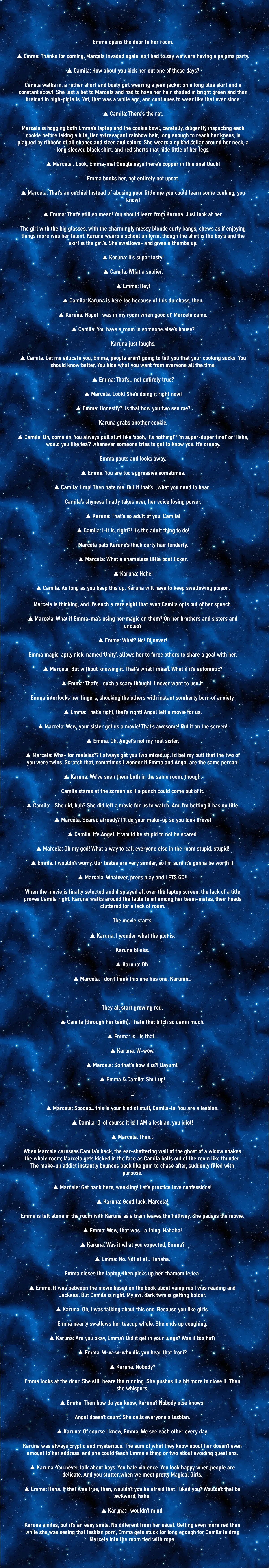 First of all, I would like to say that I do not, nor have I ever (to my recollection) read any story focused on romance, not to mention yuri romance. Anyone who claims I have done otherwise is a dirty liar. Am most, I have watched soap operas and infinite episodic shows as a kid that included romance when I was a kid. And read some stories that included romance as a side plot after. Oh, and I watched a parody redub of twilight, that’s probably my biggest source of knowledge on this.Now, with that in mind.>(preliminary) ACTION (From Buka POV)-Split work, the obvious changes are memory 8, 10, and 11--Ellie seems interested in memory 10, you're NOT touching that one, so you'll start with 8, alongside Sammie-Argue with Sammie what should be changed in change 1, you consider if Marcela should still witch out, Sammie convinces you that maybe Camila hunted her down or something, so you shouldn't touch that part, you are convinced, and let her work--Sammie seeks feedback on her work, you say it's fine, she frets over details and quality, you argue that there is still other important changes to be done, and that this is good enough-(As Buka is not actually doing change 1 herself, the details are not included)-Change 2, now this is a classic, *obviously* they should be split, and Karuna should spend her last breath expressing her love to Emma, ending with a final kiss-Sammie protests, stutters, apparently she can't write it, not a kiss, and nothing else, she doesn't know how, she doesn't get it