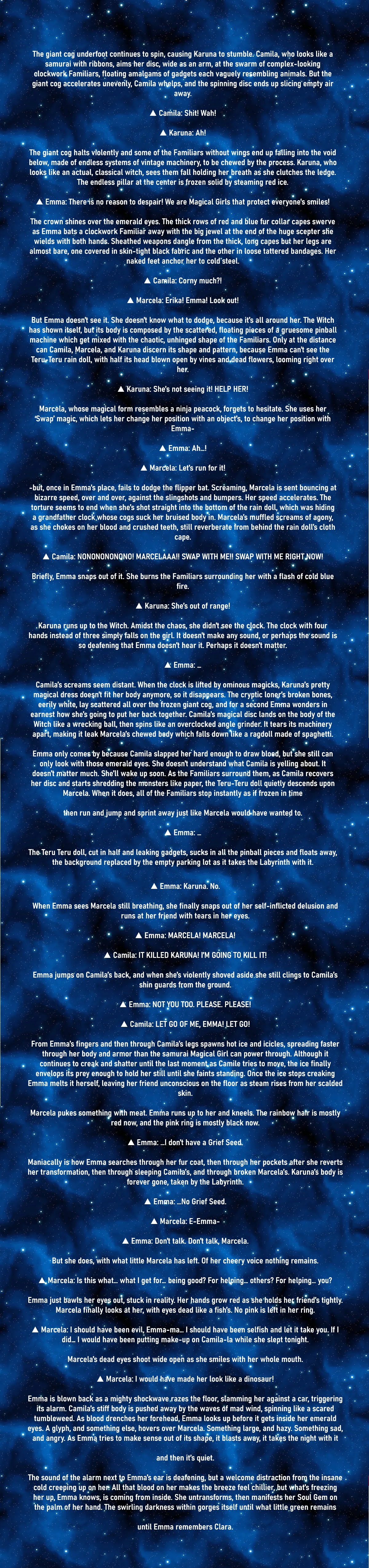 ▲ Karuna: Emma, please, just stay awhile with me...In this moment, the chaos and insanity around them faded into background noise as they look only at each other's existence. Both of Karuna's hands reaches out for Emma's, fingers interlocking with each other, skin lightly brushing on another to assure they are truly together. Seeing the reflection of her own emerald eyes in Karuna's, Emma is simply stunned by the surreal moment presented to her. The hands unlock, though in place of its loneness fingertips flew across the cheeks to the back of the jaw, finding the beat of the other's pulse on a living body, their heads gravitating towards each other until foreheads contact. The palms are slighter cooler, yearning the heat of Emma's cheeks. Then the silence broke.▲ Karuna: Emma, I love you.It was simple words that held grave meanings for what is about to happen.▲ Karuna: Soon I will be gone, so please, you do not deserve to suffer...…Even her hands started to fade, palms no longer living to receive the heat.▲ Karuna: I'm glad I get to spend the rest of my life with you.The eyes, taking in none but Emma, Emma alone, let the eyelids fall down-And those eyes will forever remain closed.▲ Emma: ...No.Emma gets whisked away by the witch. Far away, Karuna had already fade into dust.When she stands on the labyrinth ground again, all that remains is Karuna's gaze in Emma's mind. Camila's magical disc lands on the body of the Witch like a wrecking ball, then spins like an overclocked angle grinder. It tears its machinery apart, making it leak Marcela's chewed body which falls down like a ragdoll made of spaghetti.Emma only comes by because Camila slapped her hard enough to draw blood, but she still can only look with those emerald eyes, still glued to the other pair of eyes that ceased to exist. She doesn't understand what Camila is yelling about. It doesn't matter much. She'll need to see the reality soon. As the Familiars surround them, as Camila recovers her disc and starts shredding the monsters like paper, the Teru-Teru doll quietly descends upon Marcela. When it does, all of the Familiars stop instantly as if frozen in timethen run and jump and sprint away just like Marcela would have wanted to.