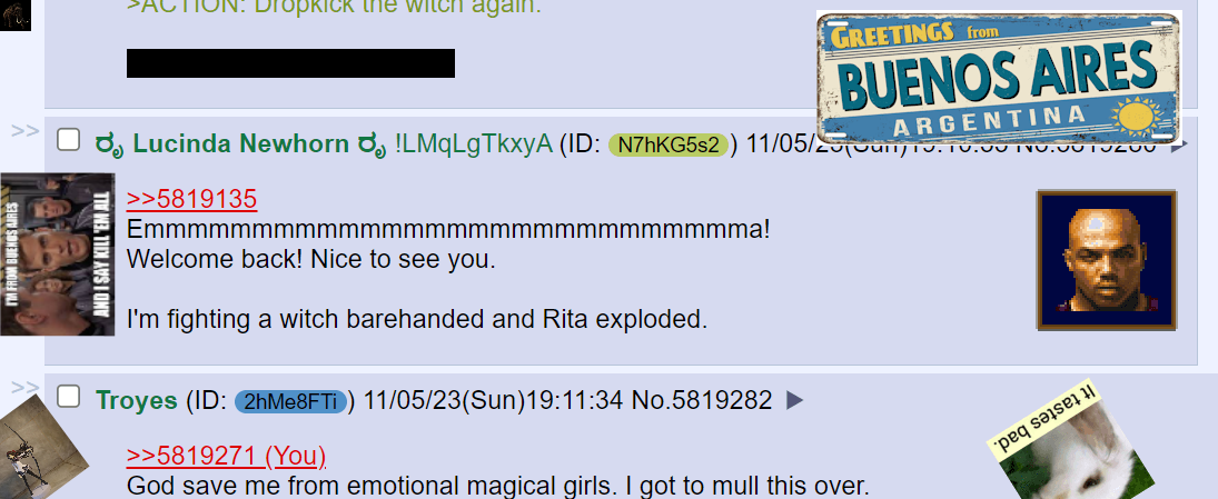 STUFF (you can skip this)◕ A few notes on narrative: Players are the consciousness of their character. Me, on the other hand, am the african american magical lamp peddler in charge of the /subconscious/ of the characters. This means that if for some reason you say ‘fuck it’ and decide to go full yuri menhera on an npc your character /will/ have to roll against the fear of being rejected.Unless it’s Lucinda (but, she ain't here! Isn't she?).Try not to build on top of the assumption that things are going to happen like you think they will: face everything as if poking strange, alien machinery. Red-eyed.To keep with tradition, I'll use "Punching Jimena in the face" to illustrate my point: don't assume that she won't bend her face sideways to avoid it.◕ You can find the mechanics related to chargen in the document attached. Just pause a lot.◕ FAQ:Q: How does this multiplayer quest thing work?A: Pretty much like every other quest or even like every other Dungeons and Dragons campaign, but with more Magical Girls and more bullshit overall. I post something in which a situation is presented. The players of the characters involved come up with an action. We negotiate the rolls involved. The players roll, Lucinda pops some balloons with her scythe, and then I present to you the aftermath. Like in D&D there are stats involved for every type of action, with a few more that come with the setting.Q: Is Osaka ever coming back? Will we ever find out what the fuck was that thing Rin turnet into?A: i dunnoQ: Buenos Aires. Osaka. Mini. I'm so curious about how you gonna drop the quest this time, like totally willing to invest myself in your autism. Your long-term-turbo-loli-fanfics have devolved into just turbo-loli-fanfics with meaningless world building and actions without consequences. Eat shit.A: fuck you bitch ass fuckers asshole ill fuck your mom ass face fucker ill beat your ass motherfucker fuckface fight me 1v1 bthich (in smash bros ultimate because you'll beat my ass otherwise)Q: Last time, it was six months. This time, it was a whole-ass year. Should I just treat this quest as a one-shot and write the end of BA myself? I even forgot the plot.A: hey it ain't easyQ: Will the Mental Condiitons document from BA ever be relevant? Even after all these years?A: yeah you just gotta believe, it aint that hard!Q: Bigguca is coming back.A: why do you think I even write theseQ: What happens if a player drops because life/got bored/etc?A: The character they were playing becomes an NPC until they come back if they ever do.Q: I miss playing with my guca.A: i'm honestly sorry you feel that wayQ: I jack off to megucas.A: Hey, I won't judge; I'm into maids myself, with the exception of Rabi Himuro. But, we don't do that here. Right off the bat, I'll have to disappoint my fellow coomer brethren, since I can't see magical girls like that at all. We do a lot of handholding here though!