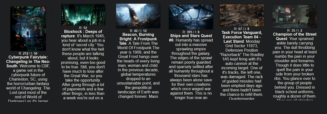 >>6338708>inkyThe fuck, autocorrect? *only>>6338716We do have a lot of ESL anons who seem to enjoy writing in English, and many who I have followed for years have improved over time... So you never know, even on 4chan!>>6338714I eagerly (anxiously, desu) await that Cambion Quest review, lol.>>6338574I'll do a batch this evening or tomorrow, possibly!>>6338681Get well soon, anon. >one shots and short questsI like those, too, but as long as a quest has planned arcs with satisfying resolutions to each where you can kind of jump in or out, and does well wirh recapping or bringing people up to speed, I think that can also work well. At their best, that's what comic books are good at.