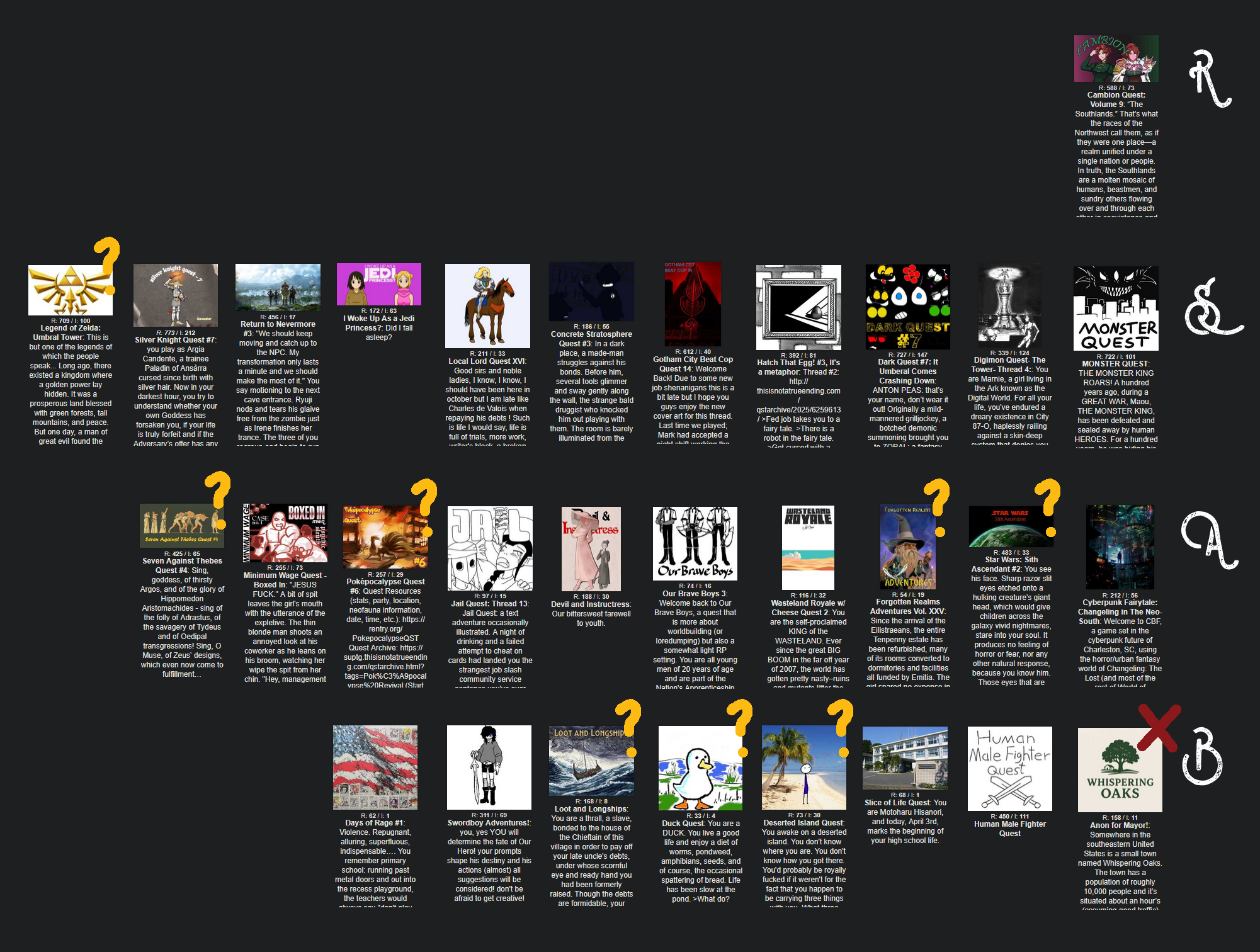 >>6338574>>6338316>Legend of Zelda: Umbral TowerHonestly, DemBones summed it up nicely: formatting and source-fidelity help elevate what would otherwise STILL be a pretty damn good little dungeon-crawler puzzle-solver quest about a young ninja's coming-of-age adventures in the background of a traditional Triforce tussle between LoZ's big three!>Human Male Fighter QuestThis started out fun but a little thin, as a little drawquest romp without a great deal of direction (though don't get me wrong, Dolomite was off to a fine start!) What's made it even more enjoyable, though, has been how it has become more of a true collab or "jam session" sicne then. We had a skeleton fighter, a human bandit, and we're now playing a human druid raised by birds, each drawn and dictated by a different QM's sensibilities and with a distinct vibe in ostensibly the same setting. I'm curious to see if that continues but, conversely, our current protagonist is quite an entertaining one all on his own. I would follow Bird Hermit Quest on its own merits!>Concrete Stratosphere QuestWhile it hoensly didn't grab me in Thread 1, I've warmed up to The Mask (no, not that one) and his adventures fighting crime in the extremely-stratified technocratic caste-organized megacity of Bananas' imaginative sci-fi setting. It has that distinctive BQM flavour where sometimes the narration does a big sidebar about political or economic theory, but it's up to you if that's a feature or a bug. I think it fits pretty well with the superhero genre, which has always been pretty didactic. well hello there Siegel and Schuster, yes, the Great Depression DOES suck. Hello Mister and Missus and sort-of-Missus Marston, what's all this about polyamory and loving submission to gentle female authority? do tell, do tell, how's that working out for you three?>Wasteland Royale w/ Cheese QuestBack after FOUR YEARS holy shit it's KING GIRL, the BIG! This QM's quests are almost always a slam dunk for me, even if I do wish more of them would last longer or fully wrap. As such, I'm of course delighted to see one I assumed long-dead make a comeback. It's got that New Vegas/Mad Max energy, with a desertified future full of mutants and pop culture refuse. It lands more into the comedy than the commentary, has a distinctive blocky artstyle I enjoy... Would recommend, especially if you've liked stuff like Greenhorn or Haremvania in the past.