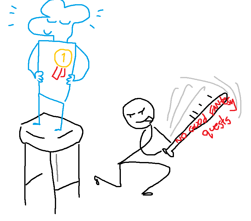 >>6338760>>6338316>Slice of Life QuestI was just saying last QTG that I wished we had more slice of life quests and then, BAM, we got... Slice of Life Quest. How could I NOT play? It's doing a good job of capturing the feel of a slice-of-life school anime so far, but I will say that i generally prefer when such shows or comics have a "hook", like SchizoQM's 'Return to High School' with time travel, or 'My Sister, My Writer' with a QM utterly unfamiliar with the original work and genre taking it over and doing bonkers stuff with ancient Mayan basketball prophecies for a bit. This doesn't have that hook yet, or even especially wacky characters, but I am hopeful that if the QM continues, some such element will emerge or be introduced.>Swordboy Adventures!This fast-updating new quest by a neophyte QM (welcome aboard swordQM!) is essentially what Human male Fighter Quest was pictured as: a classic story about a a young human male fighter, dispatching monsters for money! It's produced with a charmingly-rendered artstyle, short-and-sweet prose, has a cool setting, and features an alcoholic beastwoman.I'm digging it so far!>Big EisekaiSome confused and alarmed rando gets isekai'd into the body of The Emperor of Man sometime before his Imperium really gets off the ground. Our unknown protagonist does NOT know what a Warhammer 40K is, or a psyker or Chaos God or anything else: he just knows he's big, strong, handsome, and everyone around him seems to think he is very important. So far, so fun!>Civilization QuestPretty sure it's dead, but I am a sucker for a civquest with a gonzo premise, like a bunch of feral homeless vampire children dwelling in an eldritch Lovecraftian demon-city. It's a shame it didn't last.>>6338732...I don't think your plan makes sense or is in any way more intuitive than just telling people what percentage of the answers they got right, anon. At least, not to me.