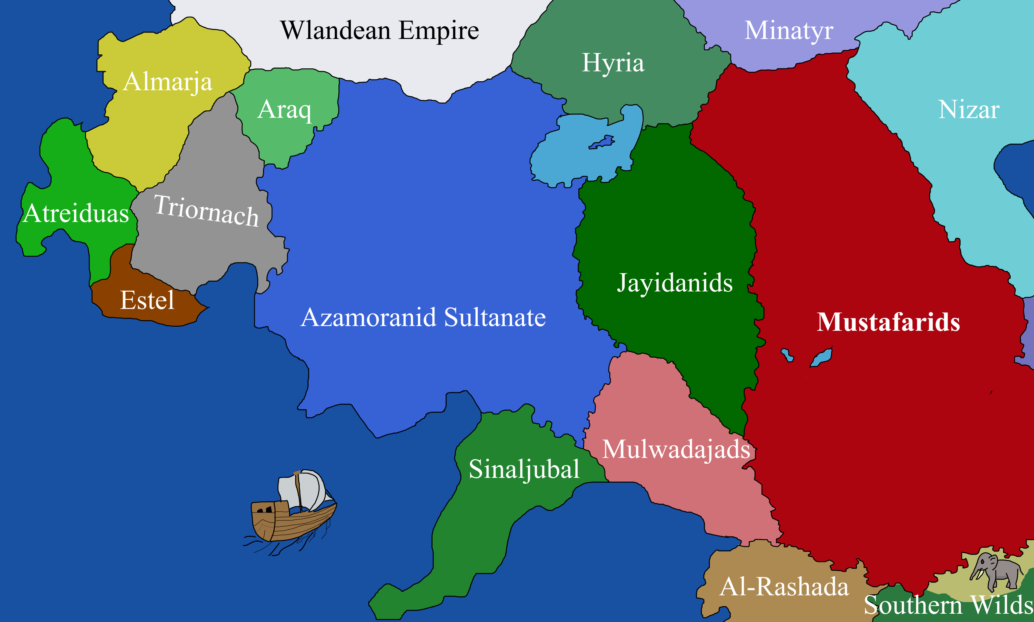 >>6364992Hmm...>Al-RashadaLet's claim some coastland. The exotic beasts and plants should make a fine subject for our magics, and their people are a republic, easily hated by the nobility of our new sultanate. Perhaps the most important thing here is that if there are any doubts, we can claim that the regicide was done by loyalists of Fabas, which wouldn't make sense for any of other lands. While it isn't the largest slice of territory, it should be quick to bring to heel, and is only the first of many.