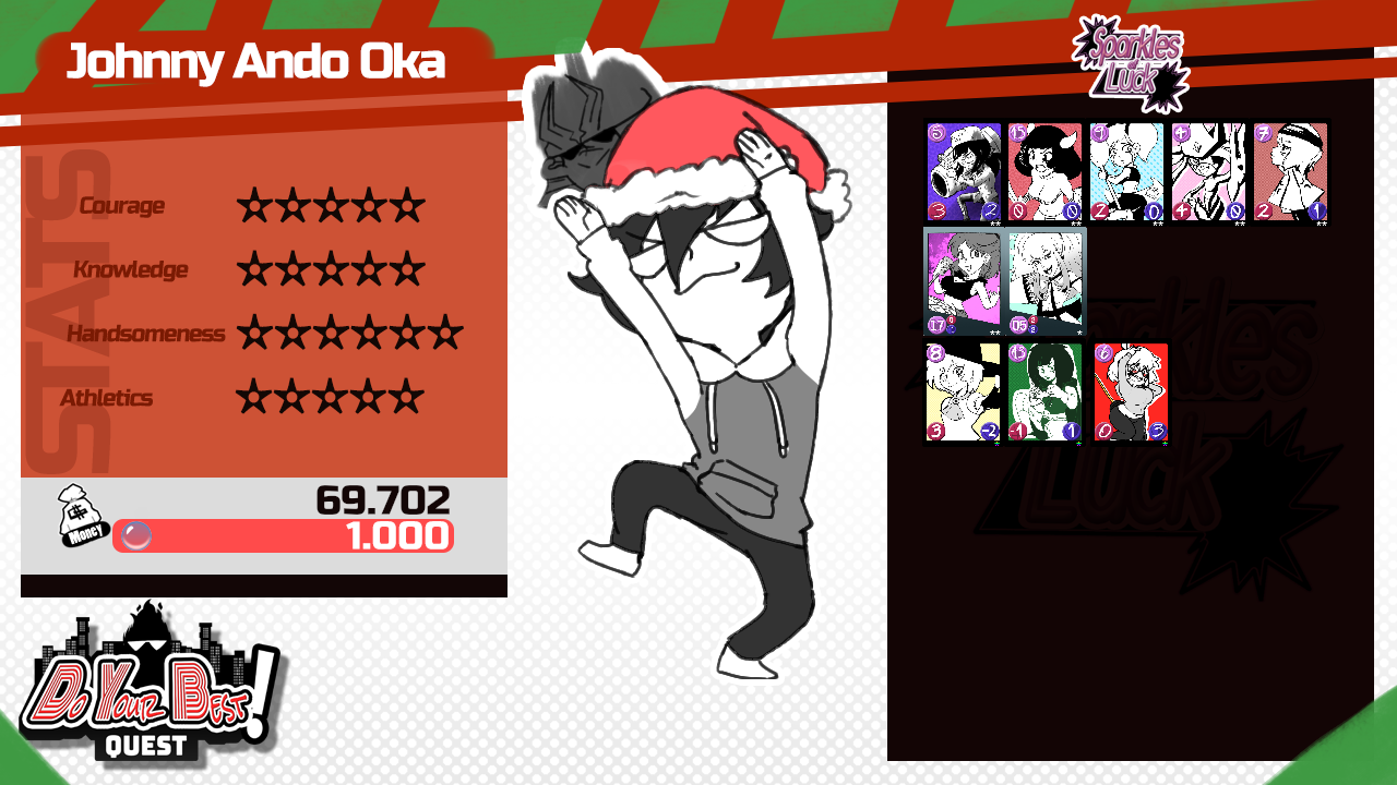 >>6343880Information:Twitter: https://twitter.com/QM91mDiscord: https://discord.gg/4YkJguKcBWArchives: https://suptg.thisisnotatrueending.com/qstarchive.html?searchall=do+your+best+quest(Rough Grammar ‘till half of the 9th Thread) Incomplete Guide: https://docs.google.com/document/d/1-nIx_dvaNCPQ7zLg2BK_ucCyGNM741kAANxqXj7hdDs/edit?usp=sharing Votes: Votes are counted until 25 minutes have passed. This rule doesn't apply to the last reply of the day.Votes that require a dice roll are counted until 15 minutes have passed, so we can speed up the process. Rolls are counted until 10 minutes have passed, so be prepared! (NEW) Dice Mechanic: We always roll 1d100s!Since most people weren’t happy with the system of averaging top four rolls, we’re using best of 2/3/4 depending on the attribute a prompt requires. If Johnny is a genius and it’s a Knowledge based roll, he gets more rolls (Max. 7)! If he sucks, he gets less dice (Min. 2)! When asked for rolls, I will specify how many you’re going to get. Rolling begins after it’s asked. Rolling 100 is a critical! There are no Critical Failures anymore! The difficulty of the roll is tied with the effectiveness of the action. In other words, the harder the option the better the result! Don’t forget that at the end of the day, this is a story-driven quest! What the prompts are describing is more important than the difficulty of the rolls, for results in a fight. Again, rolls are only counted when they are posted within ten minutes of being asked, so watch out!