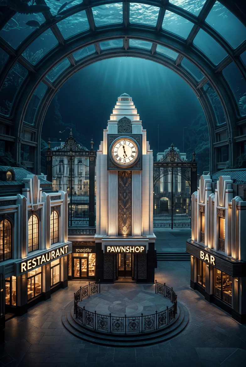 >>6350515>>6350468>>6350404>>6350339>>6350326Guys, sorry for the delay, the holidays are consuming me.extra note , i truly prefer Grok than ChatGPT for the image , i dunno i like them more.--------------------------------------You take a deep breath, settle into the room, put your dresses and belongings in the wardrobe, looking out the window at the city lit up under the sea, the buildings, neon lights, some bathysphere going here and there. This fantastic new world continues to fill you with energy. You remove your make-up to put on something more casual to match your dress, putting on something simpler but still maintaining your style. You see that Ilona is fast asleep in her bed and you leave the flat. The lights in the enormous hallway shine brightly. You explore the penthouse area, with its huge, ornate doors, some with their own security systems and others without. It is still an amazing sight, the detail and beauty of this city. Exploring the buildings, you come across a small square with a clock ticking away in the middle, showing the time as 11:25 p.m., almost midnight. Only four establishments are open at this hour. Which one should you enter?> You see a restaurant that is still open, a ‘diner’ as it is commonly called. From outside, you see a couple of people inside eating. Looking inside, you see a girl with chin-length black hair and a bored expression. You can tell she is the waitress by her uniform. When she realises she is being watched, she smiles at you. You don't know if it is a gesture of kindness or if she is inviting you inside. > A medium-standard bar, you can see a couple of drunkards inside, despite being well dressed and perfectly groomed, but you can tell that many of them have had too much to drink, except for one who is at the bar with his face practically buried in it. Meanwhile, the barman, a large man with a Clark Gable-style moustache, ignores your presence and continues cleaning the glasses. >The third establishment is a pawnshop where you see a fat man trying to look rich, but you can tell that the quality of his clothes is quite low and he wears a ridiculous number of gold rings, which strangely suit his thick fingers.> At the end of the square, you see a metal gate. When you open it, you see that it is a service tunnel. Pipes and machinery can be heard inside, and you can hear an echo at the end of the tunnel. It seems that someone is working at the end of it. >Looking into the distance on the other side of the square, something catches your attention. A tall man who looks like a vagrant is shopping at a Circus of Values machine. He is wearing a bathrobe and slippers, his hair is a mess, and his face looks as if he has not slept in days. You feel a sense of disgust at seeing someone in this state in such a delicate place.