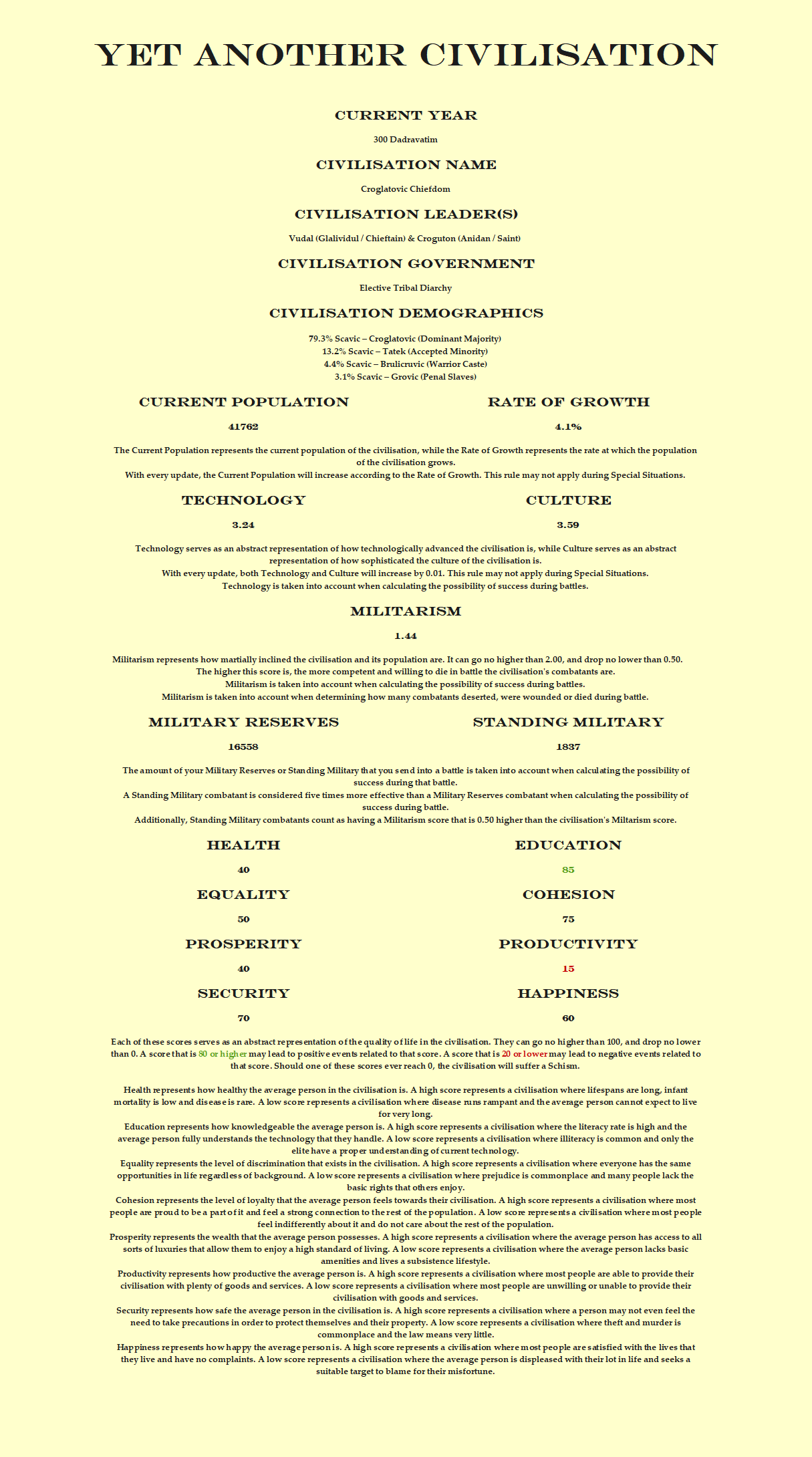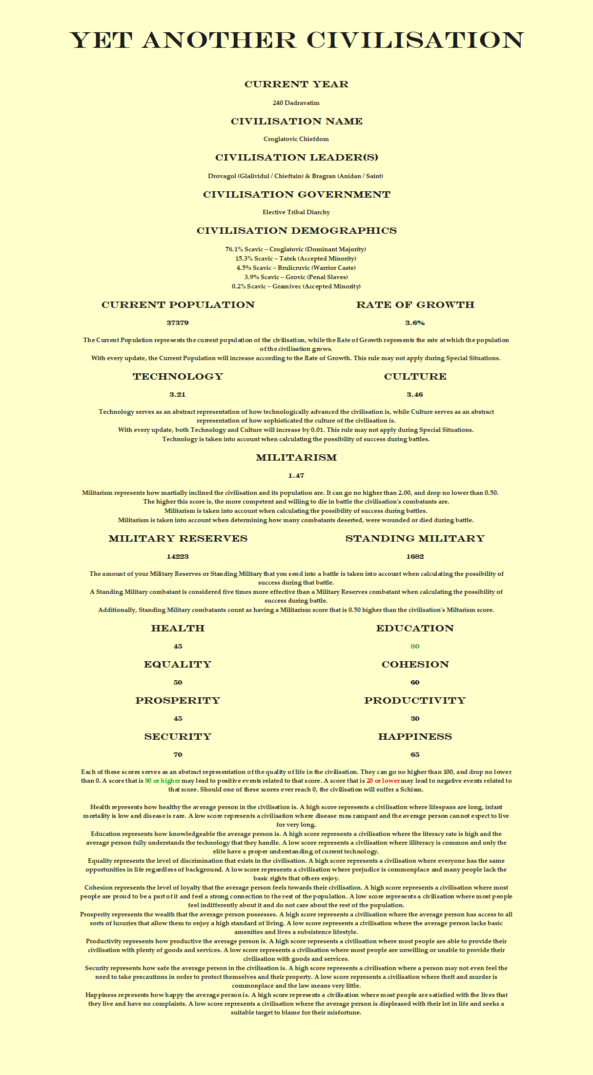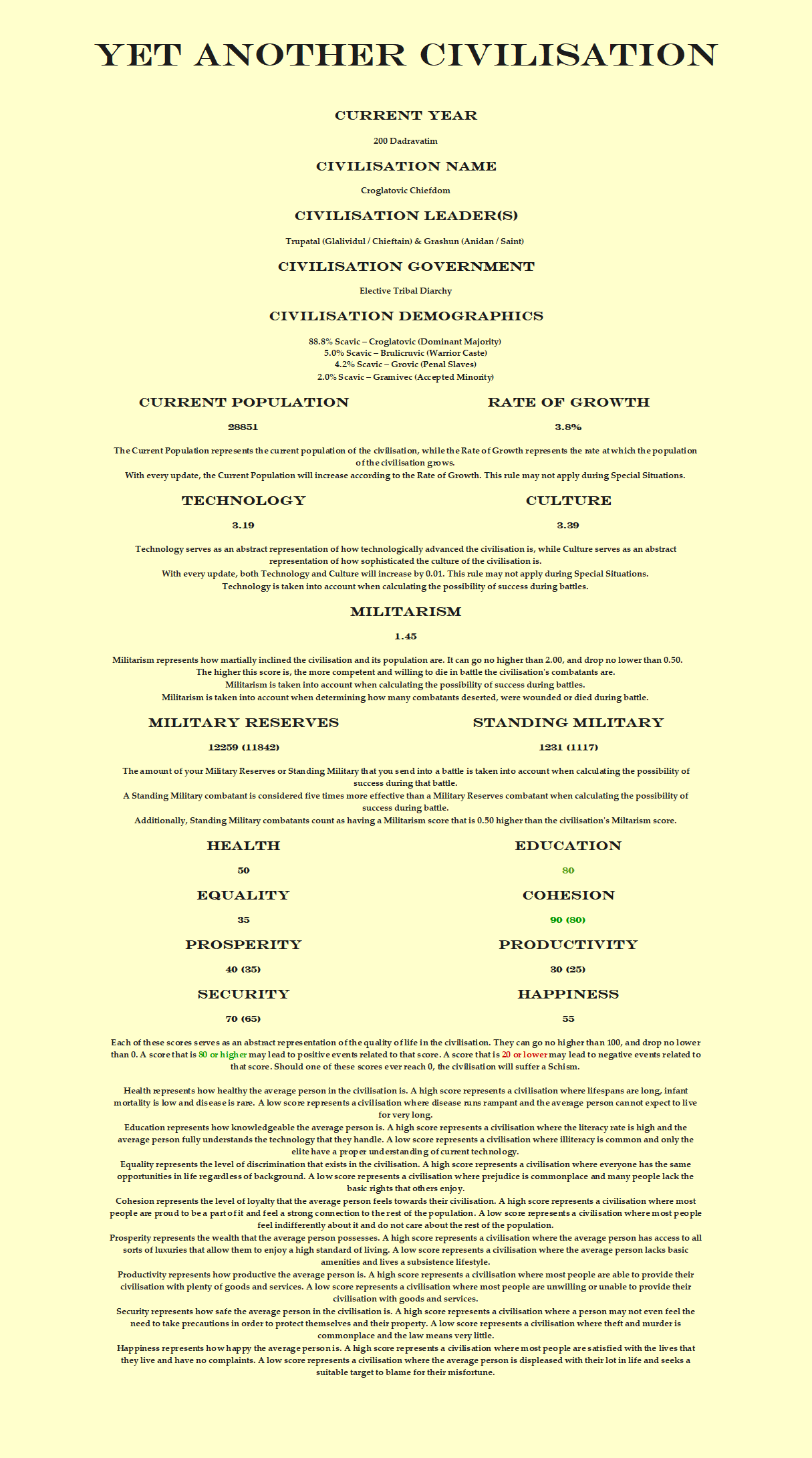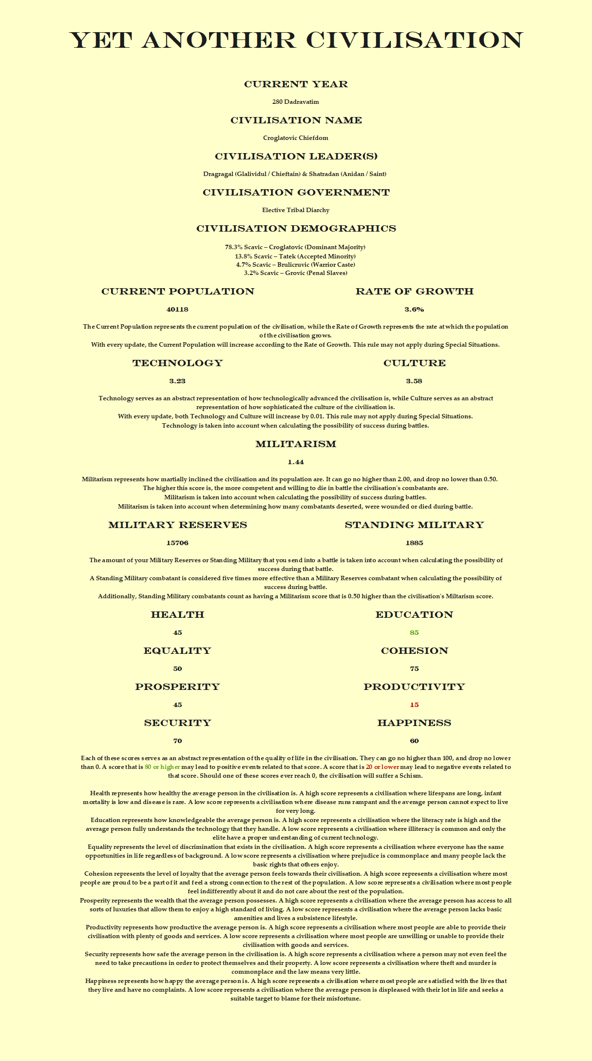 The warriors aren't the only ones who shall be challenged by the shifting status quo. The wily merchants of the Croglatovic might have more avenues for exploitation than ever before, yet they also have to deal with more competition. The Glalividul and Anidan, the chieftain and saint who rule over the chiefdom, may struggle to manage the increasingly clever Glavic, the council of headsmen and patriarchs who serve them. Great change awaits this civilisation.