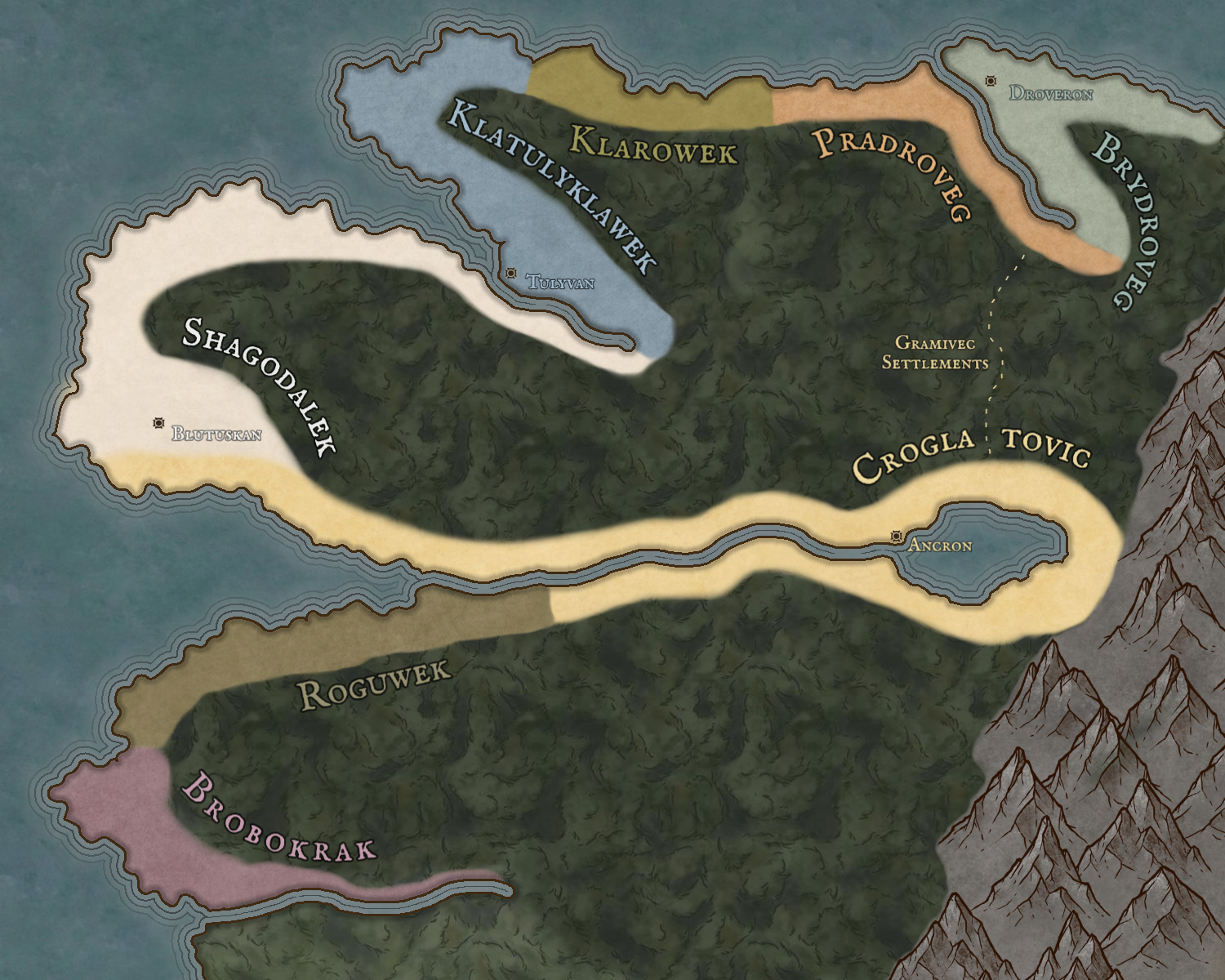 The Croglatovic have dominated the shore of the Croglatol and the banks of the Choslitol, a great lake and the river that flows from it into the sea. Here, the forest is thin and civilisation is allowed to flourish without fear of predation.