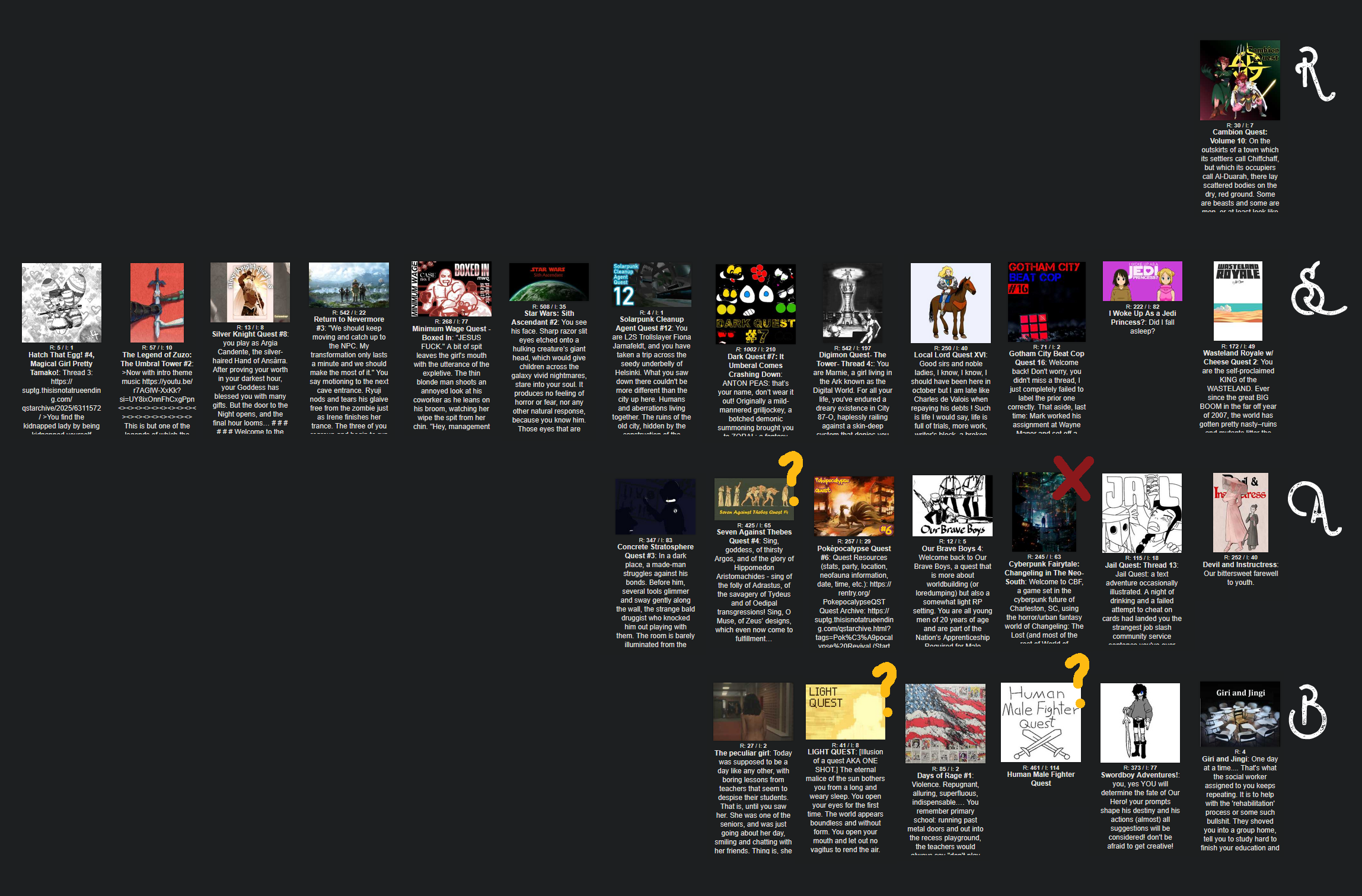 >>6359155>>6359128>>6359111>>6359028>>6359021[Locking! Though I may have a rest before I write... Still getting over this damn cold/flu/covid/whatever.]>>6359127[I don't tend to play many more "gamey" quests, as opposed to narrative-driven ones, but I'll take a peek!]