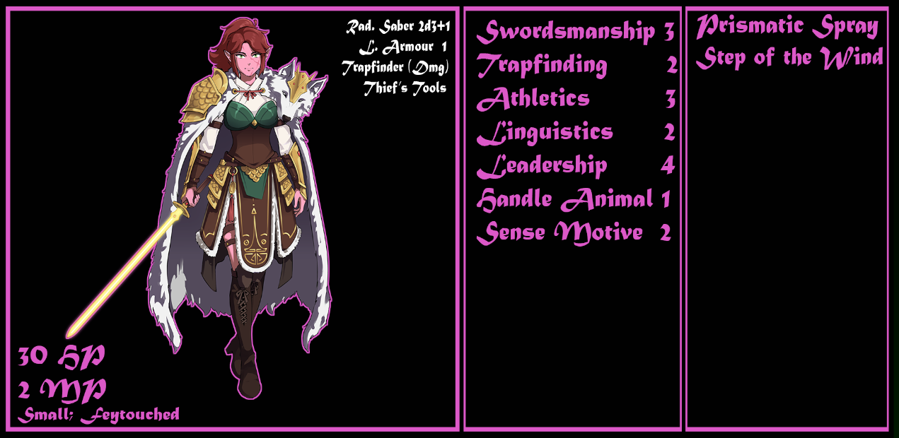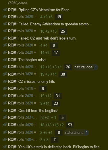 >>6365073“We’re not—!”The protest dies on your lips. You were going to protest that you and your crew weren’t monsters… But you know better. That’s the dark joke at the heart of very name of the MONSTROUS Regiment, after all: that you ARE monsters, to most ‘civilized’ races. You don’t look it anymore, no, but Yeb-Uit does. The Blueberries do. And most adventurers aren’t in the habit of negotiating with monsters.“We’re not fuckin’ around,” you say instead, in a low growl carrying the supernatural and subacoustic sound of <Fear> with it. “Let ‘im go!”Highest roll of 3f20 for Mentalism: 9…“If you say so,” say the half-elven adventurer, and kicks the wounded Yeb-Uit your way.“Wh—oof!”CZ failed to affect the target!Carazzi Yosef’s MP: 2/3You catch Yeb-Uit before he can fall, but don’t even have a chance to right him before the enemy adventurer is casting—“<Deflect!>”—and employing you and Yeb-Uit as a pedestal to stomp down upon as she spring past you two, towards the boglin boys who are activating their radiant sabers.High-level adventurer’s Athleticism (3d20) is a 13.Neither CZ nor Yeb-Uit are incapacitated by the stomp. She is flanked!The dagger-eared old-timer must have gotten cocky, because she winds up sandwich right between the boglins and you, once you and Yeb-Uit have stood up. Seeing how she reacted to your effort to intimidate her into compliance, Brand-Hrok and Hol-Beorn waste no time bringing their golden blades to bear, but to no avail.Brand-Hrok’s highest roll: 4.Hol-Beorn’s: 14.Both miss.She has just enough room to step back, and twists her body in such a way that a misaimed slash could threaten to cut clean through her and take off a chunk of you or Yeb. To their credit, the Blueberries seemingly hold back a little at that, but that leaves her half-turned to you when it comes time for your turn to attack. Seeing how quick she is, you decide to try something a little sneaky to make up for it: you feint with your pronged fishing-spear as you step forward, then plant the butt behind her ankle and drive forward with elbow and shoulder to trip her up.Rolled Natural Weapons +1 from Concealment… Rolled 12, 10, 3, and 1…BUT CZ flanking and it was a clever write-in, so the DC is reduced by 3!The half-elf isn’t expecting this, and crammed into the narrow hall she has little room to manoeuvre. Even though she makes the most of it, you manage to trip her up, leaving her prone. Yeb-Uit takes a step back, notching an arrow already upon his bow, as you prepare to deal a blow…However, she still cast the <Deflect> spell...Which bounces off of an unseen barrier, tinging your knuckles as the impact is sent sidelong to crack into the stone floor next to your target’s head.“Nice effort, kid,” she grunts.