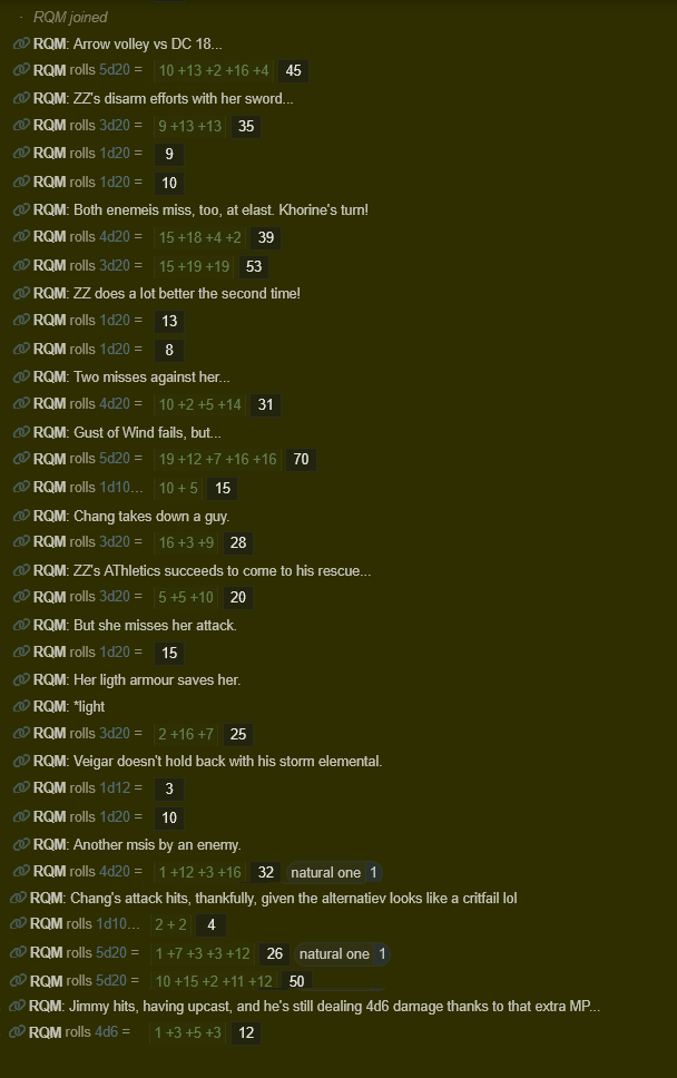 >>6363353>>6363361>>6363434>>6363527Whatever you said—and you MEANT what you said—you still can’t help but be cognizant of your boyfriend’s obvious anxiety about eradicating his fellow Northmen. Perhaps more importantly, it’s just not practical: with so many hostiles, half of them fleeing already, what are the actual chances you catch them all? And what will be the consequences if the few who slip through go tell their friends and family that you mercilessly murdered them?It would be an unfair characterization, to be sure, but you’re well aware of how humans behave, when it’s them versus anyone else.“Take ‘em alive if you can,” you instruct the Regiment, “but none of ours dies for even one of theirs. Got it?”Jimmy glances at you, and you see a bit of his wariness give way to gratitude. It’s the best you can do for him, and his reaction is all you can really hope for, under the circumstances.The storm elemental touches down, a blast of thunder and sparks flying out at Veigar’s instruction. None of the bolts hit anyone—tough to do ‘less lethal’ with lightning, after all—but it provides a bit of cover for your forces as they leap down to the ground.The interference of the elemental and the panic caused by Ayla’s aura increases the DC of the enemies’ first arrow volley by 3 to 18!They roll 5d20 but fail to get higher than a 16: miss!You don’t turn on your radiant blade yet, given how little leeway it gives you to avoid lethal damage; rather, one of the Southron throwing-swords you snagged from Chiffchaff serves in its stead. It’s heavier, requiring you to two-hand it, and its weight is peculiar and unfamiliar, but its nubs and outcroppings should work pretty perfectly for disarming dumbasses with little combat expertise of their own.13 for ZZ’s Swordsmanship: missTwo Northmen roll 9 and 10: both miss!Well, it would have done, if you weren’t immediately set upon by two screaming lunatics, lunging for you with a wood-cutter’s axe and a two-pronged pitchfork. You Step back out of the range of one, and bat aside the other; the blows are clumsy, but the suddenness of the assault give you little time to acclimate to your new weapon.“<Entangle!>”Khorine rolls an 18 for Feycraft: hit!Khorine’s MP: 2/3You jump back again as the spare grass and weeds—the only natural plant-life in the area, and from a patch now yet on fire—springs up to seize your attackers. They cry like big babies about it, blubbering like they’re going to die, but true to your instructions, your favourite faun leaves them alive. You grab their weapons and hurl them behind you, giving Khorine a nod.“Keep ‘em tangled up ‘til we’re done! I wanna have a talk with these shitheads when we’re done, ya hear?!”“Yes, Boss!”