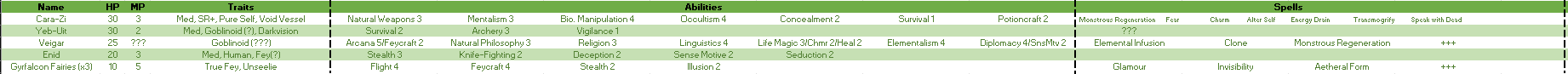On the outskirts of a town which its settlers call Chiffchaff, but which its occupiers call Al-Duarah, there lay scattered bodies on the dry, red ground. Some are beasts and some are men, or at least look like Man. Broken, bent, frozen and burnt. Some are drained of life, left ashen husks; others have had their life bleed out of them onto the settlement’s streets. Looming over them are slate-grey walls, their gates self-sealing, and atop those walls watch impassive black masks, with eyes that see on behalf of their master: Abdul Saniʿ al-Duruʿ, Abdul Murawwiḍ al-Wuḥūsh, Abdul Alhazred the Reptilian Infiltrator.The scaly, slit-pupilled swarthy Southron son-of-a-skink who killed your best feathered friend-for-life and your shapeshifting hundun friend-with-benefits.You are Zith-Zi, Boss Bitch of the Monstrous Regiment adventuring company, and an ex-goblin ‘nilbog’ made pretty by magic……while You have gone by a few variations on the name CZ but have most recently settled on reclaiming your ill-gotten family legacy as Carazzi Yosef: one-time demigoblin cambion, and now a transcended Pure and Empty Vessel at long last.You came to the Southlands, across the Shieldwall mountain which separates it from the north-western lands of the Paladin Queen of Hawksong. You did so not to participate in their silly civilizational clash—what various shades of humans get up to with gnolls and secret subterranean lizard-men is none of your business. You came here to save your estranged boyfriend, fellow adventurer James Efron, from captivity in a Chiffchaff dungeon...…but in the process of procuring him, you punched through the army of enslaved hyena-men to their demon-wielding human-reptilian centre: Alhazred, the devious demonist and dark wizard who bested you in combat, costing you the lives of others whom you cared for.(To say nothing of Nicolette Testa, fashion-forward illusionist-enchanter who joined your quest and lost a body via bullet-blasted brain, only to be pieced back together with an emergency effort of esoteric expertise!)(Or Denise Lilla, the cleric you liberated, who suffered a similar fate in circumstances which precluded such a happy ending for her.)(…It’s been a long few days, alright?)