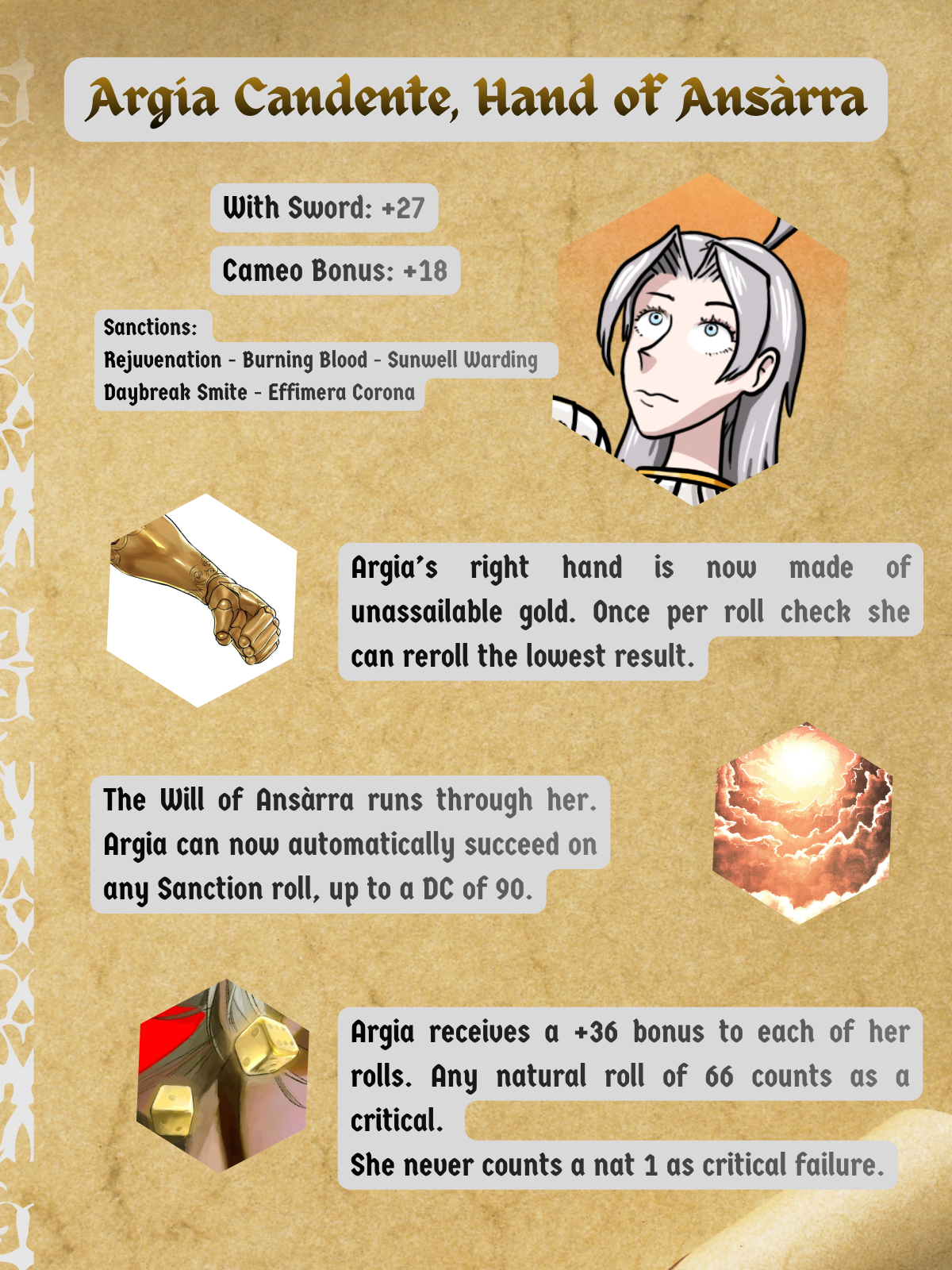 >>6359581Rosandra Brusera Da Roccafonda, Knight of Gerofalco+178 with bare hands+166 with any weapon>At any time Rosandra rolls a number that contains a 6 (i.e. 16, 26, 36, 6 and so on), she can count that roll as a critical success. She counts Natural 1 as a simple number, not as a critical failure.>Any time Rosandra scores a critical success, she acts before her opponent.>Any time Rosandra risks suffering any kind of damage, she rolls 1d6. If she scores a 6, she prevents that damage.>Any time Rosandra has suffered any kind of damage that was not prevented, she rolls a 1d6. If she scores a 6, she recovers that damage.>Rosandra has access to any Sanction. She is granted any Sanction at no cost, with no roll. Sanctions cast through Rosandra have any effects doubled and maximized.>If Rosandra embibes the blood of a believer, any Sanction cast through her has its effects furtherly tripled.I have fond memories of when the thread comments debated about fighting Rosandra and what kind of chances you might have...
