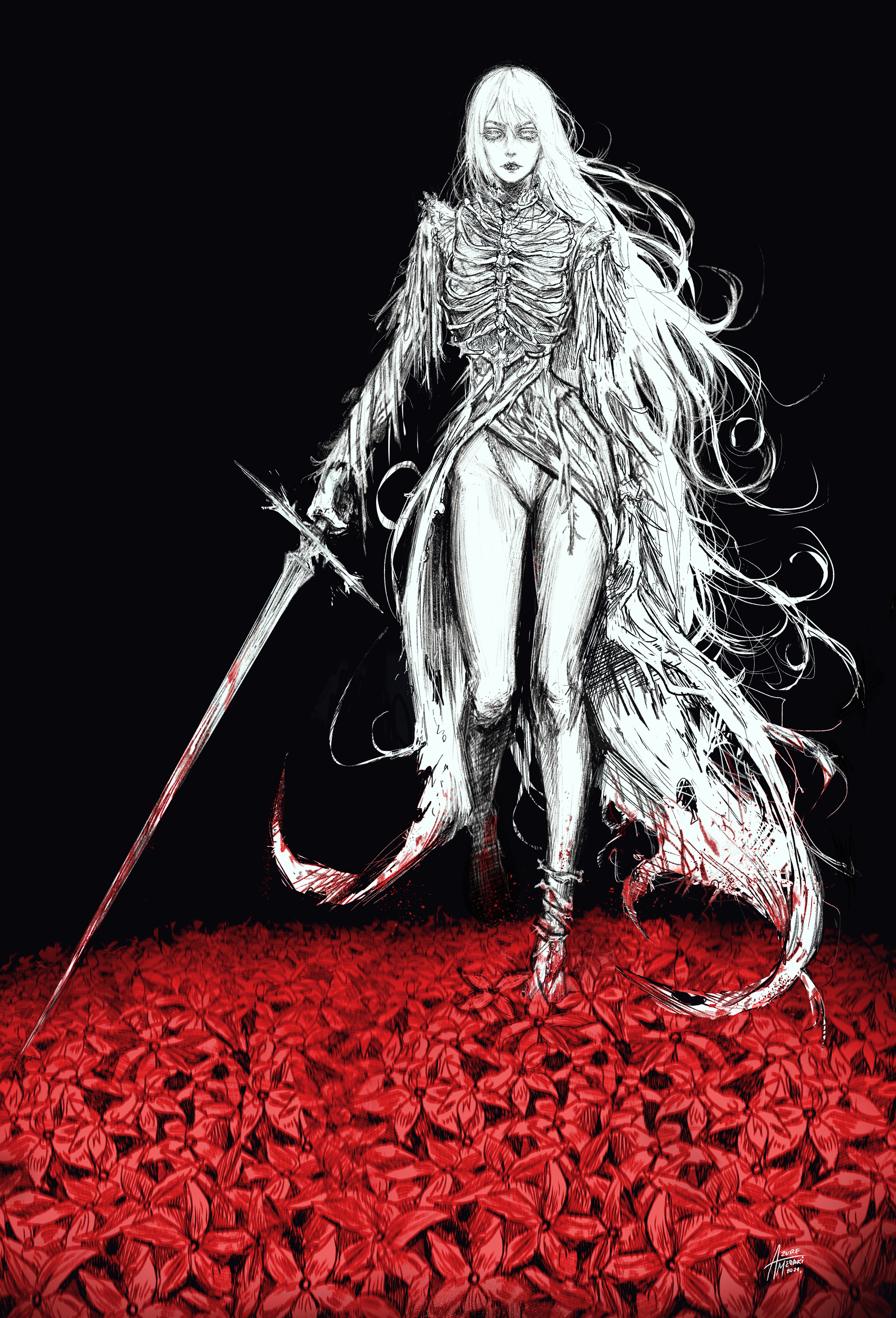 >>6376243You and Rubida and Master carve a path amidst swinging talons, roaring maws and snapping jaws, amidst spears and mauls as they descend upon you like a storm of steel.Master is not bowed. He swirls between every swing like a heron amidst the rushing current, his face impassible as the weapon of the ancients, Kishirra’s own, curls air around itself, sending everything it touches flying, with a flash and the most definitive goodbye, a goodbye into forever.Rubida just smashes. Each time she raises her axe, it keens through the air with a silver flash, and another falls. Another. And another. Soralisa turns to you, glances ahead, at the worm. Tilts her head.“Willow is there.”You nod.She must be right. She’s your brunette scholar. She is always right about these things.Forward.And above you, Carnaval sweeps forward into the deeper ranks. She holds her spear with herself and she burns through the enemy like glowing-red iron over a forge. And the sizzling is sizzling of cursed flesh. And the smoke is smoke of molten iron. She lets out a laughter, the joy of the battle making her blood boil.And yet the black tide does not stop. It does not even slow down. It creeps around the four of you, again and again and again. Only the glowing army of Lithala, a few steps behind you, manages to keep the onslaught from circling you.For each ghostly warrior, a dozen monstrosities. Splendid amidst them, the blonde head of Bradiamante looks ahead with a grim expression. And even over the clangor of metal and the cries and the screams and the stomping, you hear her singing:Questa lama forma non ha. E ossa e ferro a fendere va!An invisible blade falls. And there is nothing that can stand in its way. Everything parts, everything bows, and Bradiamante advances in a perfect wedge of her own making.Well, you shall not be outdone!You swing again. And again. And again.Four times you swing and each time you meet your mark.Dry all tears shed, we break our breadA neck cleaved.we dance as held in gold-spun thread!A chest pierced.Our home is safe its guardian strongA claw cut.may no one tread this road alone!A head sliced.“Pretty little song,” Lithala mutters. She flicks her wrist and more piercing silver stars streak through the mass of bodies, leaving holes in their wake. “You sing it far better than I ever did.”[cont.]