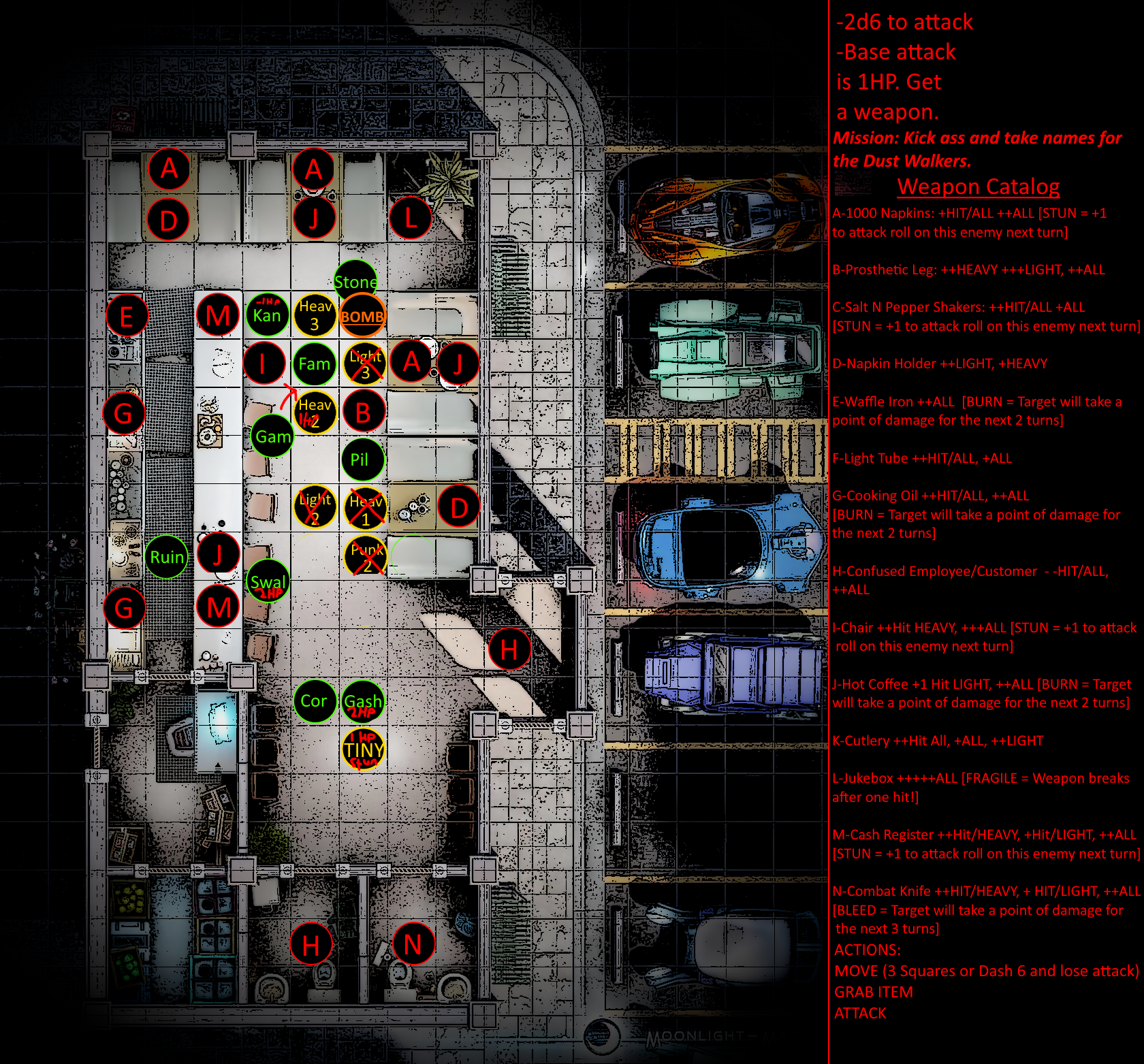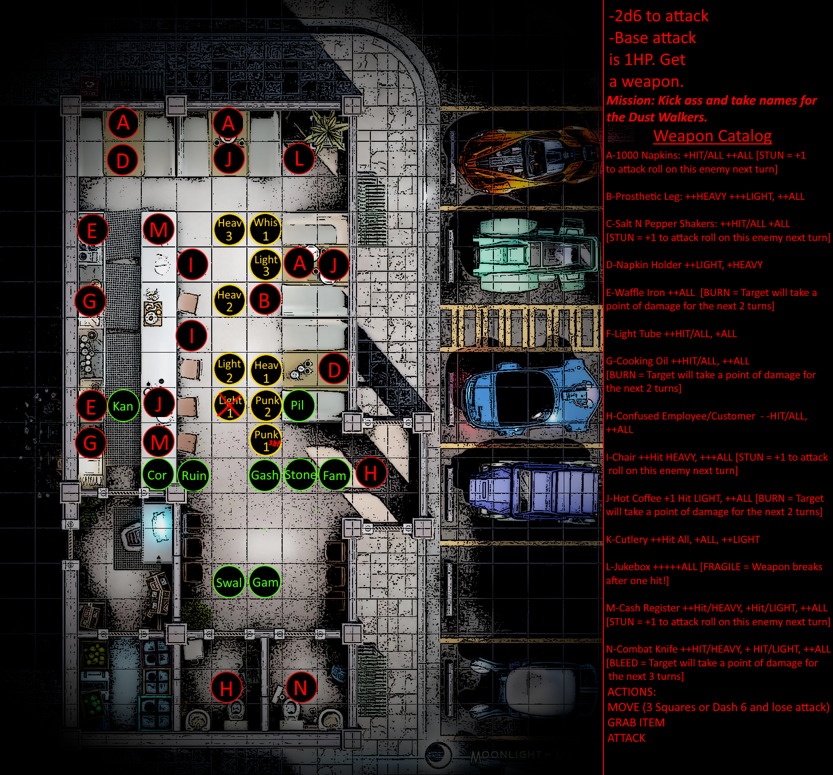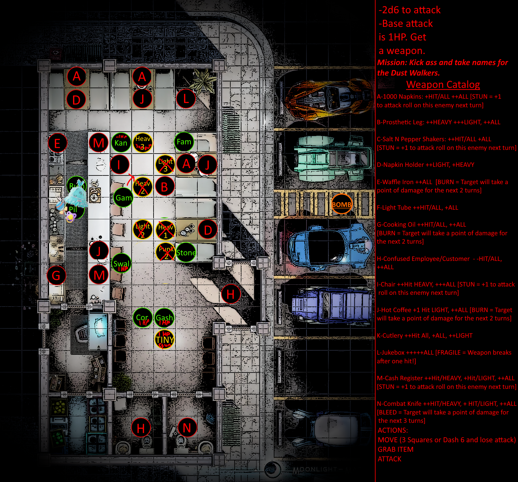 Rules for combat are relatively straightforward and will be discussed more extensively in a later post. In brief, combat encounters will have specific tags [HEAVY, LIGHT, EVASION, etc] that incur specific bonuses or penalties. Each turn, players will roll their FCS dice against objectives, inflicting and taking damage if successful or unsuccessful respectively.