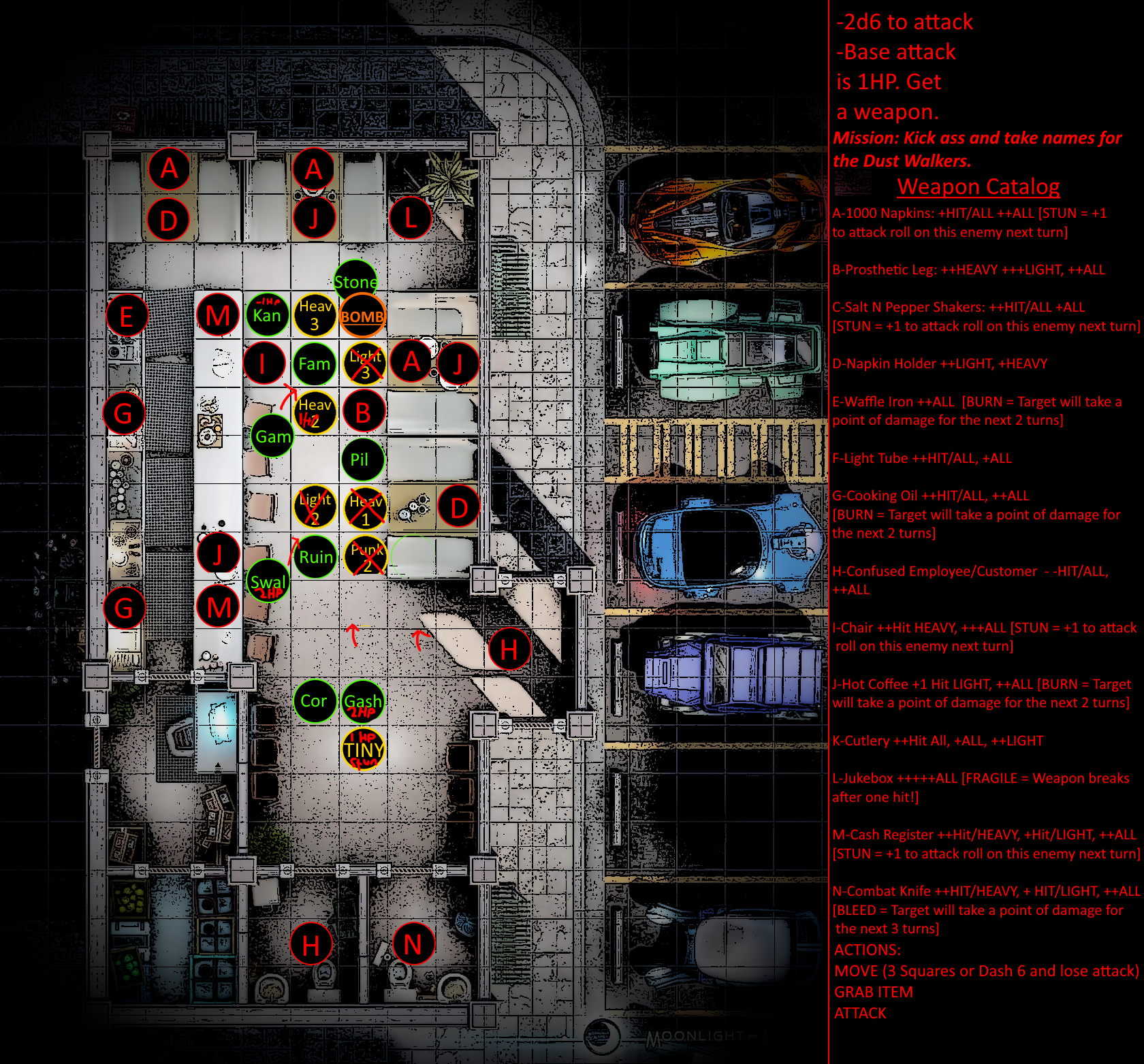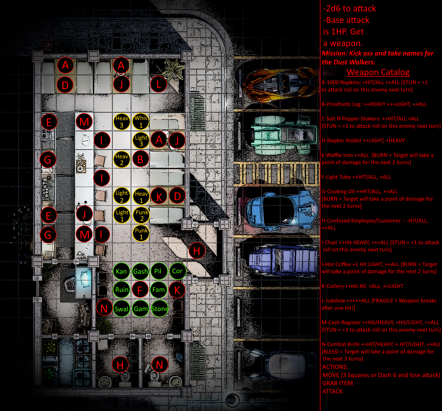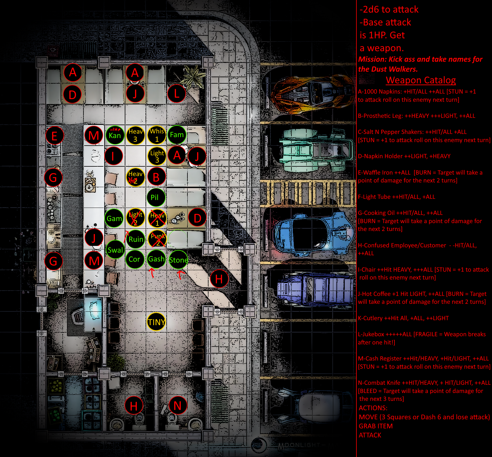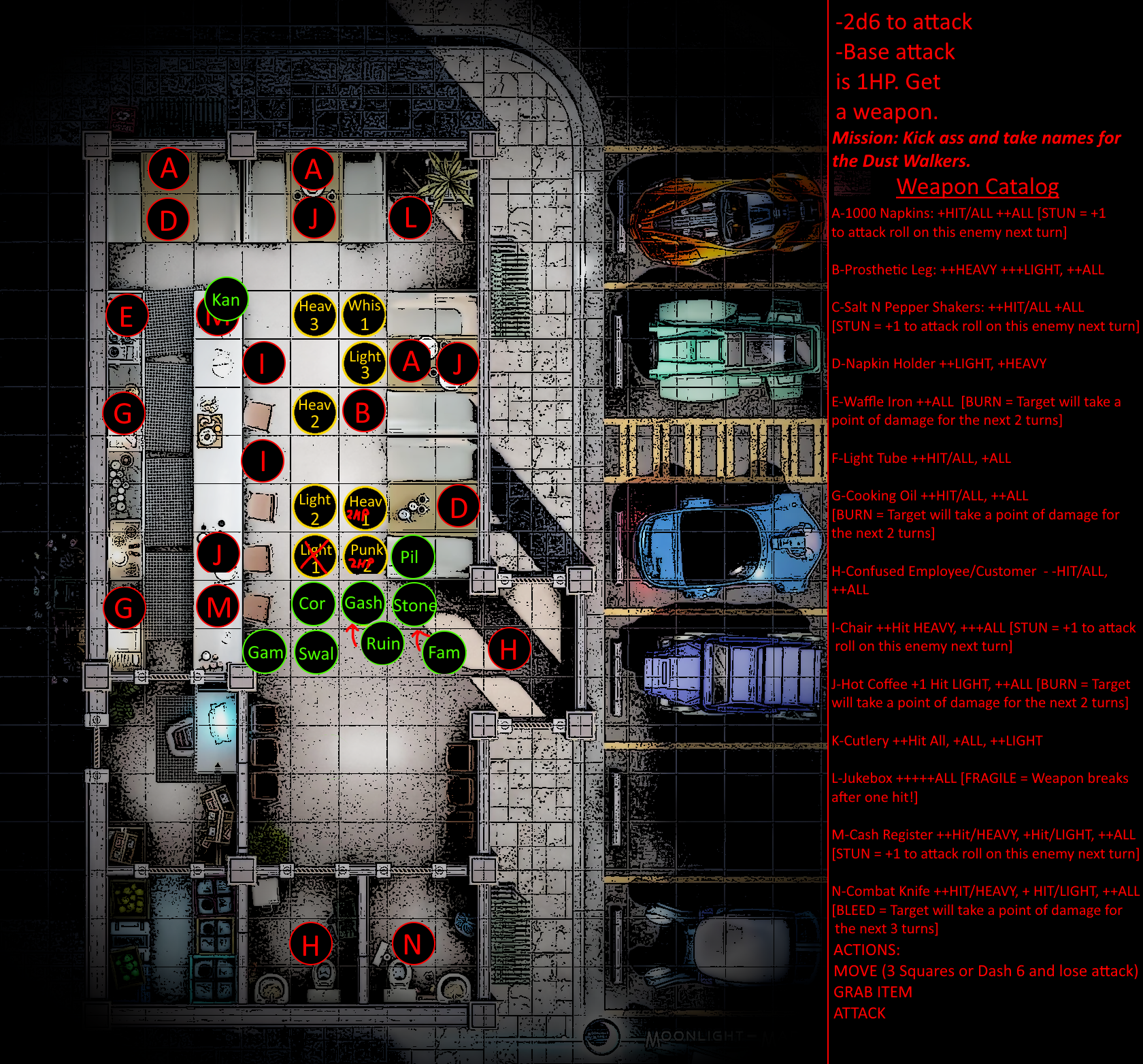 Rules for combat are relatively straightforward and will be discussed more extensively in a later post. In brief, combat encounters will have specific tags [HEAVY, LIGHT, EVASION, etc] that incur specific bonuses or penalties. Each turn, players will roll their FCS dice against objectives, inflicting and taking damage if successful or unsuccessful respectively.