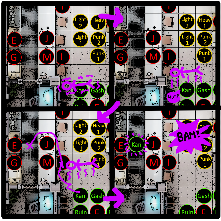 Rolled 3, 3 = 6 (2d4)>>6363291>COMBAT: TURRET EMPLACEMENT 2-1-1. 4 HP | HIT DC5 | [EVASION]If I'm reading this correctly, the path 2-1 -> 2-2 is blocked by enemies, but 3-1 -> 3-2 isn't blocked.