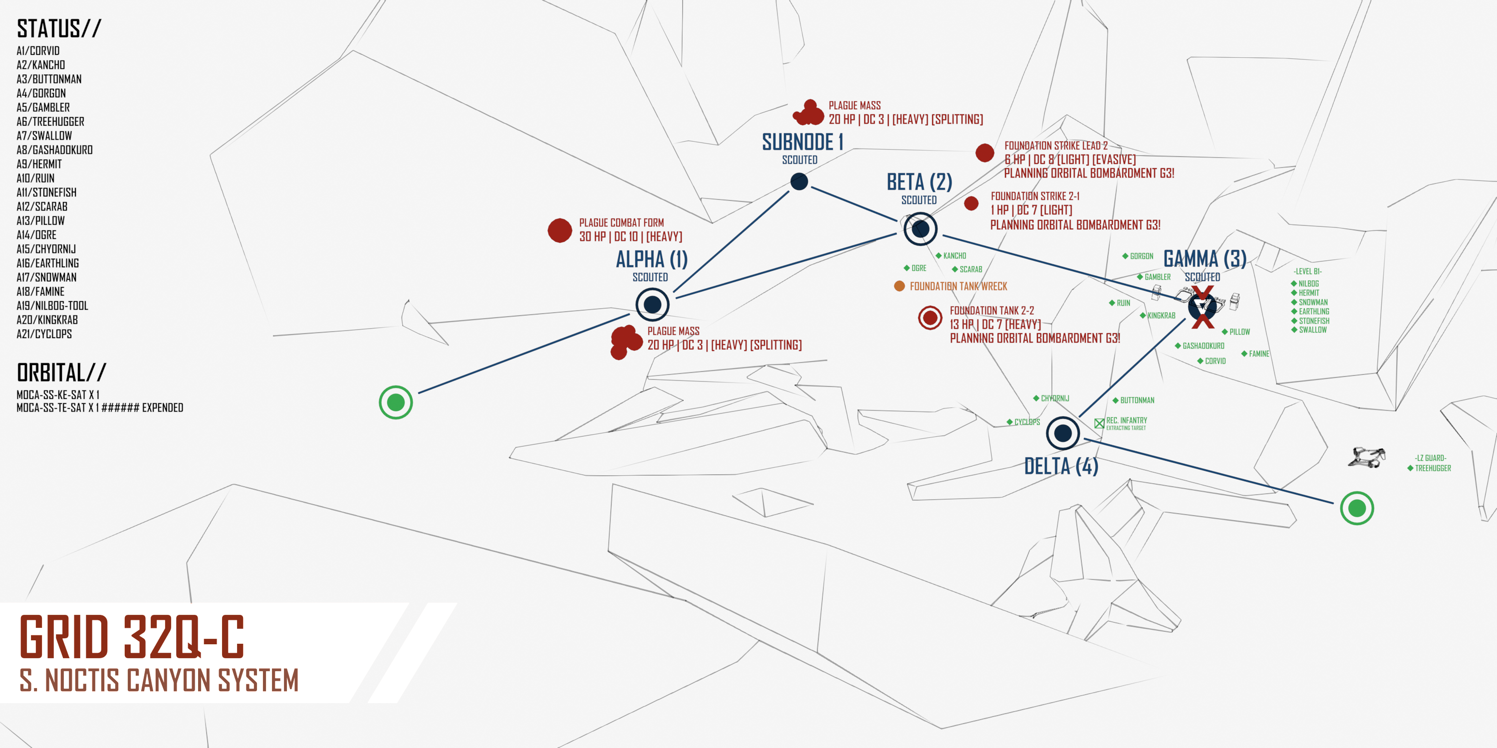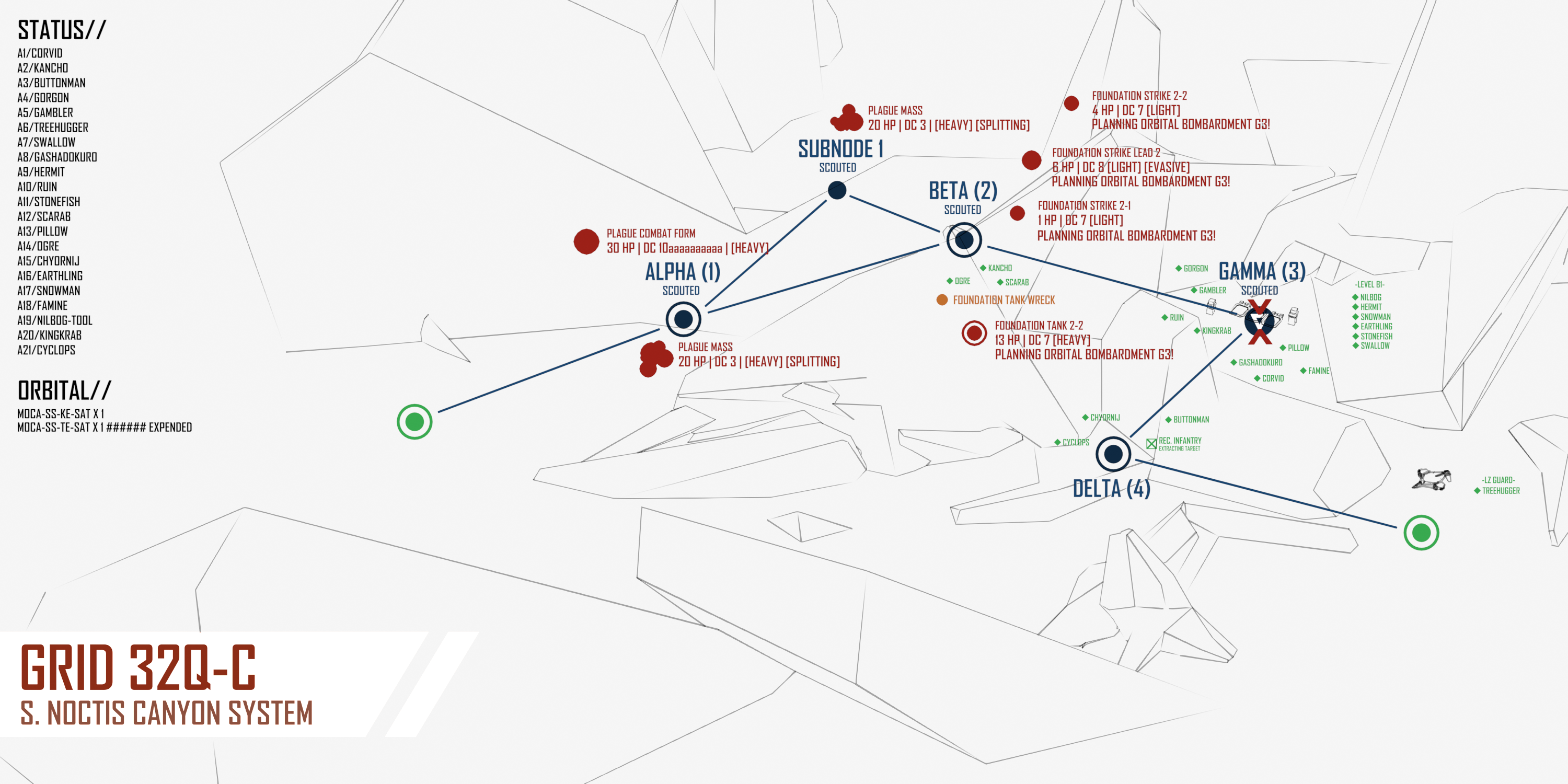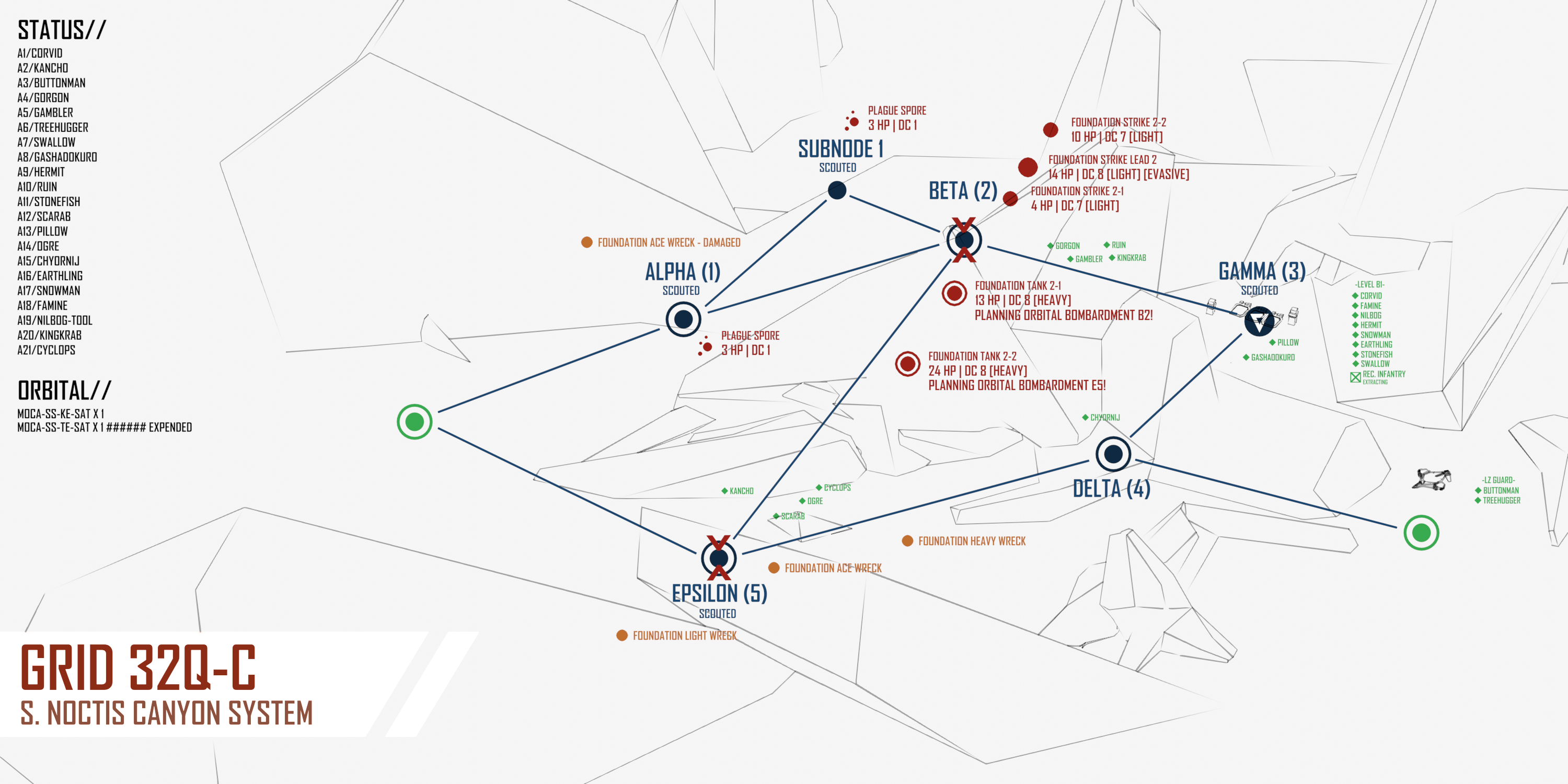 >>6392756>>6392755Apologies for the mistake! Options with corrected map below - feel free to change your actions sorry if not I will redirect to viable targets. >[ALPHA-1]:COMBAT:>PLAGUE MASS [20 HP | DC 3 | [SPLITTING]]>PLAGUE COMBAT FORM [30 HP | DC 9 | [SPLITTING]]>[BETA-2]:COMBAT:>FOUNDATION STRIKE LEAD 2. [6 HP | DC 8 | [LIGHT][EVASIVE]] [THIS UNIT WILL CALL A BOMBARDMENT SATELLITE ON GAMMA-3 NEXT TURN]>FOUNDATION STRIKE 2-1. [1 HP | DC 7 | [LIGHT]] [THIS UNIT WILL CALL A BOMBARDMENT SATELLITE ON GAMMA-3 NEXT TURN]>FOUNDATION TANK 2-2. [13 HP | DC 7 | [HEAVY]] [THIS UNIT WILL CALL A HEAVY BOMBARDMENT SATELLITE ON GAMMA-3 NEXT TURN]SALVAGE:>FOUNDATION HEAVY WRECK. [Roll 1D10 for salvage. 1-6 8-36 MU | HV BOMBARDMENT SATELLITE ON 8-10]>[SUBNODE-1]:COMBAT:>PLAGUE MASS [20 HP | DC 3 | [SPLITTING]]