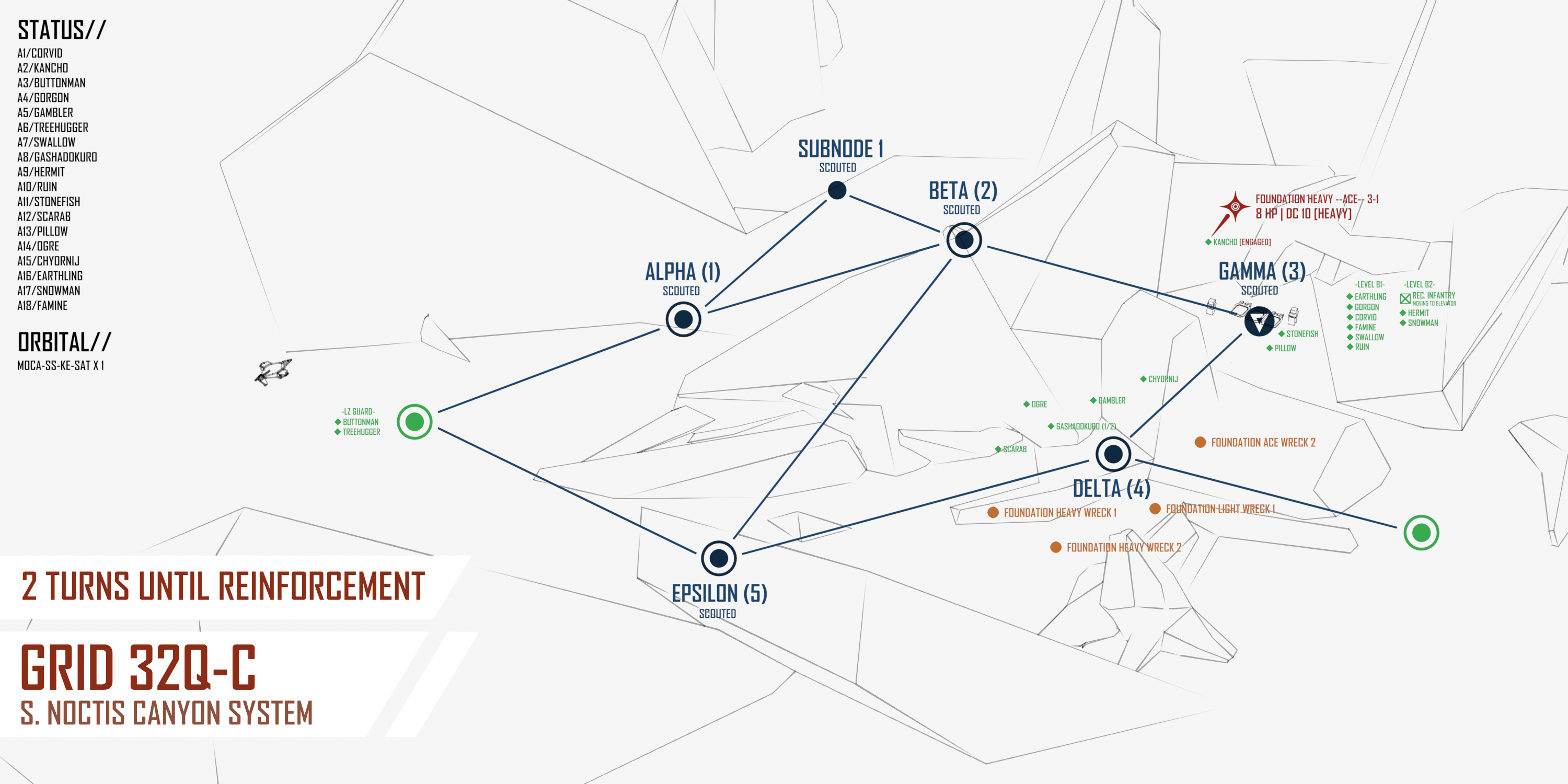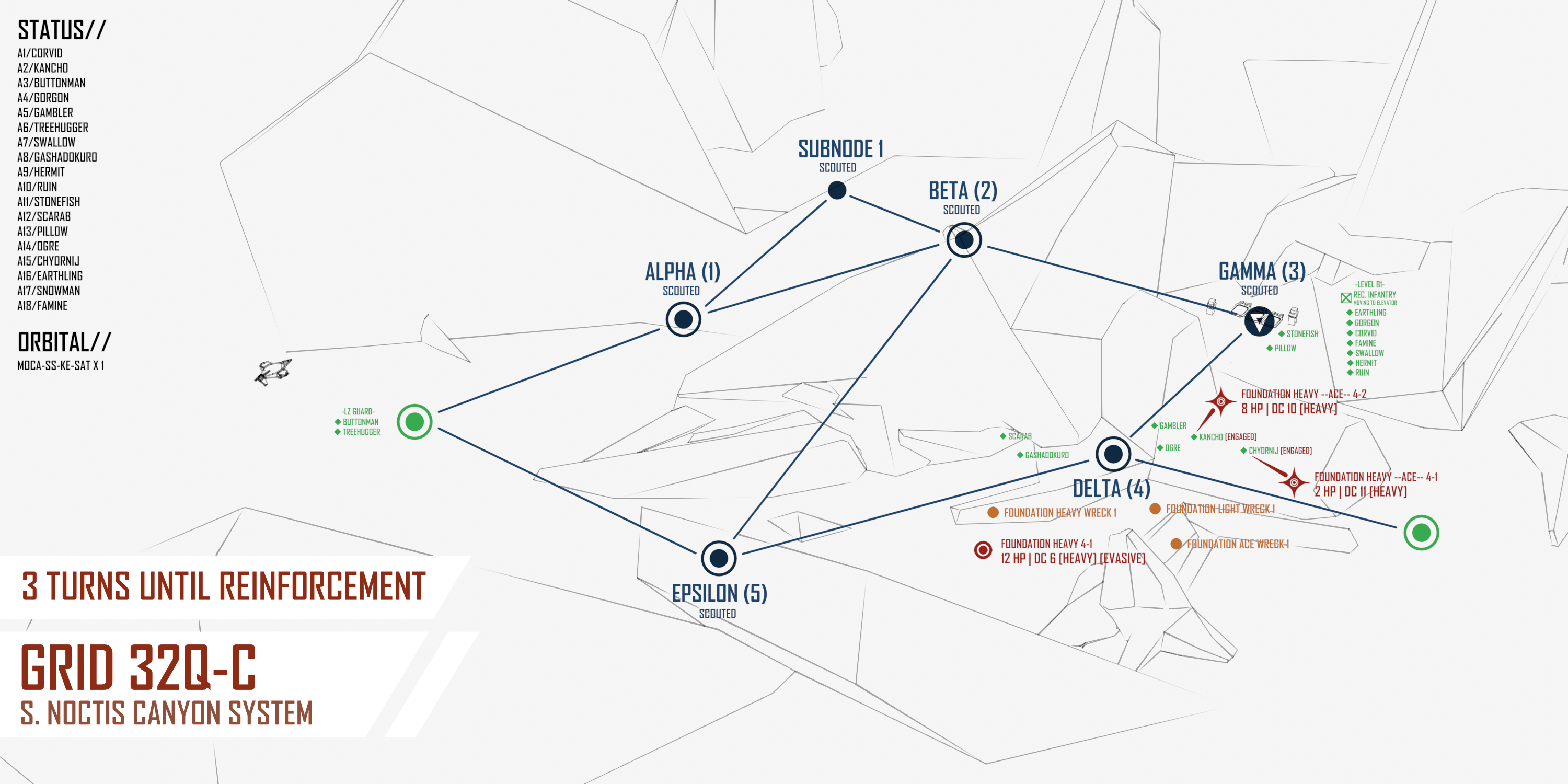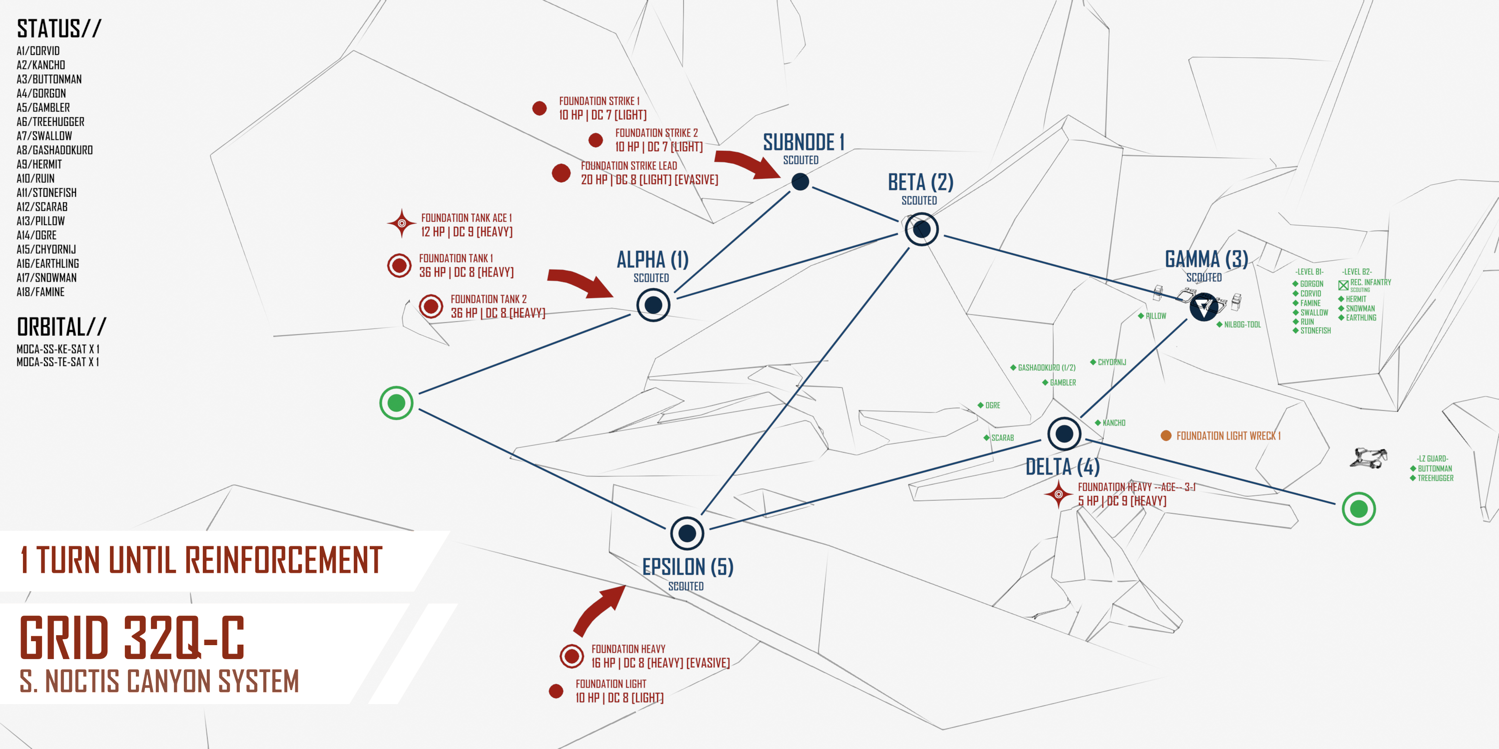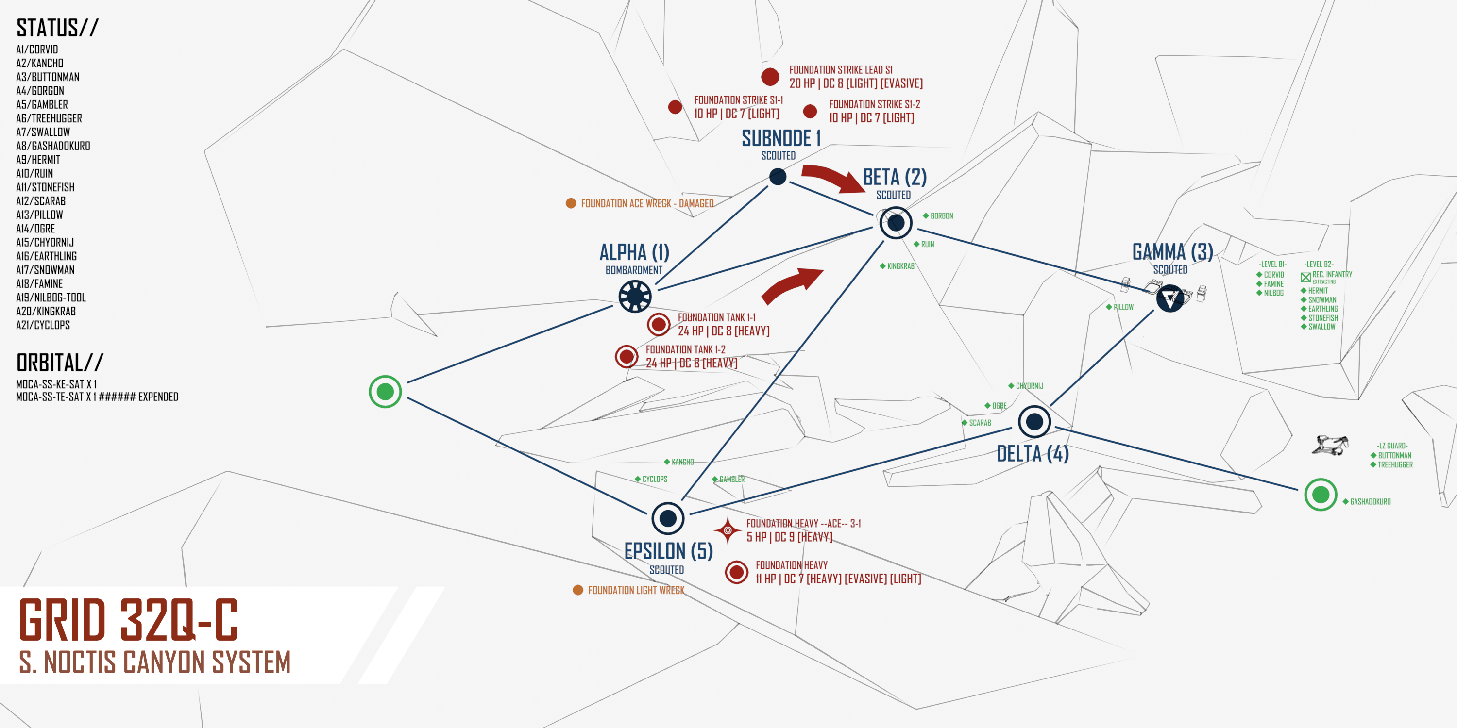 >>6392756>>6392755Apologies for the mistake! Options with corrected map below - feel free to change your actions sorry if not I will redirect to viable targets. >[ALPHA-1]:COMBAT:>PLAGUE MASS [20 HP | DC 3 | [SPLITTING]]>PLAGUE COMBAT FORM [30 HP | DC 9 | [SPLITTING]]>[BETA-2]:COMBAT:>FOUNDATION STRIKE LEAD 2. [6 HP | DC 8 | [LIGHT][EVASIVE]] [THIS UNIT WILL CALL A BOMBARDMENT SATELLITE ON GAMMA-3 NEXT TURN]>FOUNDATION STRIKE 2-1. [1 HP | DC 7 | [LIGHT]] [THIS UNIT WILL CALL A BOMBARDMENT SATELLITE ON GAMMA-3 NEXT TURN]>FOUNDATION TANK 2-2. [13 HP | DC 7 | [HEAVY]] [THIS UNIT WILL CALL A HEAVY BOMBARDMENT SATELLITE ON GAMMA-3 NEXT TURN]SALVAGE:>FOUNDATION HEAVY WRECK. [Roll 1D10 for salvage. 1-6 8-36 MU | HV BOMBARDMENT SATELLITE ON 8-10]>[SUBNODE-1]:COMBAT:>PLAGUE MASS [20 HP | DC 3 | [SPLITTING]]
