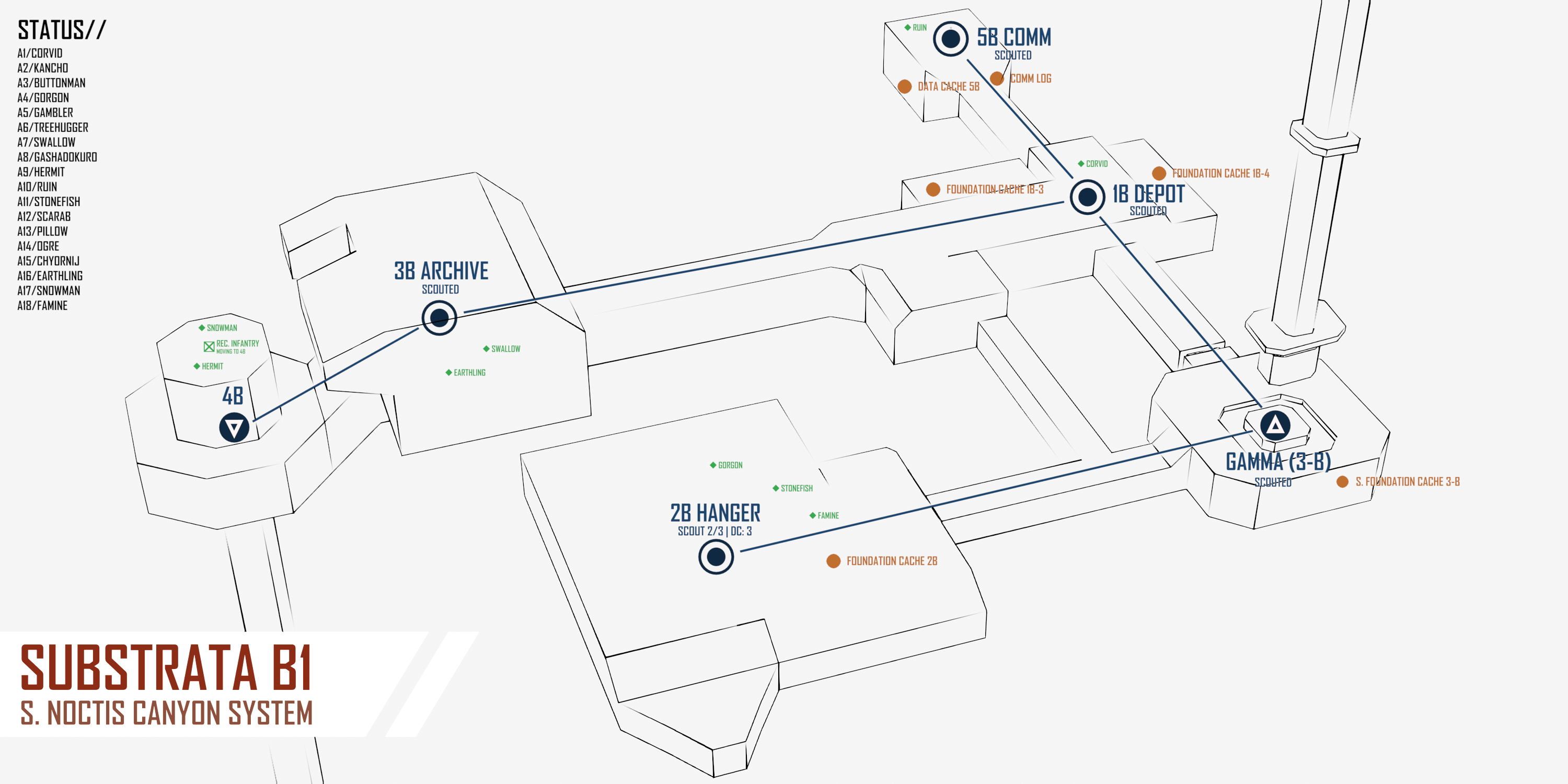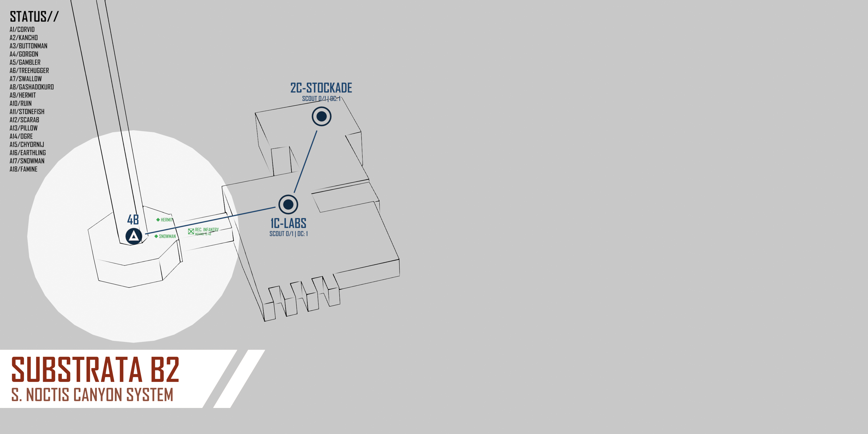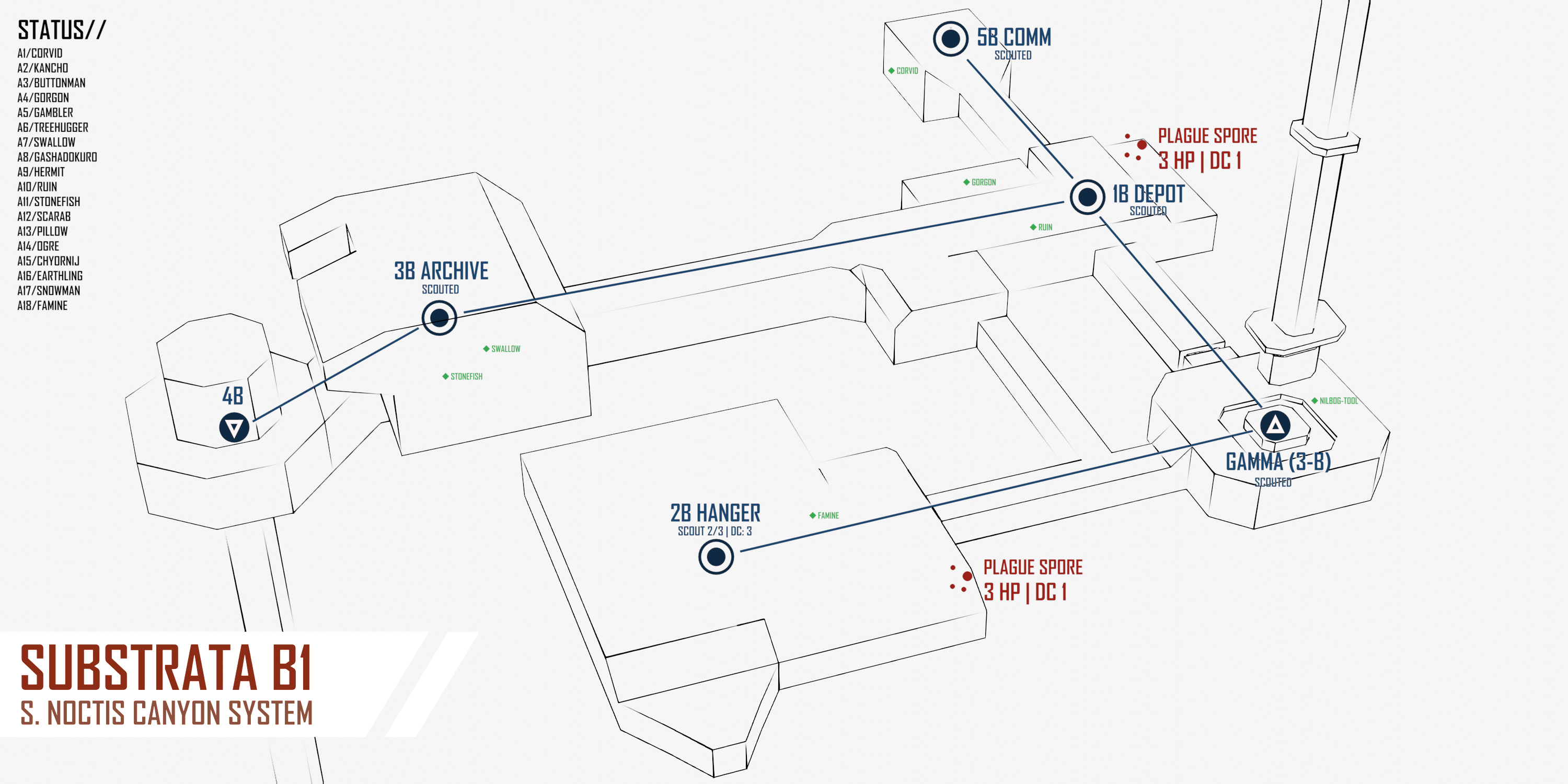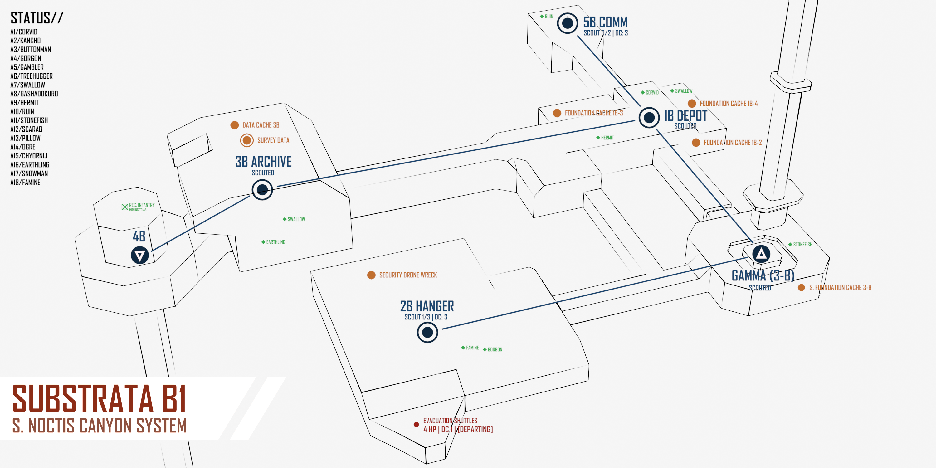 [Each turn, you may MOVE to any ADJACENT node. If this node is UNEXPLORED, you can use your ACTION to SCOUT it, revealing POINTS OF INTEREST (POI). There may be multiple POI per node, so there are benefits to having multiple players scout the same node. Some parts, like RADARS, always provide a SCOUTING BONUS, while other stats may grant more situational scouting benefits.][Note that all DCs are inclusive. (>=)]>NODE: 1-1. DEVELOPMENT COMPLEX. (Roll 1D6) DC: 5>NODE: 2-1. MAIN FABRICATION COMPLEX. (Roll 1D6) DC: 3>NODE: 3-1. STORAGE YARD ALPHA. (Roll 1D6) DC: 2