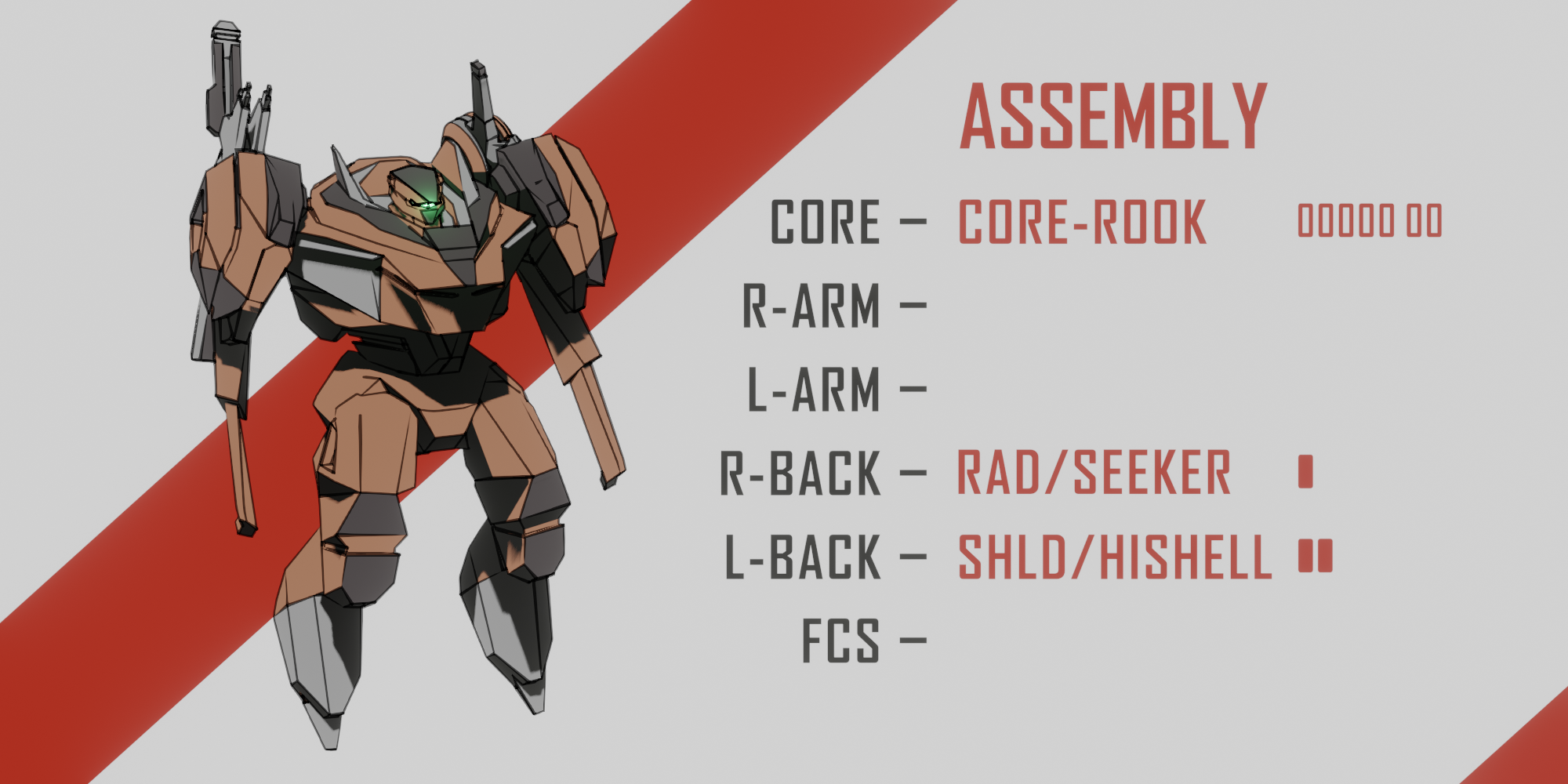 >>6362889>CORE/ROOK. [ LOAD LIMIT: 7 | HP: 2 ]Arms:> RIFLE//EXTEN-R. [LOAD: 1 | + DMG/ALL].> PILE DRIVER//ISHMAEL. [LOAD: 2 | ++++ DMG/HEAVY ] [R-ARM ONLY].Back:> SHIELD//HI0-SHELL [LOAD: 2 | + HP] [L-BACK ONLY].> MISSILE//2-CELL [LOAD: 1 | + DMG/ALL].FCS:> FCS/BML-CL [ 2D4 | ++ HIT/HEAVY ]Callsign:>OGRE