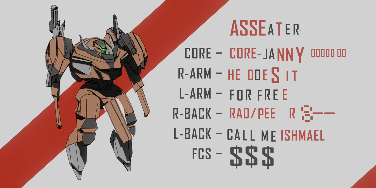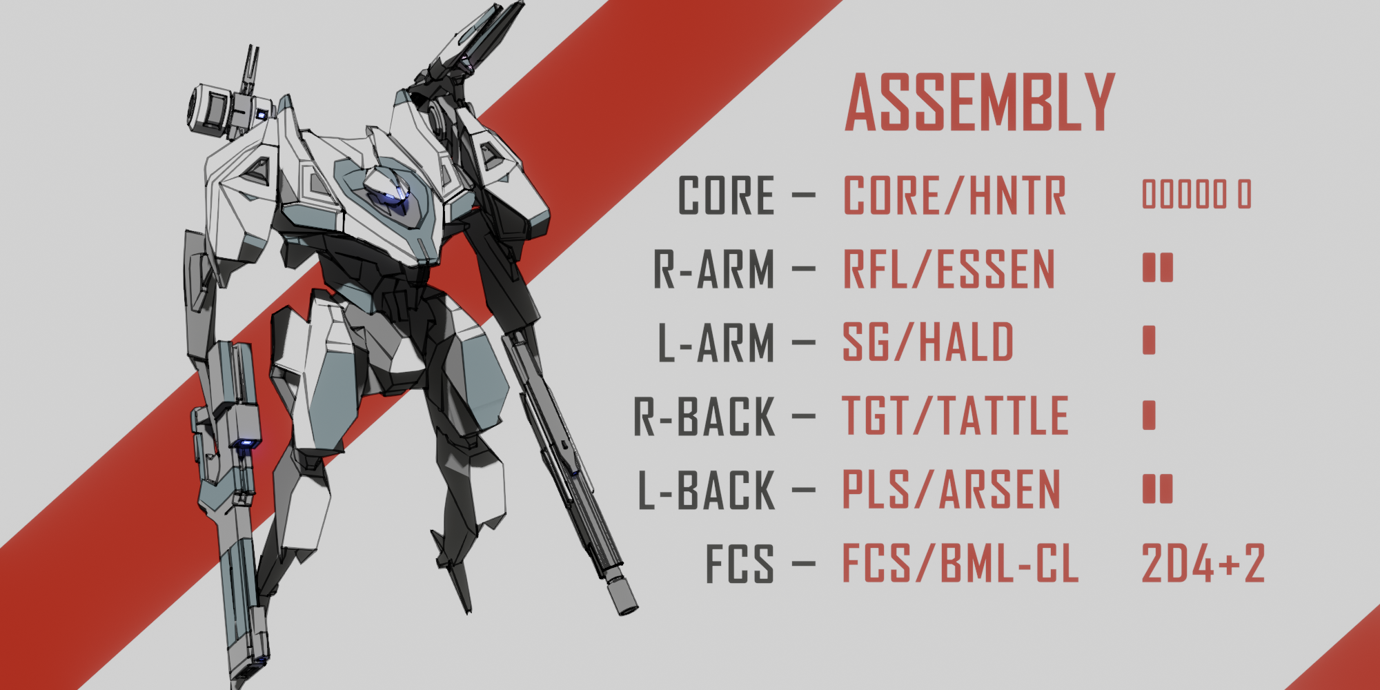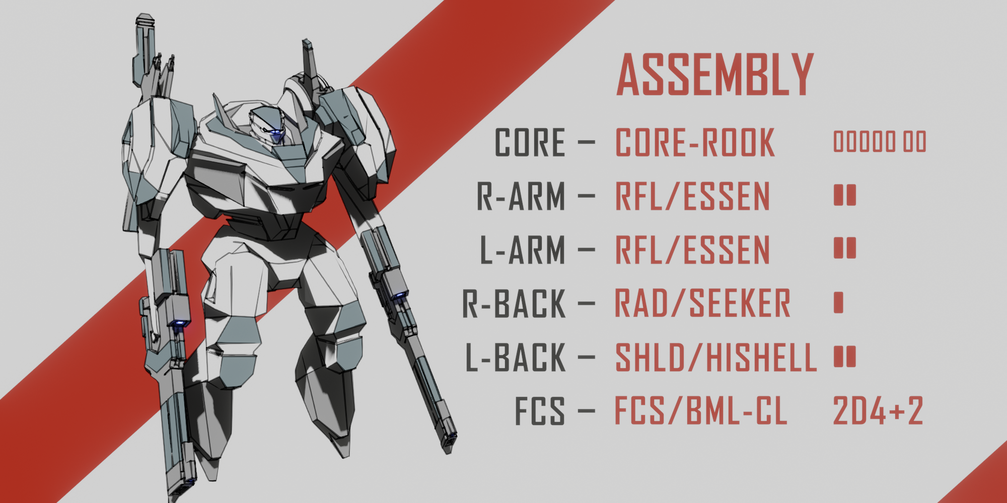 >>6362889>CORE/ROOK. [ LOAD LIMIT: 7 | HP: 2 ]> PILE DRIVER//ISHMAEL. [LOAD: 2 | ++++ DMG/HEAVY ] [R-ARM ONLY].> RIFLE//EXTEN-R. [LOAD: 1 | + DMG/ALL].> RADAR//SEEKER [LOAD: 1 | + SCOUTING | + HIT/ALL] [R-BACK ONLY].> CANNON//DRIVER [LOAD: 3 | +++ DMG/ALL | - EVASIVE].> FCS/BML-CL [ 2D4 | ++ HIT/HEAVY ]>Callsign: Stonefish