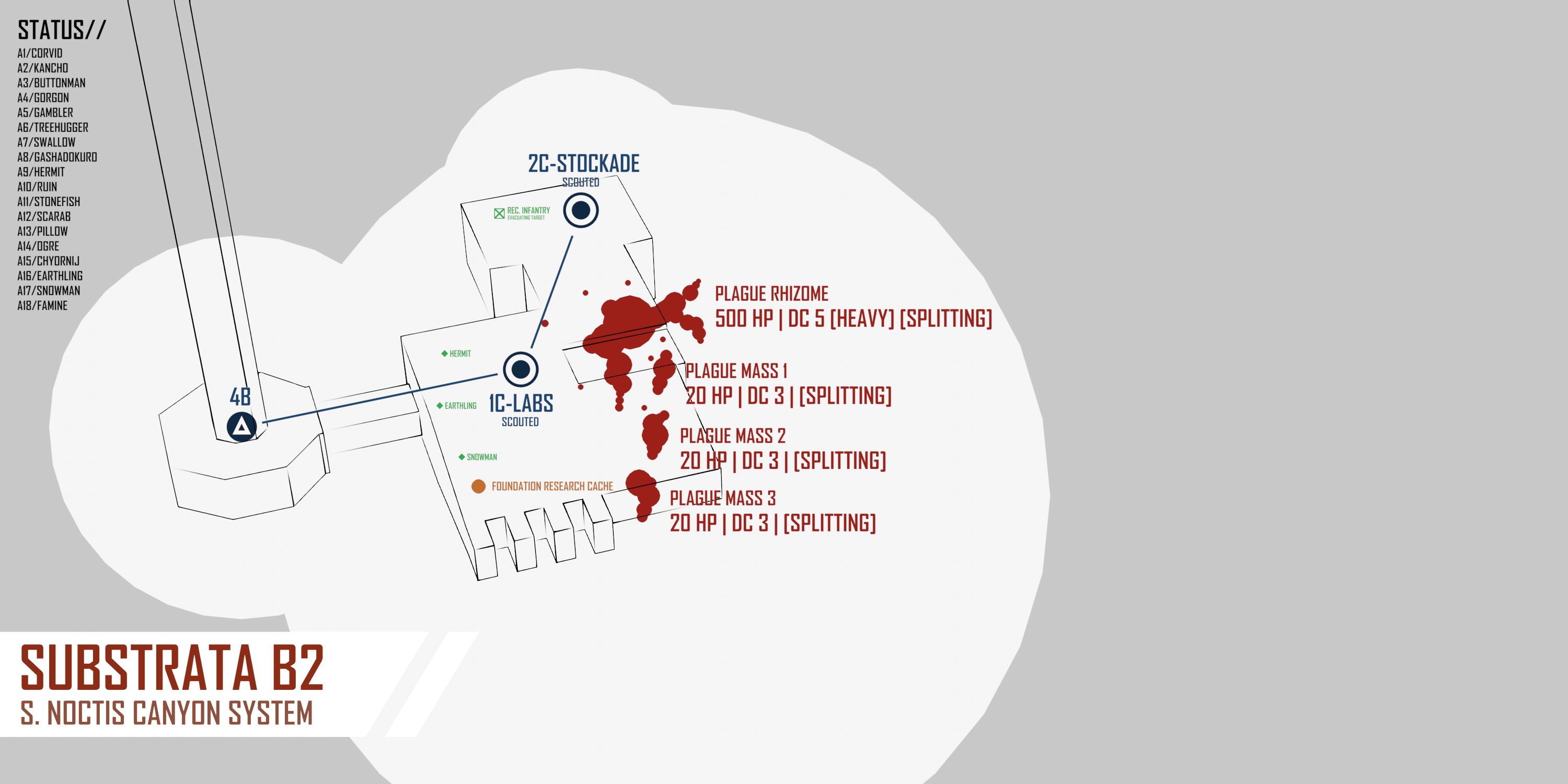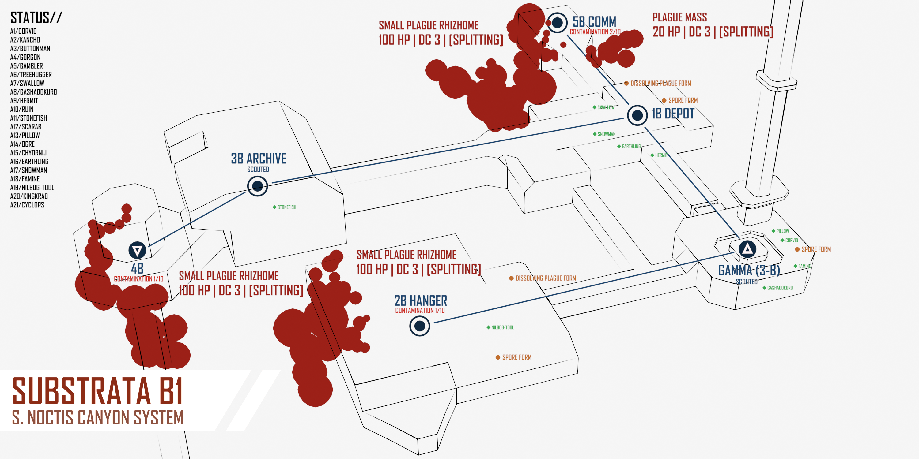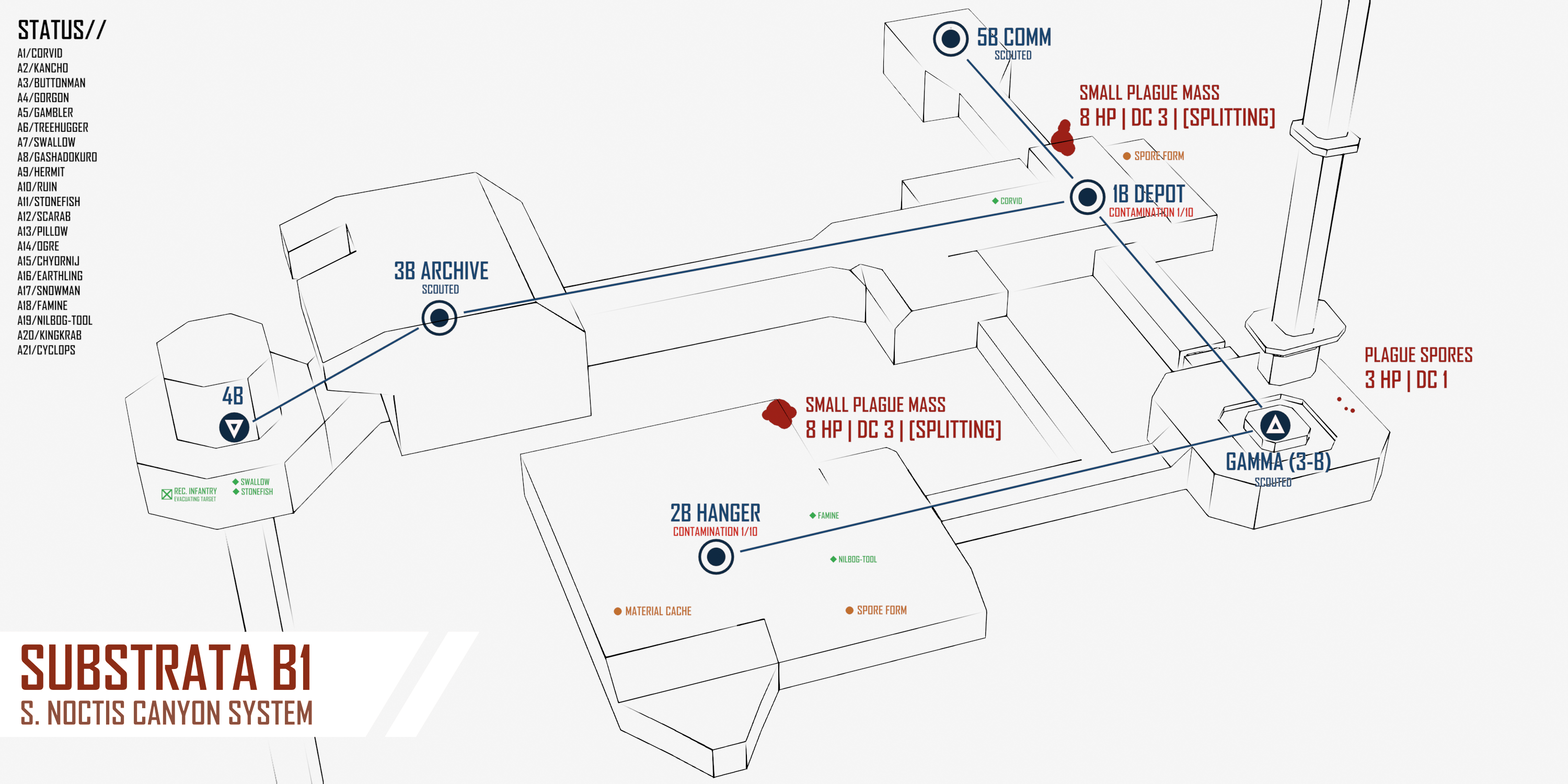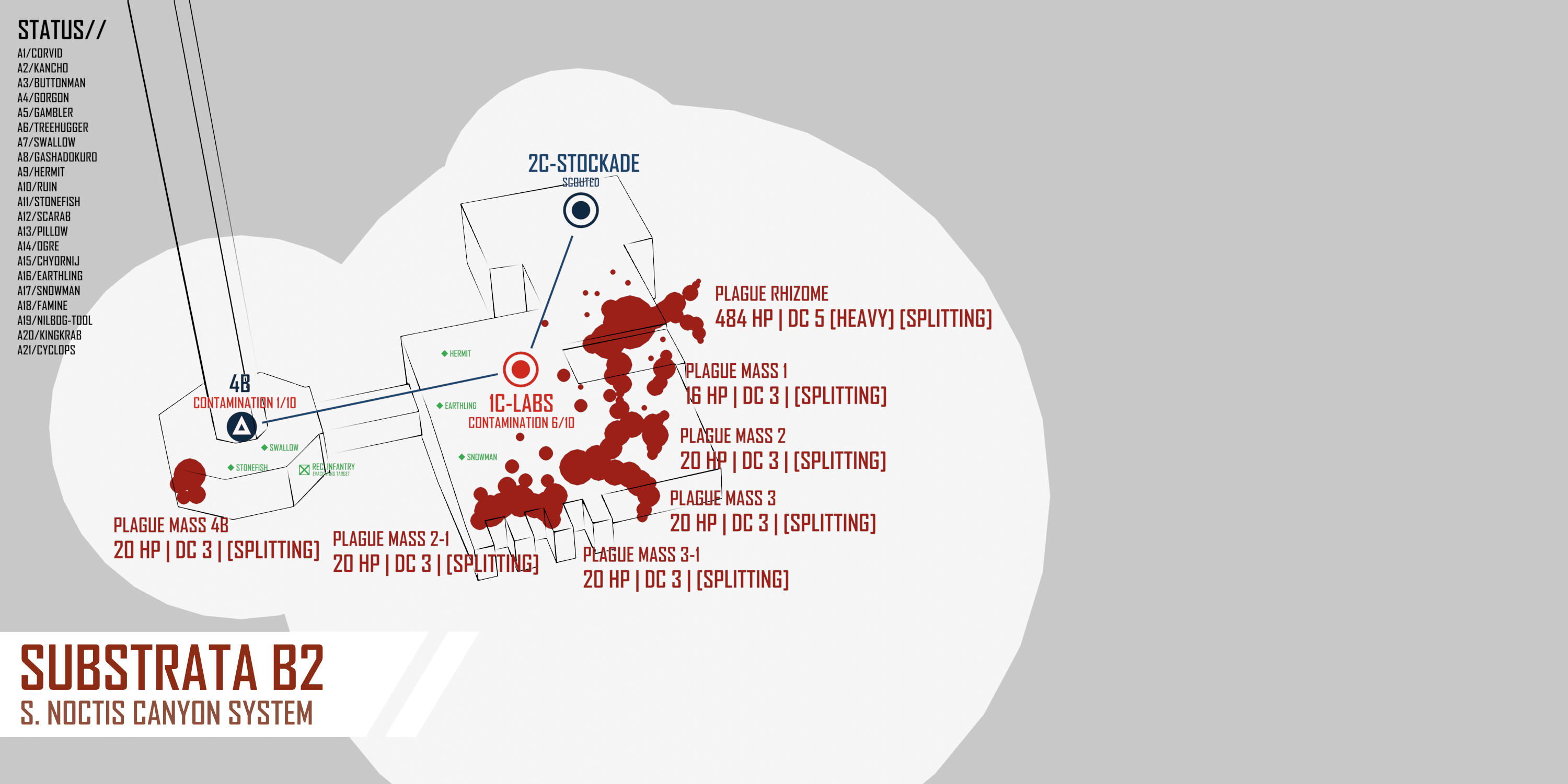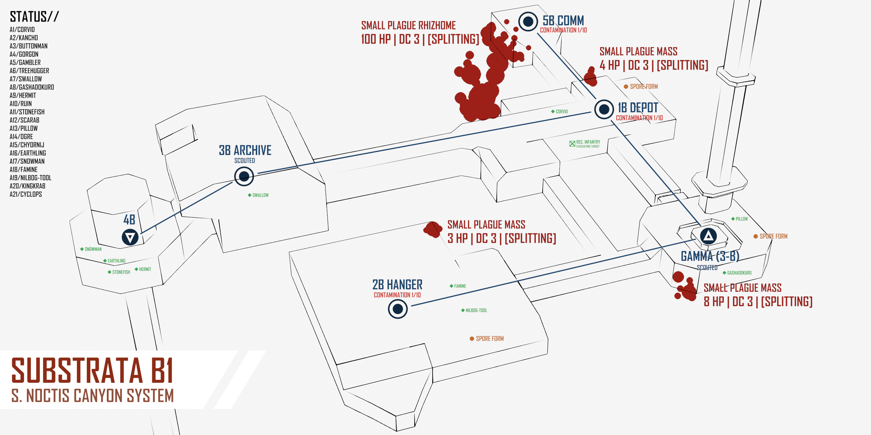>SUBSURFACE>SUBSURFACEThe situation below ground is no less dire. Your mercenaries send the infantry company through the elevator first, forming a tight rearguard. Plague spread was occurring at a shocking pace now - multiple sub-rhizomes emerge from crumbling walls. Spores flow through ventilation systems like fog. Here and there, you see distortion of underlying mechanical or biological architecture: the negative image of a door, hollowed out in a boiling plague-mass. A human hand, in plague-red, tiled over a wall in a spiraling fractal pattern. Your mercenaries cauterize areas of contamination when possible and escape when it is not. Slowly, methodically, with knowledge gained from bitter experience, the organized retreat continues.4B:[CONTAMINATION 1/10]COMBAT:>SMALL PLAGUE RHIZOME. [100 HP | DC 3 | [SPLITTING]]1B DEPOT: [CONTAMINATION 1/10]SALVAGE:>SPORE FORM: [Roll 1D6 for salvage] [CONTAMINATION THREAT ON 1 | PLAGUE SAMPLE ON 1-5 | PLAGUE MODULE 6]>DISSOLVING PLAGUE MASS. [Roll 1D8 for salvage] [CONTAMINATION THREAT ON 1 | PLAGUE SAMPLE ON 1-5 | PLAGUE MODULE 6-8]2B HANGER: [CONTAMINATION 1/10]SALVAGE:>SPORE FORM: [Roll 1D6 for salvage] [CONTAMINATION THREAT ON 1 | PLAGUE SAMPLE ON 1-5 | PLAGUE MODULE 6]>DISSOLVING PLAGUE MASS. [Roll 1D8 for salvage] [CONTAMINATION THREAT ON 1 | PLAGUE SAMPLE ON 1-5 | PLAGUE MODULE 6-8]5B COMM: COMBAT:>SMALL PLAGUE RHIZOME. [100 HP | DC 3 | [SPLITTING]]>PLAGUE MASS [20 HP | DC 3 | [SPLITTING]]GAMMA 3B:SALVAGE: >SPORE FORM: [Roll 1D6 for salvage] [CONTAMINATION THREAT ON 1 | PLAGUE SAMPLE ON 1-5 | PLAGUE MODULE 6]>DISSOLVING PLAGUE MASS. [Roll 1D8 for salvage] [CONTAMINATION THREAT ON 1 | PLAGUE SAMPLE ON 1-5 | PLAGUE MODULE 6-8]
