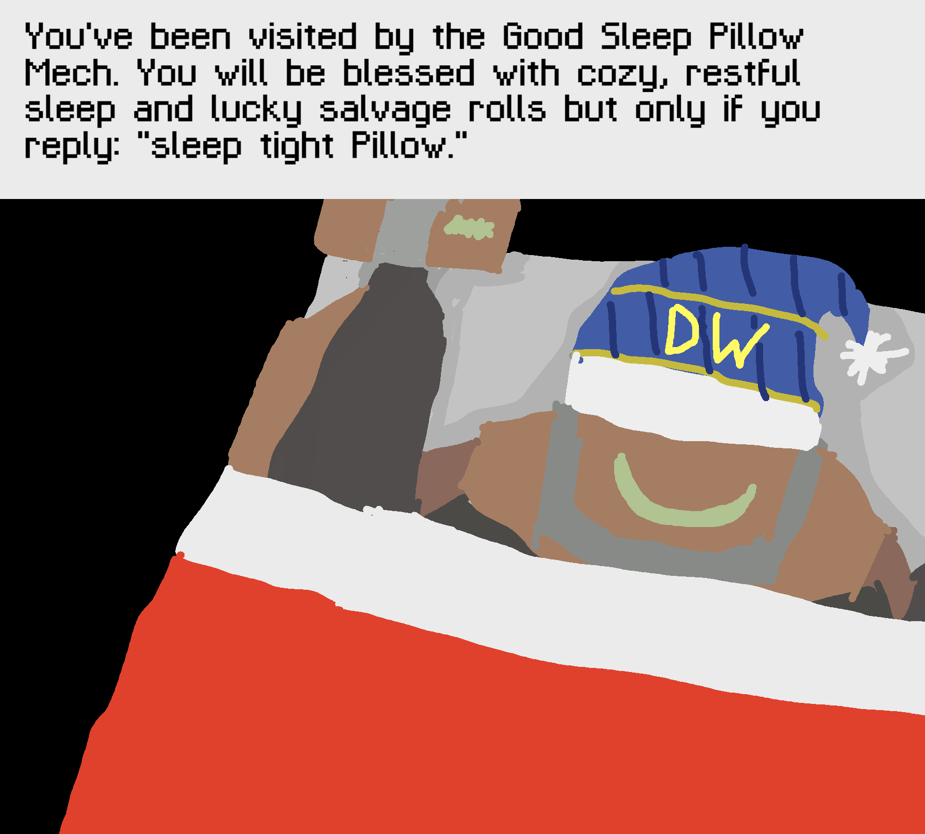 >>6391740"I HAVE...TWELVE POINT FIVE METRIC TONS...OF 'TOOTHPASTE'...STORED AWAY JUST FOR THIS EXACT...MOMENT.""KEPT IT AROUND...FROM OLD JOB...GOTTA KEEP...TEETH CLEAN. DO YOU KNOW EXPENSIVE...DENTURES ARE? ENOUGH TO...BANKRUPT US."There's another pause. "IF YOUR STANDARDS...DON'T INCLUDE ME...WRONG STANDARDS." If you focus really hard on parsing the bizarre noise she made, you might've thought FAMINE just laughed. "JUST JOKING. KNOW...I"M...MUCH FOR...SOME PEOPLE. I AM CUTE AND MARKETABLE, HOWEVER.">>6391432"GOOD PLACE TO DIE...WOULD BE...IN THE ARMS OF ANOTHER." Famine whispers. "BETTER TO DIE WARM."