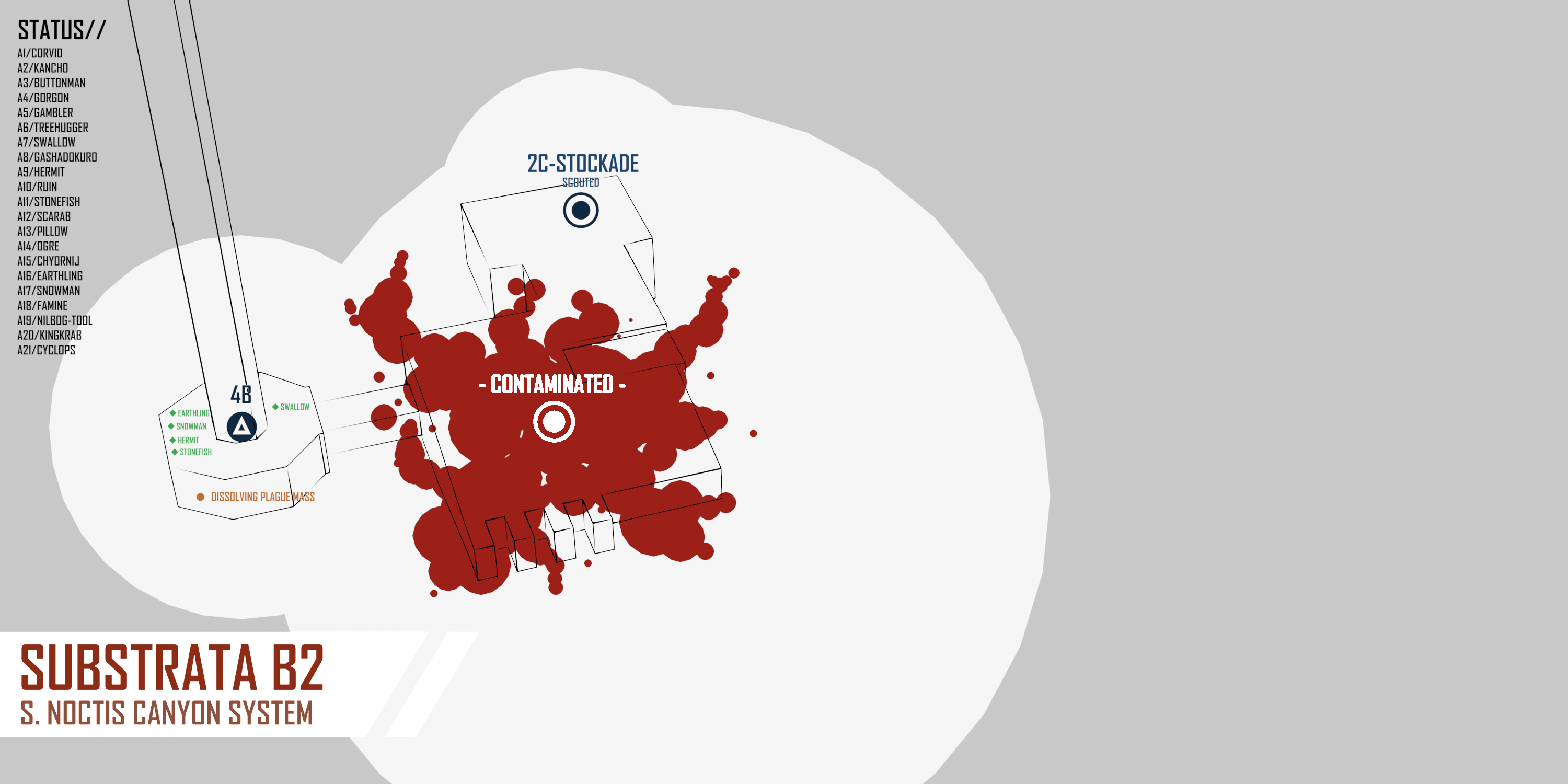 > FINAL VANGUARD. [+ CIVILIAN DEFENSE CONTRACTS]. Two of them host the briefing. One of them stares blankly, her dark eyes recessed into thin, sallow skin. The other produces a crisp smile through a mask of lab-grown plasticine."As a representative, I wish to extend our heartfelt thanks for accepting our contract and and -""There's a good bit of plague contamination throughout most of the substrata, as well as the main fabrication complex," interrupts the woman bluntly. "And the entire hub is crawling with mercenary units.""I need to get the last of the civvie staff out." She points at an orbital elevator hub. "They're holed up in a safehouse deep in the facility below the elevator spindle, waiting for a safe ascent window."She looks at the fine meshwork of burn scars covering your face and most of your neck, lingering on the faint blotch where rank markings had been acid stripped from your plug-suit."I couldn't find anything on your mercenary company before you took this contract."You manage a faint smile. <Perhaps we were not mercenaries before all this commotion.>//DROP TIMING:> DAY. [+ MERCENARIES / - PLAGUE]> NIGHT. [- MERCENARIES / + PLAGUE][A SCHEMATIC of the operational area is provided below. Areas with MILD/MODERATE PLAGUE CONTAMINATION are marked in YELLOW and RED respectively. There are additional SUB-OBJECTIVES and AREAS OF INTEREST, some of which will be revealed during active exploration. These can be pursued for additional rewards.]