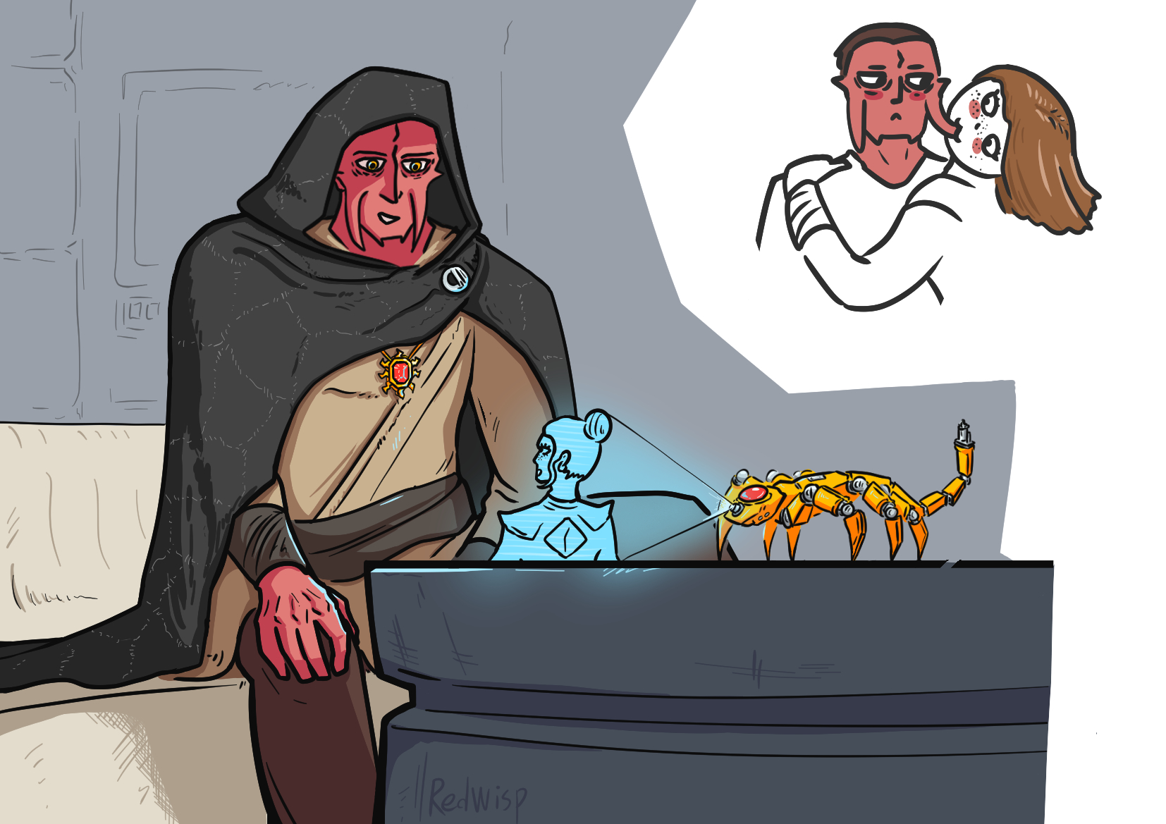 Your large, central, rubied eye watches the human-shaped droid, studying the figure with an intense focus. He is a large one, an unholy chimaera between a battledroid and an assassin bot. A thick torso, heavy with armour shielding his heart, strong arms conceal stowed blasters. It, being the last presence in the room, fulfils its duty. Alone, the robot’s eyes gaze into the screens without blinking, watching for anything of note while his fleshy companions are checking out the security alert. Vulfstahn is just lucky your synthetic brother was not at the desk during his affliction, otherwise the droid would have caught what these inept organics missed. Despite his imposing build, you think you could still kill him. All you need to do is dig your fangs into his neck and unleash a torrent of electricity, frying his circuits. But as with all things, there is nothing certain. You could make a mistake and miss his vital wires. Also, leaving his body behind would only further raise suspicions. No, you will leave him alive, for now. Instead, you will send him a false message telling him to come to his dolts for masters, leaving you alone to conduct your business.A fabricated message is produced by an antenna hidden beneath your outer shell; it contains sender codes that you’ve ascertained belong to the security forces. If they were competent, they would have revolving codes that change with every passing second, but with all the Sith housed in this compound, security wasn’t given the proper care it deserved. You see the logic, but find it lacking; these are the future of the Sith. Eyes need to be on them constantly; if an assassin waltzed in here and added some slow-acting nerve agent to the air system, you’d be down an entire cohort. Nerve agents are great, your master should really consider trying to acquire some, an excellent method to kill fellow force users.The sitting figure rises to his feet and marches one step after another until he leaves through the doors which shut behind him, leaving the centre utterly defenceless. Uncurling your body, you extend your thin legs and crawl out of your hiding spot. Reaching the open floor, you leap like an alien predator onto the control panel. On the screen in front, both the humans and the droid are still moving away from this bunker. You have enough time to do your work and get out before you are spotted.