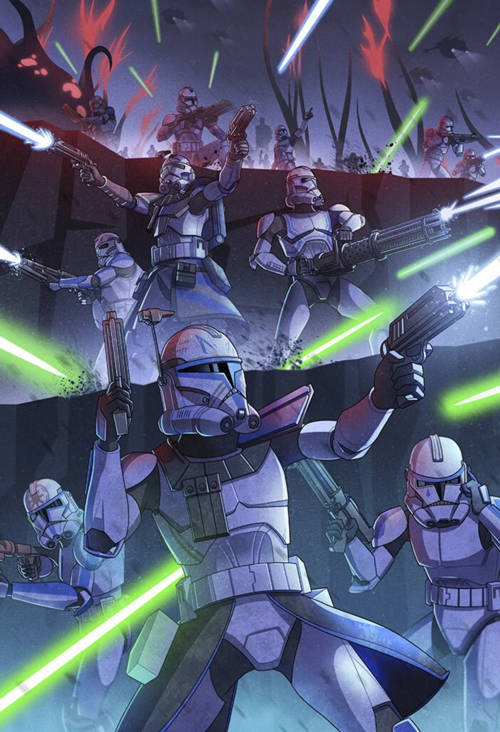 You stand in a world engulfed in war. Munitions screech overhead as they race to add to the ever-growing blood toll extracted from the two at war armies. The sky is poised with thick black-brown smoke that flows like heavy ink, strangling the orbited star’s already weak light. Rolling hills that were once fields of sparse crops are now dead. Choked of sunlight, the once resistant plants are withered, even their native adaptation isn’t enough to save them in this world of death. Excavation sites that bore into the dirt pock the land as far as your eyes can see. Some craters are small, others are large enough to house an entire star destroyer, all caused by an array of different explosives from repeated pummelling of the earth.Bodies new and old lay scattered across the battlefield, resting eternally as they are slowly being swallowed by their perpetual resting spots. Some are nought but skeletons with shredded fabric; other, newer corpses are festering from exposure to the elements. Insects have are using the unfortunate cadavers of once young men as their home and a glutinous feast. They feast upon rotting meat, burrowing deep inside the once-living being and lay their eggs within. There are even those who look like men who are stuck in a deep slumber, if not for their slack faces and vacant eyes. A remnant of a tank is corroded with rust, and its turret is long gone, taken by the detonation of the ammo held within the hull. There is no chance the crew could have survived such an explosion. Small fragments carve thumb-sized wounds into the decaying metal, and scorch marks pock the vessel, but neither of those wounds slew the mighty war machine. A foot-wide circle has been carved through the armour by a beam weapon. Next to the tracks are now dead soldiers, slain by your Lightsaber. They used the tank as a shelter, as they tried to advance through the storm of steel. The planet breathes and the air around you oscillates with it. It strokes at you with a deep sorrow, trying to console the living when faced with so much death. A troop ship appears, no longer hidden by the curvature of the planet, and it angrily races towards you, bringing with it a hive of missiles under each of its wings. Two cannons sit on the craft’s nose; they are equipped with belts that feed explosive anti-personnel rounds into the barrels. The chain cannons begin to spin, preparing the mechanism to spew a torrent of murderous rounds. You and the men you led on this advance dive to the floor, behind the wreck of the tank, in a desperate attempt to find some safety from the bird of prey.
