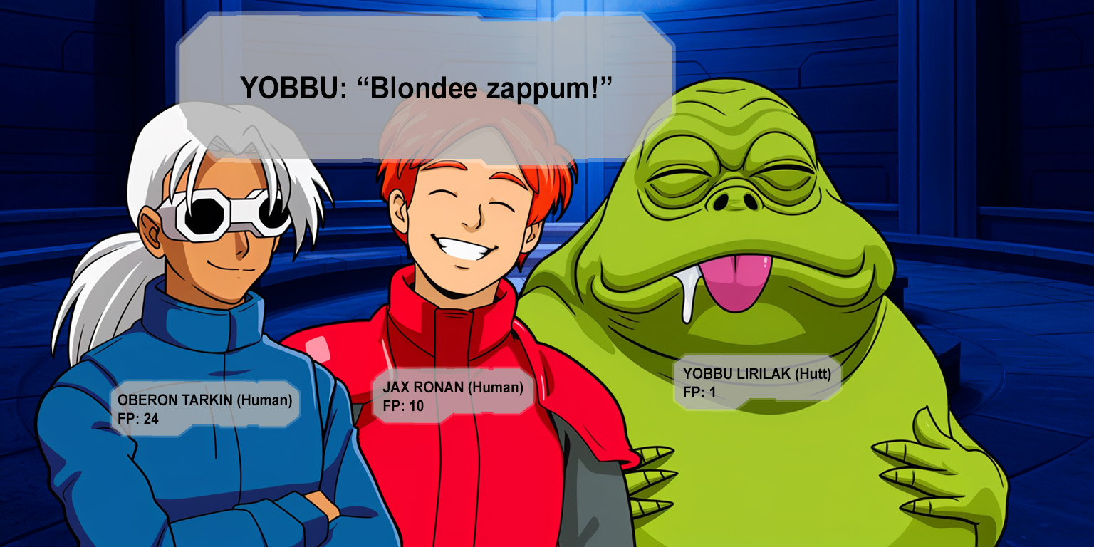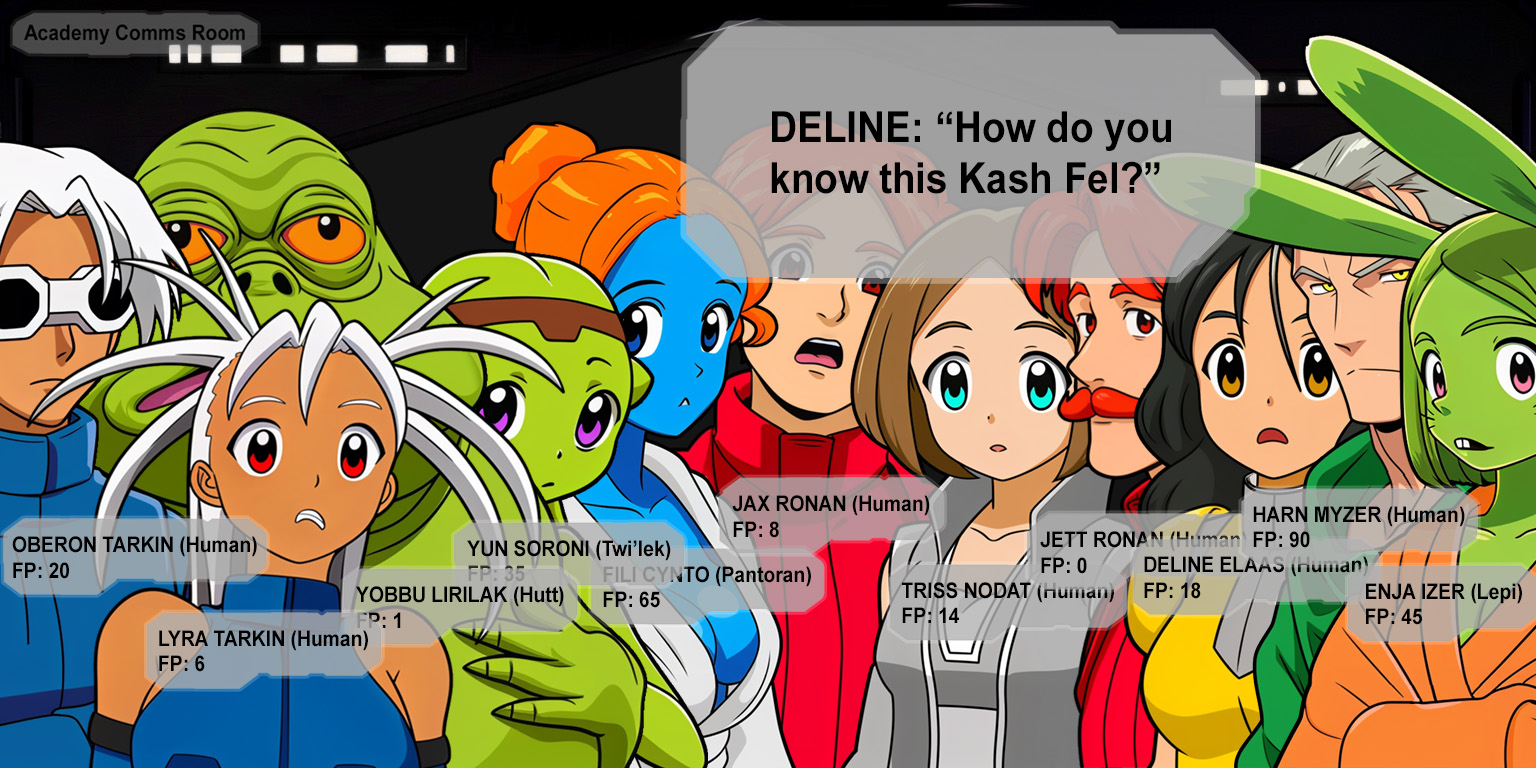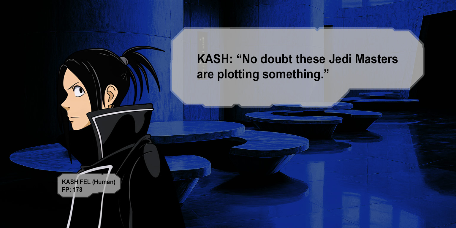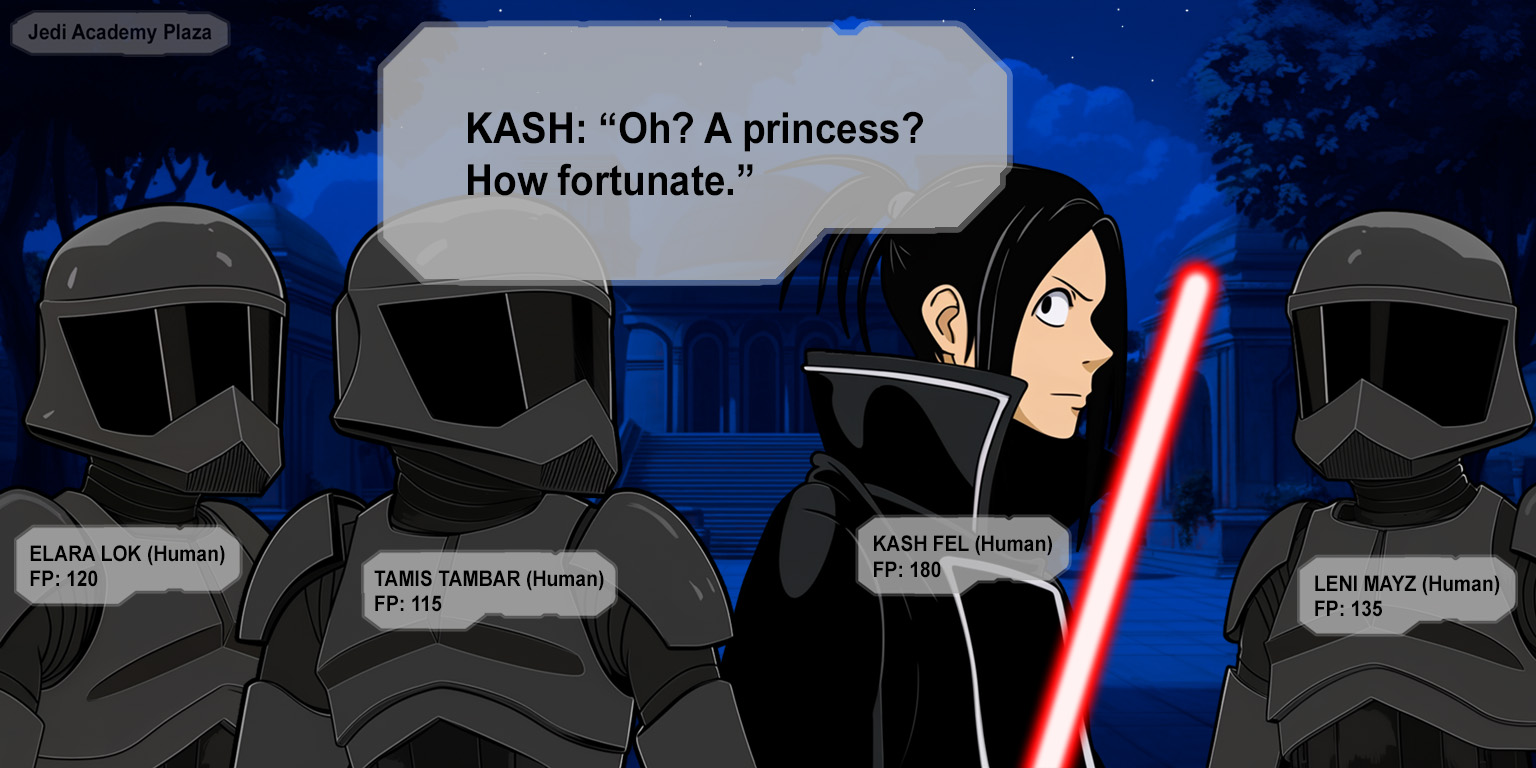Kash ignites a blue lightsaber in his other hand. "Those who claim to rule must be willing to stain themselves."I never claimed to rule! How did a capture target turn into a death flag?! And what's with these lines?Jax and Deline step in front of Kash and then Jett raises one hand. "Princess Cady has no claim to Amantes. If you're looking for someone to fight, it's me.""Dad, no!" Jax takes another step toward Kash. "Call off your ship.""An old man with a blaster?" Kash sneers at Jett and then glances toward Jax and looks at Cady again. "I will allow this princess the honor of a duel. She is the only one with status fit to stand before me."Why does everyone want to duel me?!Cady glances at Jax's nametag and then at Deline and Harn.Jax still only has 8 Force points? And Deline hasn't recovered much either! And Harn only has 90? It's because everyone is still recovering from fighting Jorma Gon and that droid. This is the worst possible time for a second battle! What kind of game balance is this? Kash has twice as many Force points as Harn does right now!Cady glances at Kash as he steps closer to Harn and the others.Kash is the kind of person who only respects a show of force, right?Fili and Enja move alongside Harn to shield Cady and the other students. As they do, their nametags shift to their backs to stay in Cady's view.If they get in a lightsaber fight with Kash and his guards, at least one of them will probably be killed! The fight with Jorma Gon and his droid could have gone a lot worse, and everyone started that fight with all their Force points!Cady glances at her status window.I'm still completely out of Force points?! Even if I used my Duet ability to siphon Force points from Jax, I still wouldn't have enough.(She called it 'vampirism' a little while ago.)Cady meets Kash's gaze again and when she looks away she sees Yun hidden behind Yobbu.Yun can defeat Master Harn in a lightsaber fight while pretending Yobbu is fighting because she has 6x efficiency... and right now she has 35 Force points? Wouldn't she be able to defeat Kash?Cady glances at Kash and back to the Twi'lek girl standing behind the Hutt.But if something goes wrong, I don't want to be responsible for creating a death flag for Yun!"Enough talk." Cady turns at the sound of Kash's voice and gasps when they make eye contact and then Kash grins at her. "Face me, princess to prince. I offer you this one chance to defend this world from my rule. Defeat me, and I will obey you."Fili slowly tilts her head toward Cady with her eyes still fixed on Kash. "Cady, don't be foolish!"Cady looks past Fili's shoulder at Kash and then she swallows again.I don't want any death flags for my friends, but I don't want to die either!>I accept your challenge!>D-doesn't Mighty Yobbu outrank me?>Maybe we should just let him win...