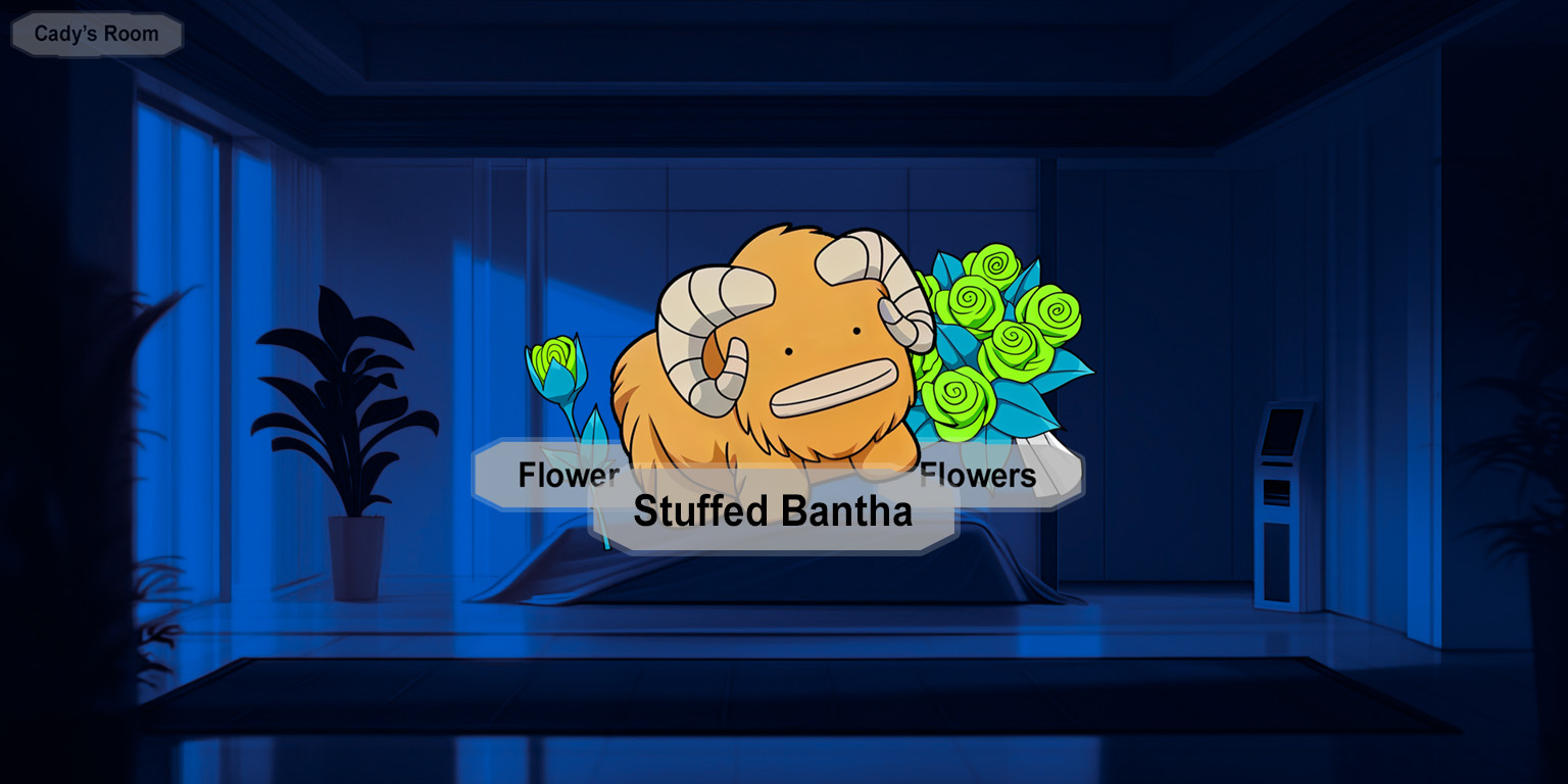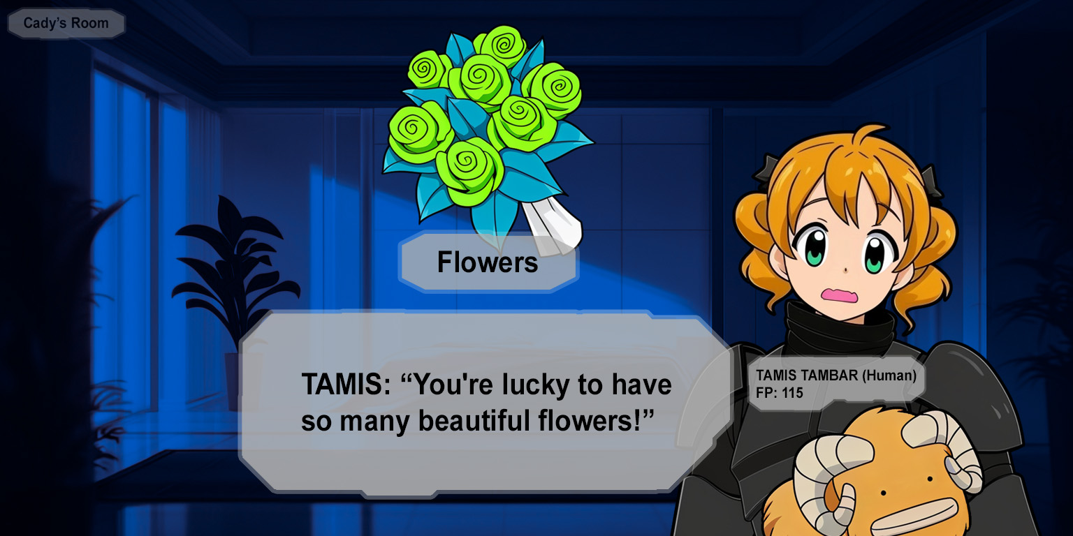 "There are a lot of boys here, huh?" Tamis looks from side to side at the other doors along the hallway as they approach Cady's room. "The only boy we ever see in the royal palace is Lord Fel." When they get to Cady's room and the door slides open, Tamis looks past Cady into the room. "So this is your room?" Suddenly her eyes widen. "Oh!"Cady follows Tamis's gaze to the bouquet of flowers sitting on the bed."No fair! Why do you get so many flowers?" Tamis looks over Cady's other shoulder. "Even the wrapping is pretty!"Cady walks to the bed and scoops up the bouquet and sniffs it as she glances back toward the doorway.Where did these flowers come from? Is this another date gift?"There's something in your bed!" Cady looks at Tamis standing next to her as the other girl points at the lump near Cady's pillow.She just walked in!Tamis grabs the edge of the blanket and whisks it back and then gasps and picks up the stuffed bantha. "Eeee!"Does she just not understand boundaries or what?!Tamis buries her face in the stuffed bantha and then moves it aside enough to notice Ren's flower in the drinking cup on a shelf. "On, how pretty!" Tamis lowers the stuffed bantha and smiles at Cady. "You're lucky to have so many beautiful flowers! I wish I could stay in this room forever!"Is she really just a girly-girl when it comes to this kind of thing? Can I use this to my advantage somehow?"I have to go." Tamis carefully sets the stuffed bantha back on Cady's bed. "I suppose I should lock you in.""Wait, wait, wait!" Cady holds up her palms at Tamis and glances at the doorway. "Kash- I mean, Lord Fel didn't say to lock me in my room, right?"Tamis puts one finger on her mouth and looks up at the ceiling. "Um... I guess that's true. Alright, I guess your door can stay unlocked."Is she always this easygoing?Tamis steps into the doorway and then stops and looks up at the ceiling again. "How many rooms do you think are in this building?""Um...""There are a lot of rooms in the royal palace where I'm from." Tamis steps out of the doorway into the hall and the door starts to slide closed but then she turns and leans back inside the room. "It was a long flight from our planet to here."She's like a little kid that doesn't want to go to bed! Tamis holds her hands behind her and rocks on both heels. "Did that stuffed bantha cost a lot of credits?"Cady pokes her head past Tamis into the empty hallway and then grins at the other girl. "Um..."I might have to deal with a death flag if Deline finds out about the stuffed bantha or this bouquet of flowers! But...Cady looks at the gray armor and then back at Tamis grinning at her.Is this girl just super nice or what?>You can come back later!>Are you hungry now?>Please don't ever mention the stuffed bantha... or the flowers...