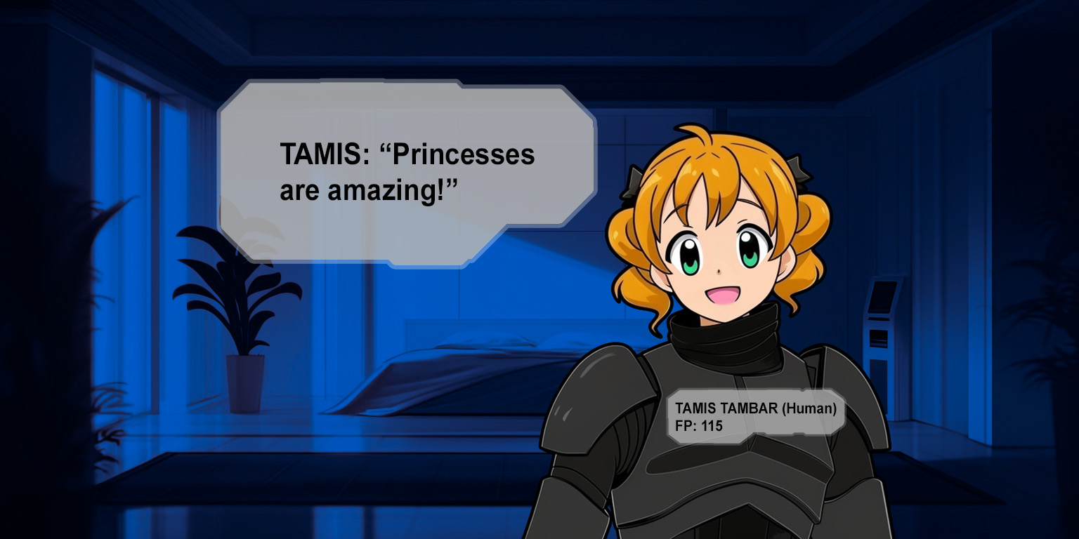 "Coming!" Cady waves toward an alcove and whispers. "Everyone hide!"Triss and Deline crowd against the back of the alcove as Lyra squeezes between them and Cady hurries toward the door.The door slides open to Tamis looking up at the ceiling but then she tilts her head back down and grins. "Princess Omega!""Hi, Tamis!" Cady grins. "Is there something I can do for you?""Huh?" Tamis blinks. "Oh, I wanted to thank you for the delicious cake! The droids never made sweet meals like that!"What kind of weird cooking droids do they have on Kash's home planet?"I'm glad you liked it so m-"Suddenly Lyra stumbles and yelps as she steps into sight.She completely blew her cover!"Oh, you're having guests!" Tamis smiles at Lyra.Does she not care about this?Cady steps next to Lyra in front of the alcove. "This is Lyra Tarkin.""H-Hello!" Lyra glances at the alcove behind her and wipes her cheek."You live here, don't you?" Tamis smiles at Lyra again. "This seems like a nice place. The boys here are cute."Lyra giggles nervously. "Which boy do you think is the cutest?""Um..." Tamis wraps a lock of hair around her finger and smiles at Lyra again. "That boy with the optics and long white hair was kind of cute.Lyra's fists clench against her thighs. "O-"Suddenly a crackle of static from the helmet at Tamis's side makes Lyra pause and then they hear Leni's voice."Tamis, report in. Tamis?""I'm here!" Tamis fumbles to hold the open bottom of her helmet up in front of her face. "I'm here.""Where are you?"Tamis shifts the helmet away from her face and beams a smile at Cady. "I'm in Princess Omega's room!""What's going on in there?"Tamis tilts her head. "Princess Omega is having guests!""What are... never mind. Resume your rounds." The communicator clicks and goes silent."Um..." Tamis tilts one boot up on tiptoe and wobbles her heel back and forth. "I have to go."Lyra waves. "It was nice to meet you!""Yeah!" Tamis smiles at Lyra and then looks at the door and looks at Cady again. "I have to go."She's high-level at dragging out goodbyes!Tamis looks around the room again and then waves and steps out the doorway. Just as it's closing she starts to turn her head back toward Cady but then the door separates them.Triss exhales as Deline peeks out from the alcove corner and then Deline steps out. "Did she see us?""Um..." Cady glances toward the door.Does it even matter with Tamis?Lyra crosses her arms in front of her chest and looks at Deline. "If we're not going to steal Kash Fel's shuttle, what are we supposed to do?"Behind Lyra, Triss steps out from the alcove and smiles at Cady. "Maybe Cady will win the duel!""Triss!" Deline tilts her head toward the other girl. "Princess Cady might be in danger if we wait to act!"She really doesn't think I stand a chance!>I think Tamis can help us!>Why don't we get some sleep?>I wonder what the boys are doing...