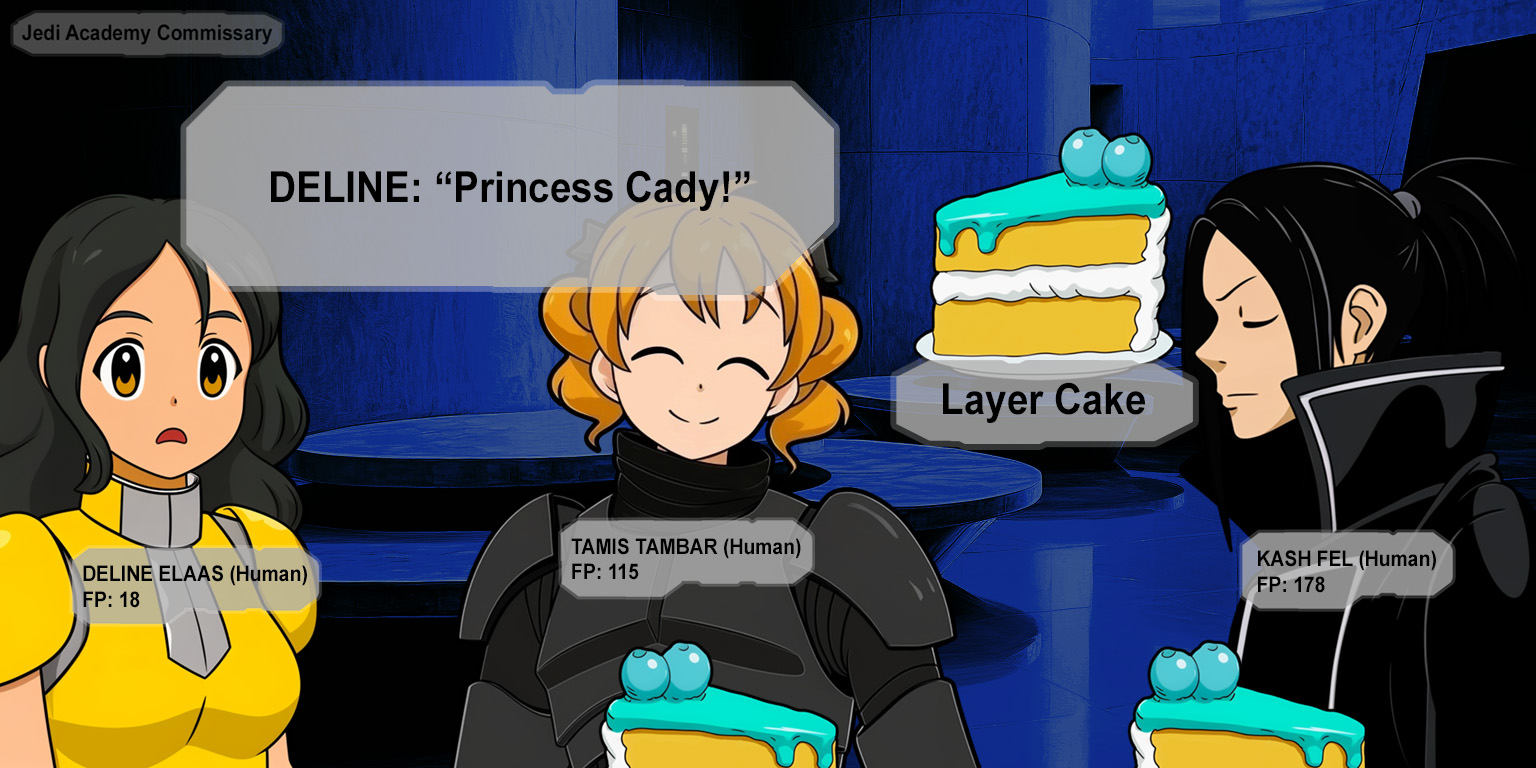 "Oh?" Kash glances toward the mollinfruit."But-" Cady flinches when Kash's eyes flick back to her. "Y-you're not allowed to watch." When Kash remains still, Cady blinks and looks away and then shuffles toward the drawer of yargle eggs.She reaches up to a large bowl from a shelf above her head but then she glances at Kash behind her and the bowl tips past her fingertips and clatters to the ground. She lurches down to grab it as the sound echoes around the kitchen and then she glances up at Kash smirking down at her. Cady quickly stands back up and takes one of the yargle eggs out of the drawer and cracks it against the edge of the bowl when suddenly her palm is filled with sticky yolk dripping onto the counter.My Meal Preparation skill only works if I concentrate!(It took longer than it would have without using the Meal Preparation skill.)When Cady is finally finished she wipes the sweat off her forehead with the back of her hand and then wipes it against her side as she shakes the messy hair out of her eyes. She tilts her head and glances at Kash standing behind her and then she holds up the platter of a wide cake covered in two colors of frosting and ringed with teal spheres.It's done! A heavy layer cake that's not only sweet and tart but also filling!Tamis is bouncing up and down as Cady carries the cake through the kitchen doorway. The other girl leans in to watch Cady cut it and then Tamis giggles as she raises the first bite to her mouth and squeals in delight.Suddenly the door slides open and Deline gasps. "Princess Cady!" Deline glares at Kash, one hand already on her lightsaber hilt. "What did you do to her?"Cady blinks. "Guh?"(She has no idea how messy she looks.)Kash holds out a hand toward the cake. "The princess chose to prepare this treat."Deline glances at the cake and then glares toward Kash and Tamis but then she looks at the cake again.She's already starting to drool!The door slides open again as Elara and Leni crowd through together and then Leni shouts "My lord!" "The prisoners are-" Elara stops as the door slides open and Harn steps in with Fili and Enja behind him.The other students crowd around the doorway from the hall outside and then Lyra's head squeezes out from under Oberon's arm. "We heard Kash Fel let you out of your room!"Jax pushes past Oberon. "Cady, are you alright?""I wasn't-" Cady glances at Kash and holds up a thin slice of cake on a plate. "I mean... I made enough cake for everyone!"When Cady finishes handing out slices, she grins at the slice on her plate and then looks up at the students and Jedi Masters all silently eating their cake as they glare across the room at Kash and his guards.This is an extremely hostile atmosphere for eating cake!Kash catches Cady looking at him and she quickly glances away.>Maybe I'll make another meal tomorrow morning!>What kind of foods do you like?>Maybe I should try the café scene with Kash...