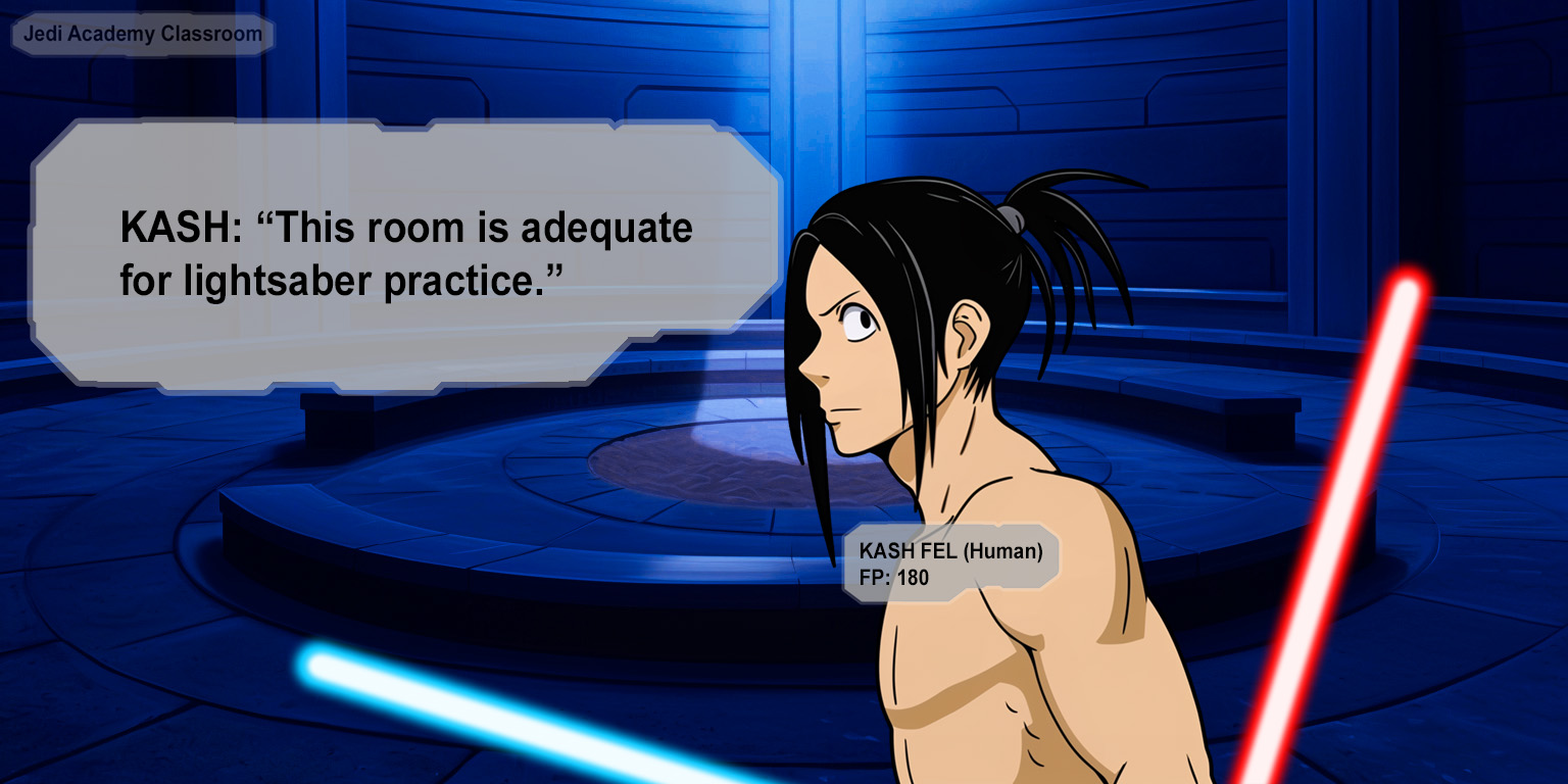 If things don't work out with Tamis, I might really need to rely on my Meal Preparation skill to get past this death flag! What am I supposed to make Kash that's going to compare to him chasing down a wild monster? All I can think of is yargle egg omelettes!A pacing sound catches Cady's attention and she stops and turns her head.Was that footsteps? It sounded like it came from the classroom! Maybe this will be easier than I thought!Cady turns and hurries back down the main hallway and into the moonlit classroom but then she stops and looks around as she turns in a slow circle.I definitely heard-suddenly a red lightsaber ignites next to Cady and the glowing red blade buzzes in front of her. She squeaks in fright and takes a step back when a blue lightsaber ignites along her other side. Cady squeaks again and stands motionless with her eyes squeezed shut and then she hears Kash's voice."This room is adequate for lightsaber practice.""Um..." Cady starts to open her eyes and squeezes them shut again. "I'm... I was..." She turns around to face Kash and peeks her eyes open and then her eyes widen as her nose bumps against Kash's bare chest and she jumps back. "Aaaah!""As I wished, the princess has come to spar with me."Cady glances down and looks away but then she looks at Kash's navel again.He's completely shredded! Are those abs real or is this some kind of hologram?! That's at least an eight-pack! It's like two rows of delicious pastries! I can't look away! Am I really allowed to be seeing this? L+L is only rated T!Cady blinks and glances at her status window.I still haven't recovered any Force points! Lightsaber fights with Kash are probably death flags, even if he does say it's just sparring! Maybe I should... maybe I should..."The princess is invited to choose her opening stance."(She was staring at his abs again.)The sound of lightsaber blades waving through the air startles Cady into looking up and she yelps as Kash draws back both his lightsabers to attack.>I have to go!>Can I just watch?>If this is the last thing I see...