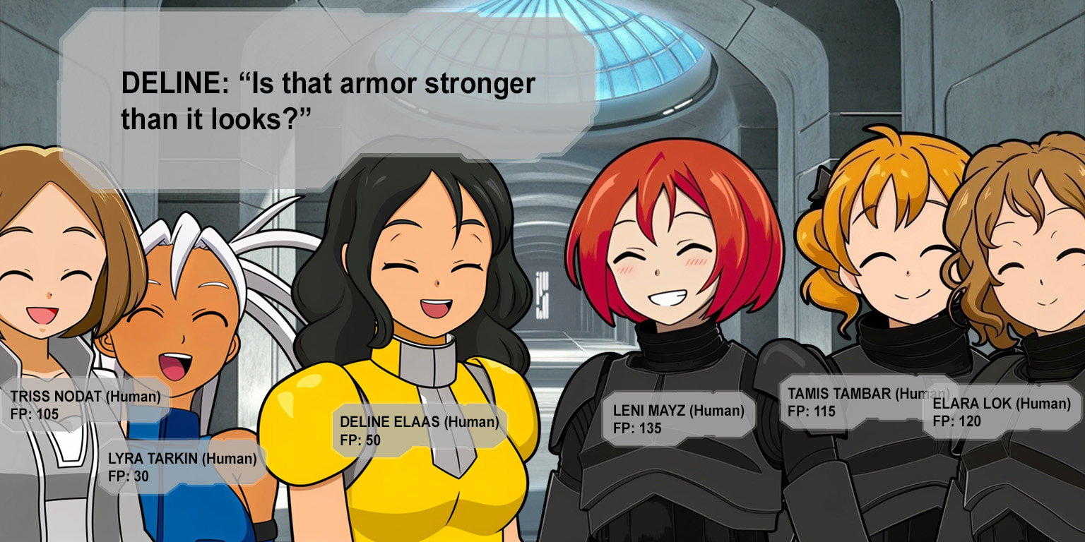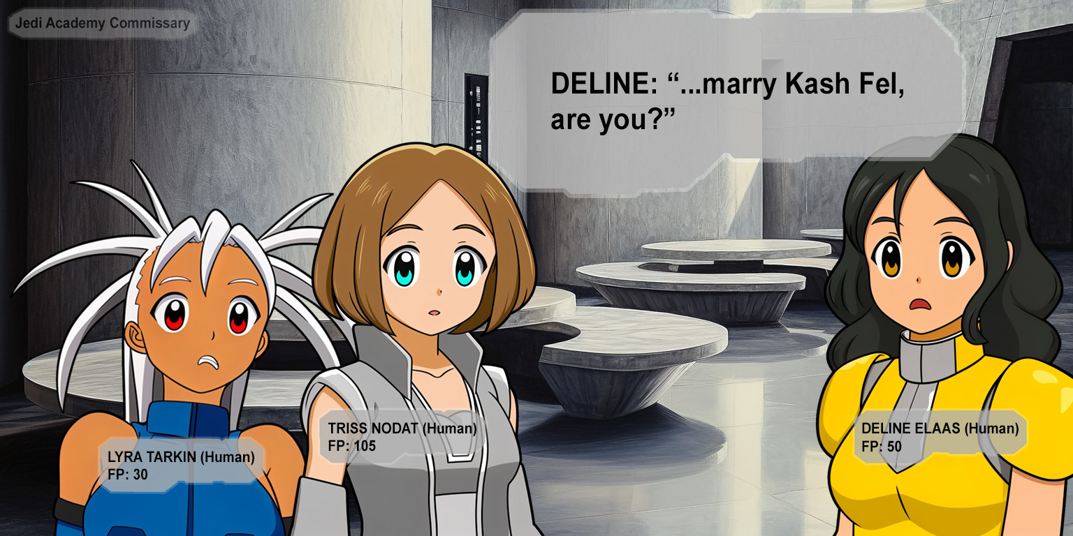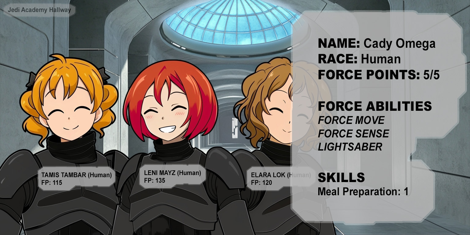 Cady presses her back against the doorway and slaps at the blinking panel until her door slides closed. "I need to get to the commissary and make breakfast!"Elara, Leni, and Tamis all nod. "We'll come with you!"Was that rehearsed!?"Princess Cady!"This is going to be trouble!"Good morning, Deline!" Cady turns and smiles at Deline across the hall.She recovered all her Force points! That's good news for us!Cady gestures down the hall past the three other girls. "Um... we're going to the-""I'll come with you!" Deline steps back inside her doorway. "Let me grab my blaster!"Cady holds both her palms up next to her face. "No blasters!"I can sense the death flags popping up all over the place right now!A door slides open and Lyra pokes her head out of her room and joins Cady. As they all turn the corner Triss steps out from the basement alcove and grins at Cady and Lyra but then it falters for a second as she sees the other three girls.Cady walks up the hall with Leni, Tamis, and Elara on one side of her and Deline on the other. As they near the commissary, Cady glances between Deline and Leni.This isn't so bad! Maybe I was worried about n-"Hey, your name is Leni, right?" Deline gives Leni a cheery smile. "Is that armor stronger than it looks?"That could have been phrased better!"Deline, was it?" Leni tilts her head and smiles back at Deline. "You're quite brave to walk around without your helmet."That seems needlessly provocational!Deline giggles. "Oh, I'm sure I'll be fine, even without my helmet."That's practically inviting a challenge!Leni and Deline both giggle and smile at one another.They're cold-war catfighting! I need to diffuse this situation or the death flags will start piling up!