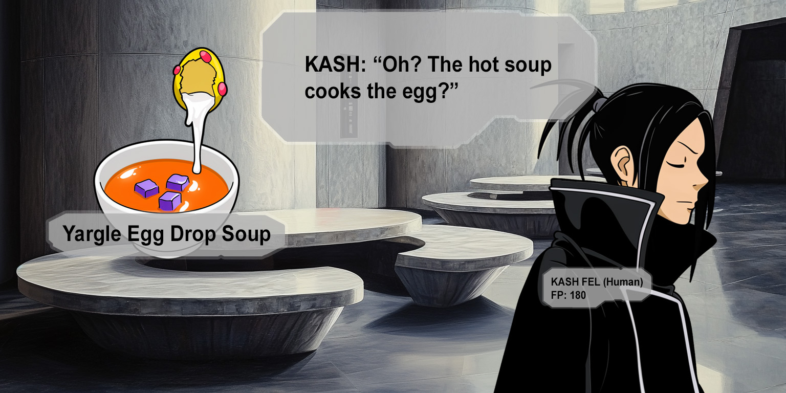 "Princess Cady!" Deline's hand is on her lightsaber hilt."The princess burned her thumb." Kash glances down at Cady. "I do not wish to see my fiancée injured.""I'm fine!" Cady takes a step forward away from Kash as he lets go of her wrist. "And everything's ready to eat!" Cady turns away from Kash and sucks her thumb and them blinks and looks at her hand and blushes.When everyone is seated, Cady passes out bowls of steaming watery soup and the yellow spotted eggs. "This is called egg drop soup!"Elara picks up her egg and runs one finger over the warty surface. "Are we supposed to eat the egg?"Leni shakes her head and puts her egg back down. "It's obviously just for decoration.""Is the soup supposed to be this hot?""Um..." Cady cracks the egg and pulls the smaller piece of shell away and then tilts it and lets the yolk run into the bowl."Oh? The hot soup cooks the egg?" Kash picks up his egg and cracks it in one hand over the bowl. What is a yargle anyway? Do I really even want to know?Cady glances at Kash as he takes his first spoonful and then quickly takes another.What's important is Kash seems to be enjoying this!Cady looks around at all the slurping noises.It seems like this is a big success!(She used up all the yargle eggs.)After everyone is finished, Cady glances around at the Jedi Masters and the other students idly scraping their spoons around the empty bowls.Everyone is waiting to see what happens between me and Kash! Well, there's nothing romantic about egg drop soup or going to class, right?Cady stands up and clears her throat. "Um... we should really get to Master Fili's cla-"Suddenly Cady feels something with an iron grip pull her upward off the floor and she looks sideways at Kash as he holds her in his arms.P-Princess-carry style?!"Eeee!" Triss and Lyra squeeze their cheeks and squeal in unison.They're not helping!Kash pivots with a swish of his long coat and then Cady's eyes widen even more as Jax plants his feet in front of Kash."Put her down!" Jax takes a step sideways and raises his index finger toward Cady. "Kash Fel, I challenge you to a duel for Cady!"Jax, what are you doing?! Your hot-blooded heroic warrior archetype is the absolute last thing this situation needs!"Oh?" Kash looks at Cady. "Does the princess wish to speak?">I don't need to be carried!>Lord Fel, would you please take me to class?>T-two hot guys fighting over me...